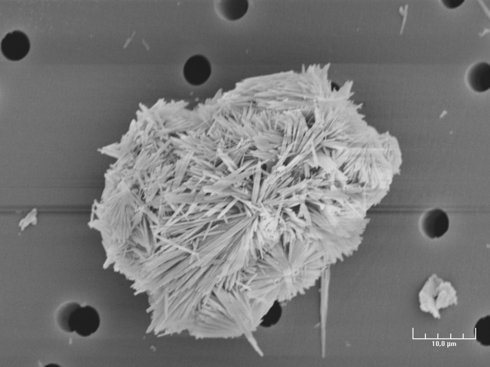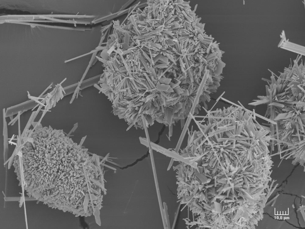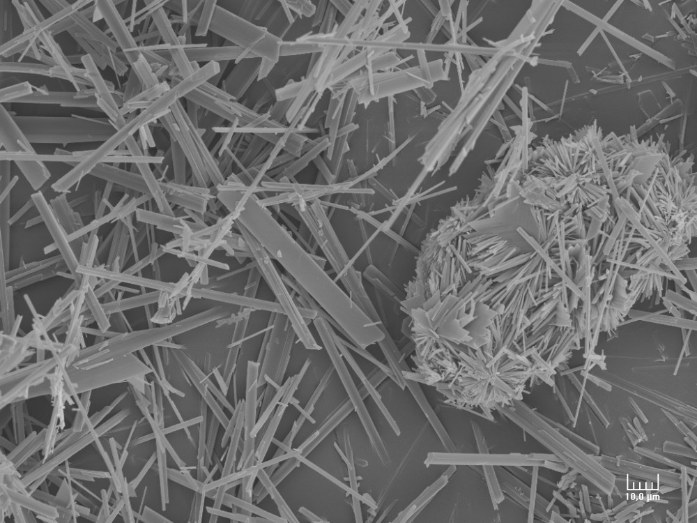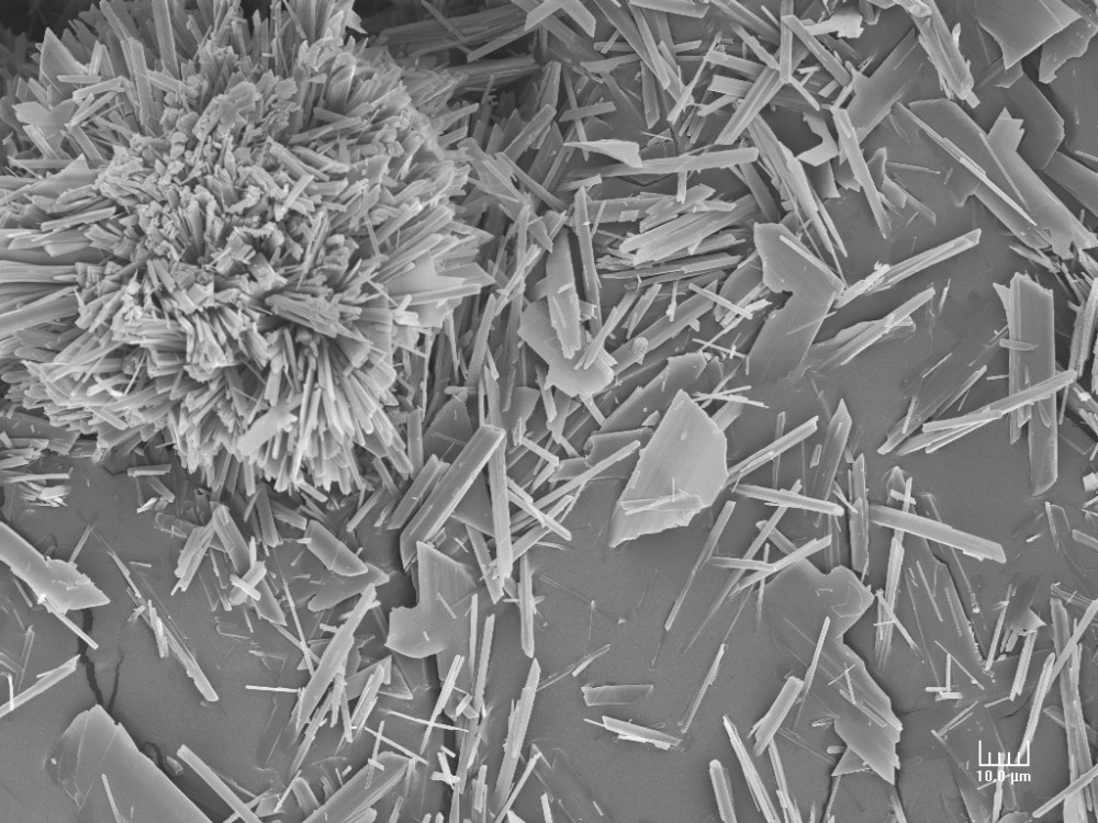 Pour changer un peu, du gypse "expérimental" obtenu au labo en diluant une suspension de calcite (en grains de 50 microns) dans une solution d'acide sulfurique dilué. La réaction démarre par une conversion (pseudomorphose) des grains de calcite en gypse, donnant ces pelotes d'épingles, dont le cœur est encore du carbonate : Elle se poursuit en cristallisant directement le gypse depuis la solution, formant les aiguilles ou des tablettes très allongées : -
