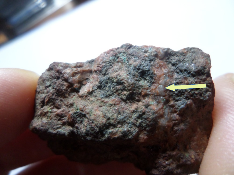 Bonjour Est-ce qu'on peut avoir un plan sur la partie fléchée, dans laquelle on verrait mieux les relations entre blanc et vert. Le matériel vert a une cassure conchoïdale, on ne voit pas de grain : matériel volcanique acide, ou un produit de son altération ?