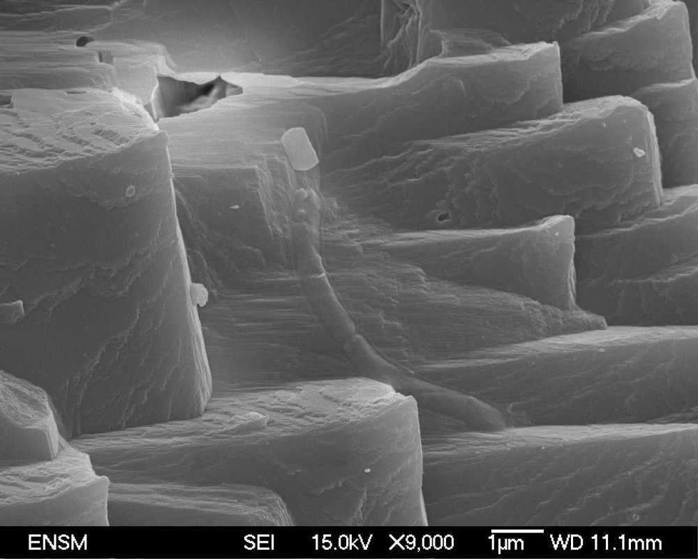 La corrosion affecte tout de suite les défauts et révèle immédiatement les joints de sous-grains. Elle commence à transformer les surfaces courbes en microfacettes séparées par des marches, et on commence à voir des etch pits (avec les formes négatives du carbonate) sur les facettes.