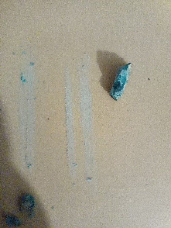Bonsoir, je viens de refaire le test de la trace sur un support plus blanc. Il me semble que ça tire plus vers le bleu que le vert comme la chrysocolles...... -