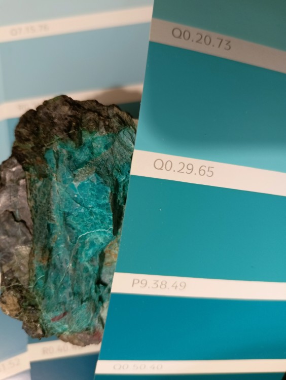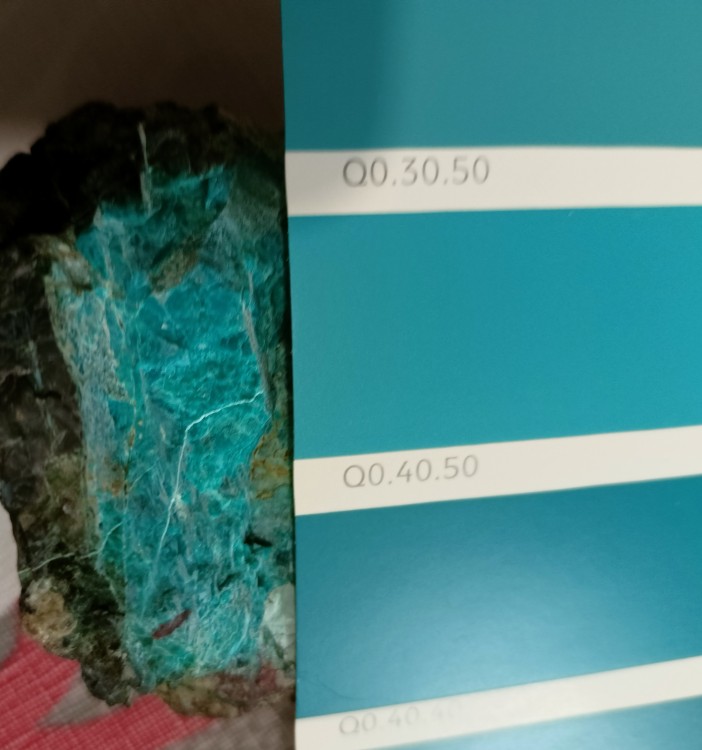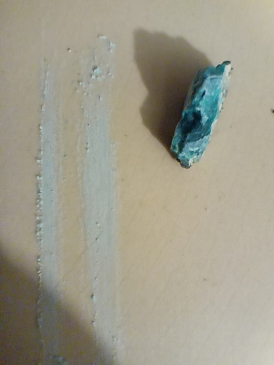 la trace est plutôt bleu pale alors que la chrysocolle serait d'un vert lumineux d'après ce que j'ai pu trouver sur le web.. .https://www.geowiki.fr/index.php?title=Liste_minéraux_par_couleur_de_trace La turquoise pourrait elle matcher? -