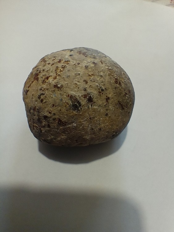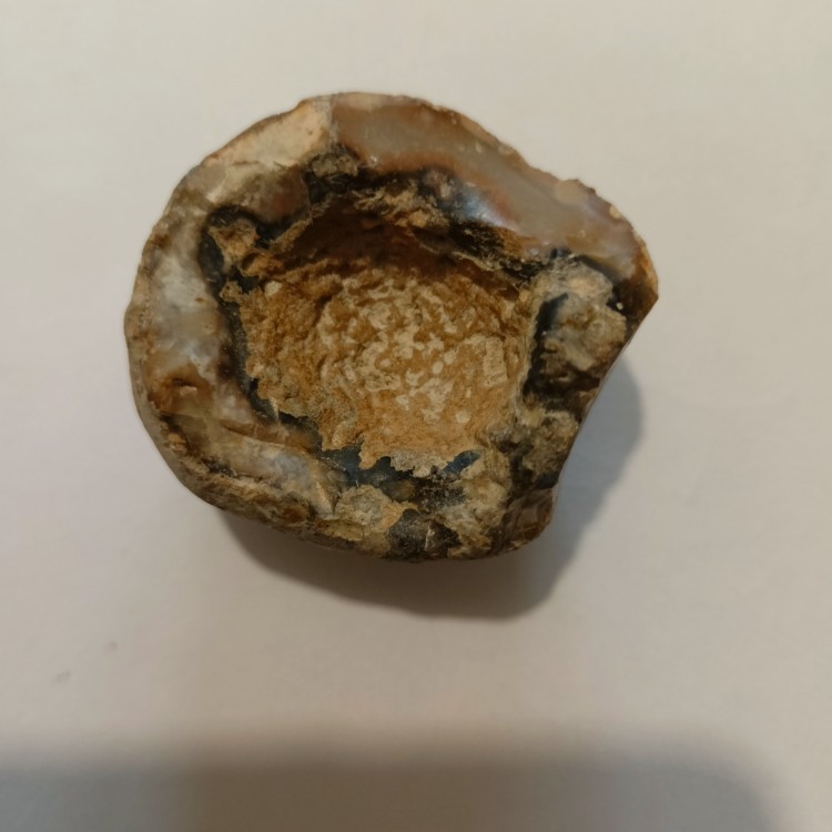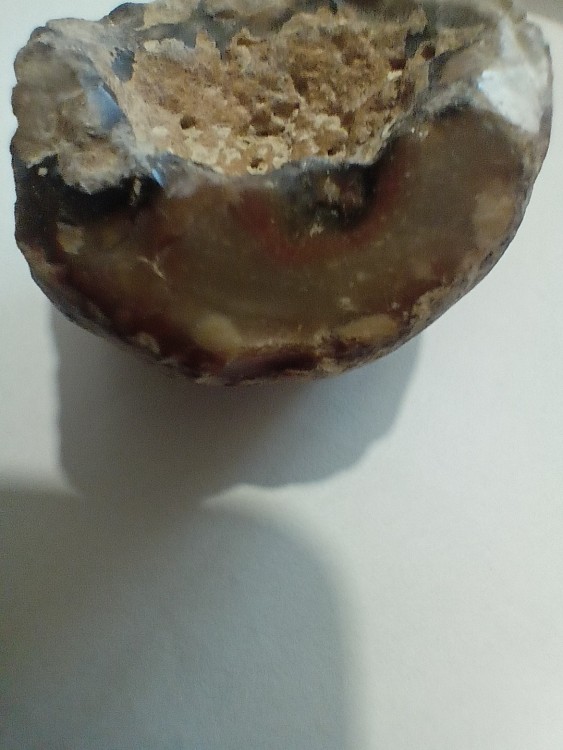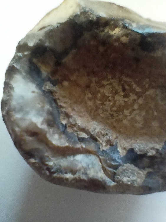 Bonjour et bonne année de trouvailles à vous tous! J'ai retrouvé cette pierre bien ronde avec une partie cassée et creuse. Il me semble qu'elle est constituée de silex ou Agathe....avec une pellicule extérieure et à l'intérieur du trou, une autre forme de minéral.... Diamètre extérieur 4/4,5 cm , intérieur trou 2cm environ. Ça fait penser à un fossile d'oeuf de tortue...qu' en pensez vous? Merci, serge -