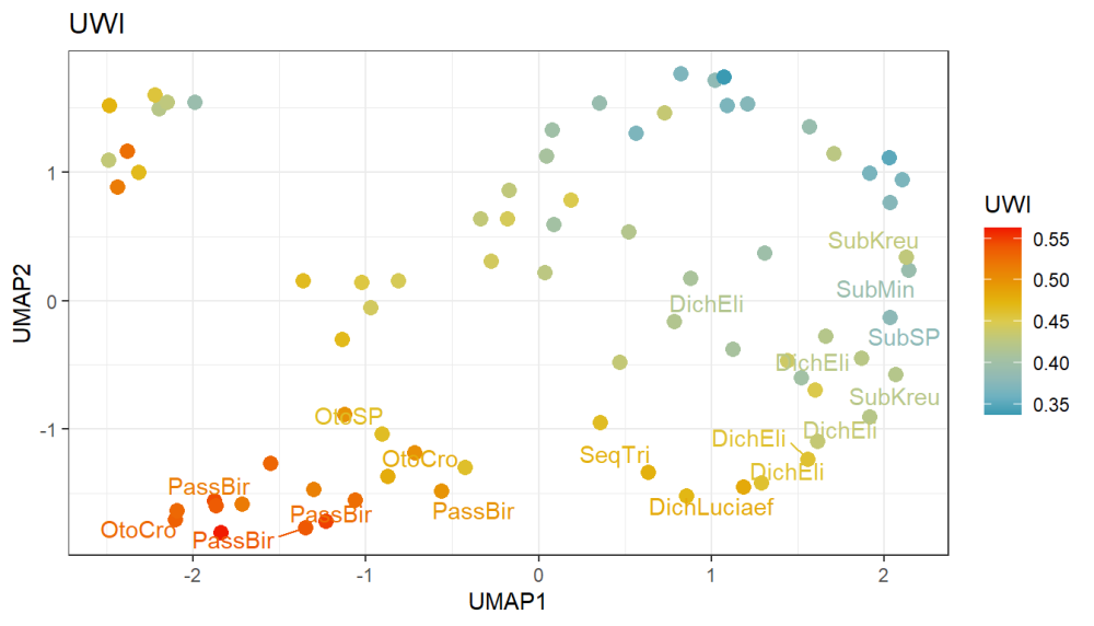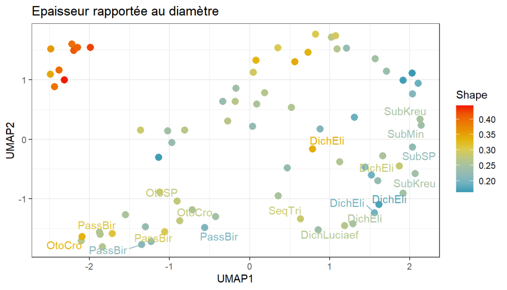 Pour toute mon analyse de données, j'ai utilisé un logiciel, R, qui est libre de droit, mais qui s'utilise en lignes de commande (il faut donc connaître le langage R). Sauf pour mesurer, j'ai pris le logiciel imageJ qui est aussi libre de droit. En fait, avant de faire une UMAP, j'ai fait une ACP (Analyse en composantes principales). Et l'ACP, c'est vraiment ce qui est important dans mon analyse. La UMAP, c'est *juste* une façon de visualiser les données (et classiquement, oui, elle est utilisée pour de très gros jeux de données, mais je trouve que ça fonctionne bien aussi avec des petits jeux). L'ACP m'a servi de base pour calculer les distances (donc le niveau de différence) entre individus et pour créer des groupes de ressemblance. La UMAP sert juste à voir de manière lisible les groupes. L'ACP, c'est une façon de simplifier les données qui se base sur les corrélations entre variables. Par exemple, dans mon jeu, il y a une très forte corrélation entre UWI, WER et WHI (qui représent tous plus ou moins l'involution). Mon ACP va "résumer" cette corrélation en créant une nouvelle dimension qui "résumera" ces trois variables. Dans mon jeu, UWI/WER/WHI explique le plus la variabilité des données : mes ammonites se différencient pas mal en fonction de l'involution. Ca va être l'axe 1, la direction dans l'espace des données où la variation est la plus importante. Et ensuite, elle varient pas mal en fonction de la taille et de l'épaisseur : ça va être l'axe 2, car en plus, y'a une corrélation négative modérée entre la taille et l'épaisseur. Moi j'ai pris les trois axes de l'ACP, qui en gros représentent l'involution, la taille et l'épaisseur. Pour représenter de manière plus "sympa" mes trois axes de l'ACP, j'ai utilisé la UMAP. La UMAP va résumer en 2D les dimensions en 3D. Voilà la représentation sur les deux premiers axes de l'ACP : Bon, ça va, c'est pas trop moche, mais je trouve la UMAP plus lisible. Et surtout, moi j'ai choisi de tenir compte du 3ème axe, et difficile de représenter des données 3D en 2D ^^. Oui, pas évident ! Pour résumer, la UMAP est un algo qui va essayer de représenter le plus fidèlement possible en 2D des distances qui sont, elles en 3D, 4D.... 50D, 70D. -
