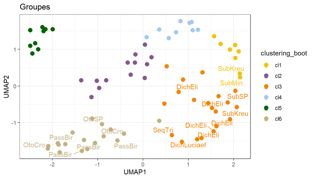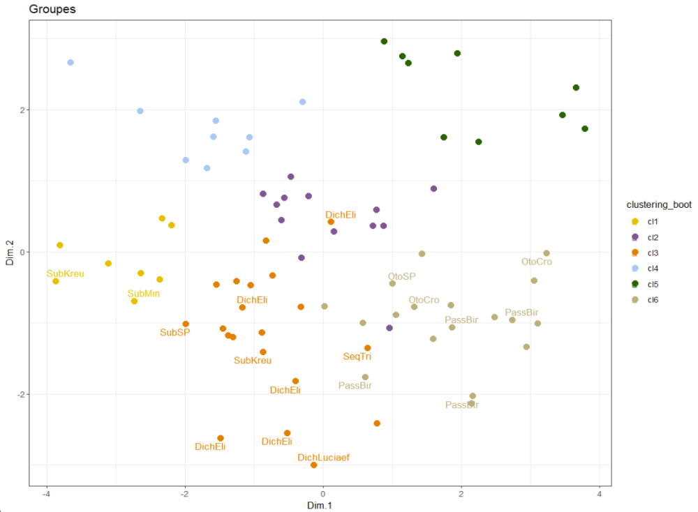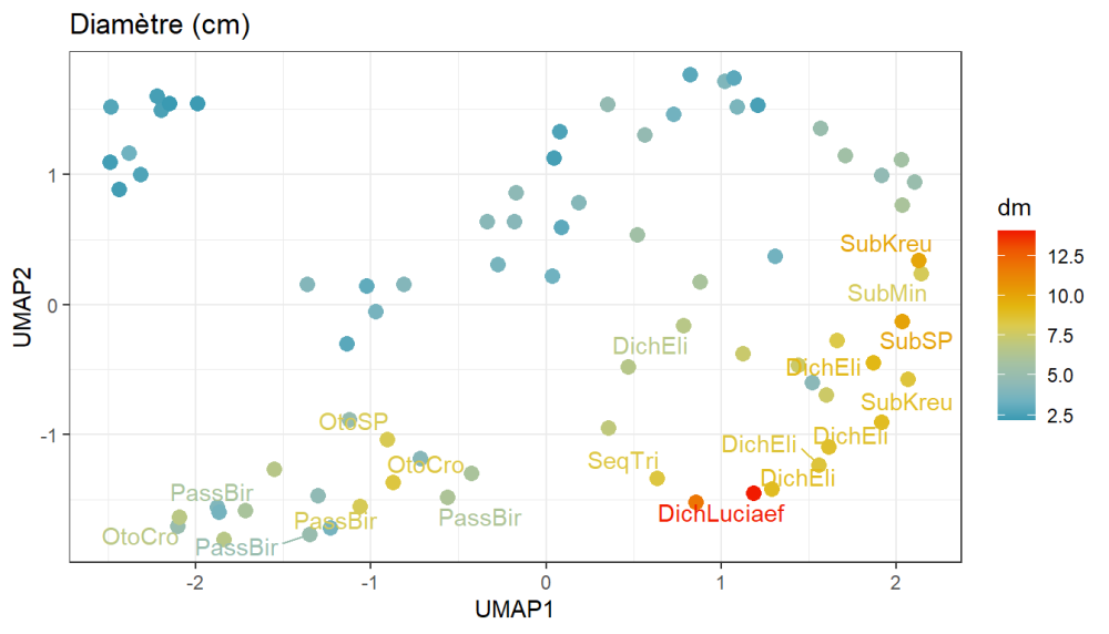 Merci @geopas pour ton explication. Je comprends mieux le souci. Et effectivement, ça donne à réfléchir... Et c'est vrai que dans mon cas, je pars de photo (en pensant peut-être garder une meilleure "traçabilité" ). Je vais peut-être passer au pied à coulisse (tu as raison, il suffit de positionner un peu différemment pour avoir des mesures différentes, donc la mesure n'est pas non plus parfaite, même si sans doute beaucoup plus précise qu'à partir de photos). A mon avis, une manière de réduire les biais est d'avoir beaucoup de données... Mais ça veut dire, beaucoup de travail en amont ! Je suis déjà à une cinquantaine d'ammonites, je me dis que c'est pas si mal... Bonne question ! J'ai effectivement des toutes petites ammonites (2-3 cm). Et d'ailleurs, je n'ai jamais su trop ce que c'était : soit des jeunes, soit des tours intérieurs. Et j'ai aussi des plus grandes (4-10 cm environ) (je crois que de manière générale, j'ai très peu d'ammonites avec la loge d'habitation, donc la plupart sont incomplètes). Les petites et les grandes se distinguent très très clairement. En gros, j'ai deux groupes de petites ammonites : des petites épaisses et des petites plus fines. Elles constituent deux groupes bien distincts. Les autres ammonites, qui font entre 4 et 10 cm environ forment un troisième groupe et c'est plus compliqué de trouver des sous-groupes. Bon, allez, je montre mes premiers résultats pour mieux montrer 🙂 C'est un graph qui résume la structure des données. En gros, ça représente la différence des ammonites. Des ammonites proches sur le graph = des ammonites se ressemblant. Les couleurs correspondent à des "groupes" (regroupement d'ammonites selon leur ressemblance) En noir, c'est des ammonites "références", c'est à dire, en gros, des photos trouvées sur Internet ou dans des publi, que j'ai pu utiliser comme réf. J'en ai pas beaucoup (et parfois, c'est pas vraiment la même époque...) mais heureusement, des gens sympas m'ont envoyé des publis avec des mesures que je peux relier à une espèce ! Donc je vais avoir plus d'ammonites références pour mes prochaines analyses. Un point assez encourageant : mes deux "Dichotomosphinctes elisabethae" références et mes deux "Passendorferia birmensdorfense" références sont relativement proches sur le graphique (même si ce n'est parfait). Y'a un "Dic" perdu (Dichotomosphinctes antecedens), mais de ce que j'ai vu, c'est une espèce morphologiquement assez différente de D. elisabathea (même si appartenant au même genre), donc c'est normal. Je pense que ça pourrait être pertinent, effectivement, de séparer les toutes petites des grandes (en tout cas, dans un deuxième temps de l'analyse), car les petites sont tellement différentes des grandes que du coup, peut-être qu'on risque de moins voir les différences au sein des grandes. @fred39: désolée, j'ai pas encore inclus tes ammonites dans mon analyse ! mais bientôt 🙂 -