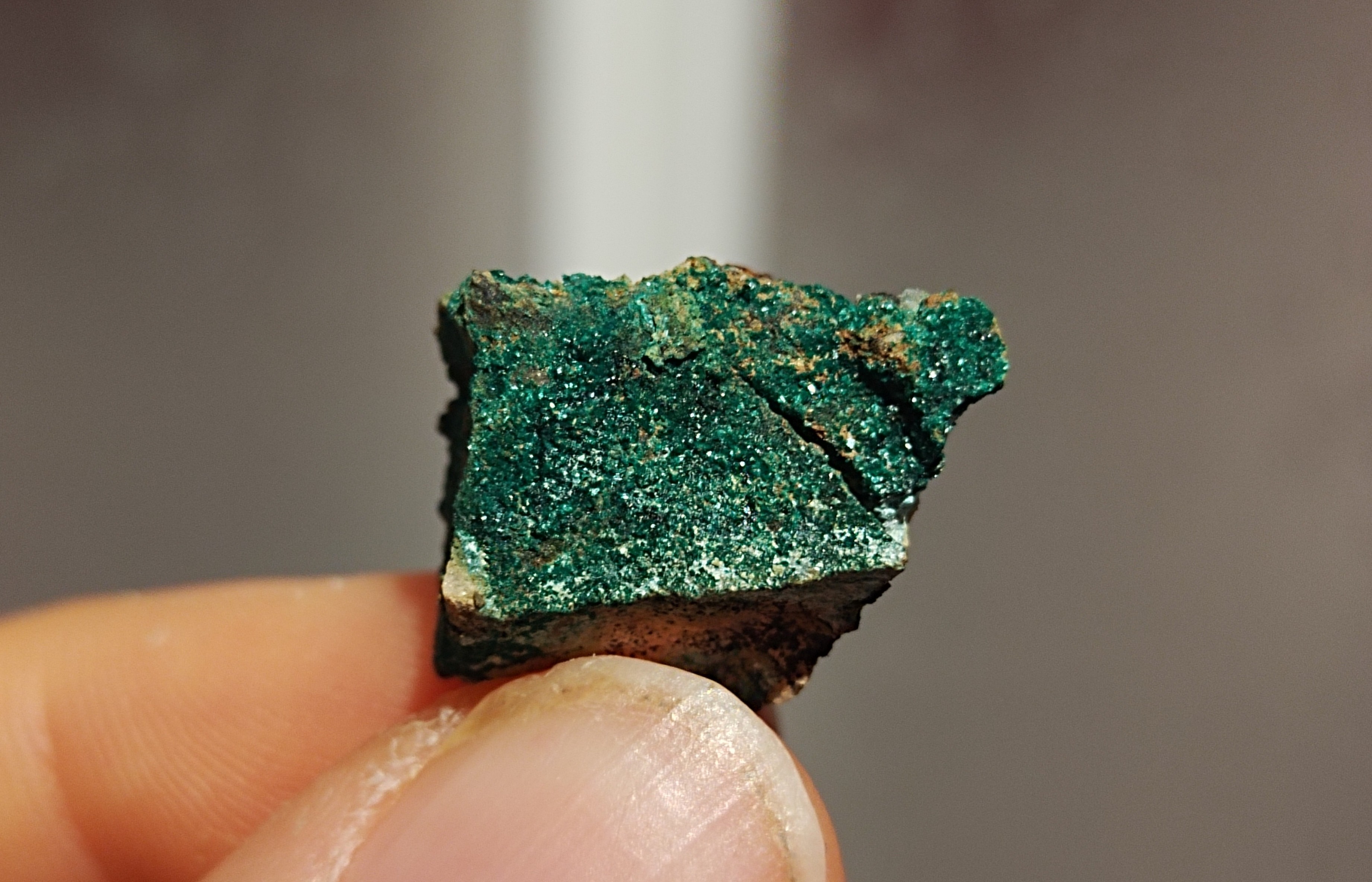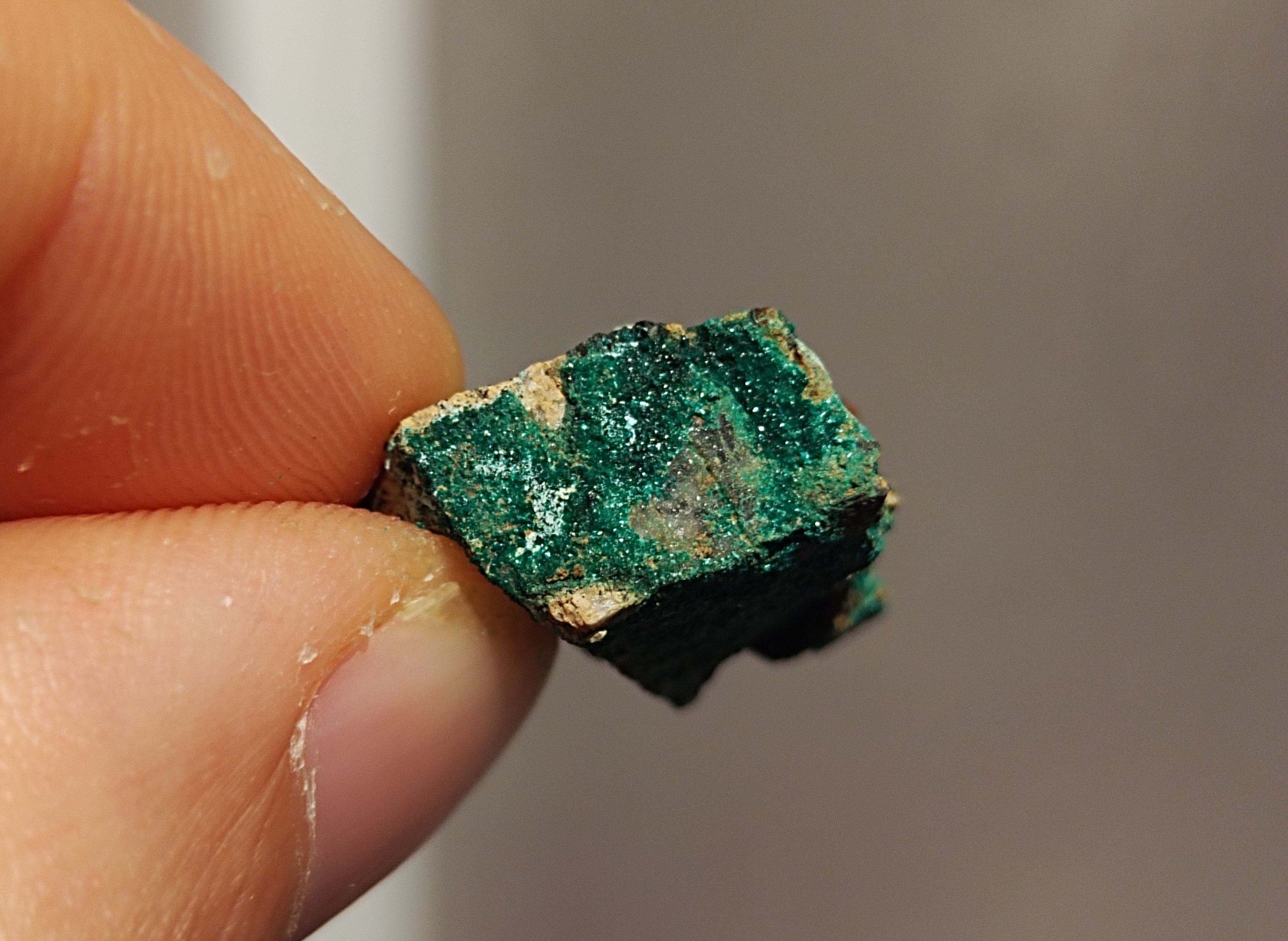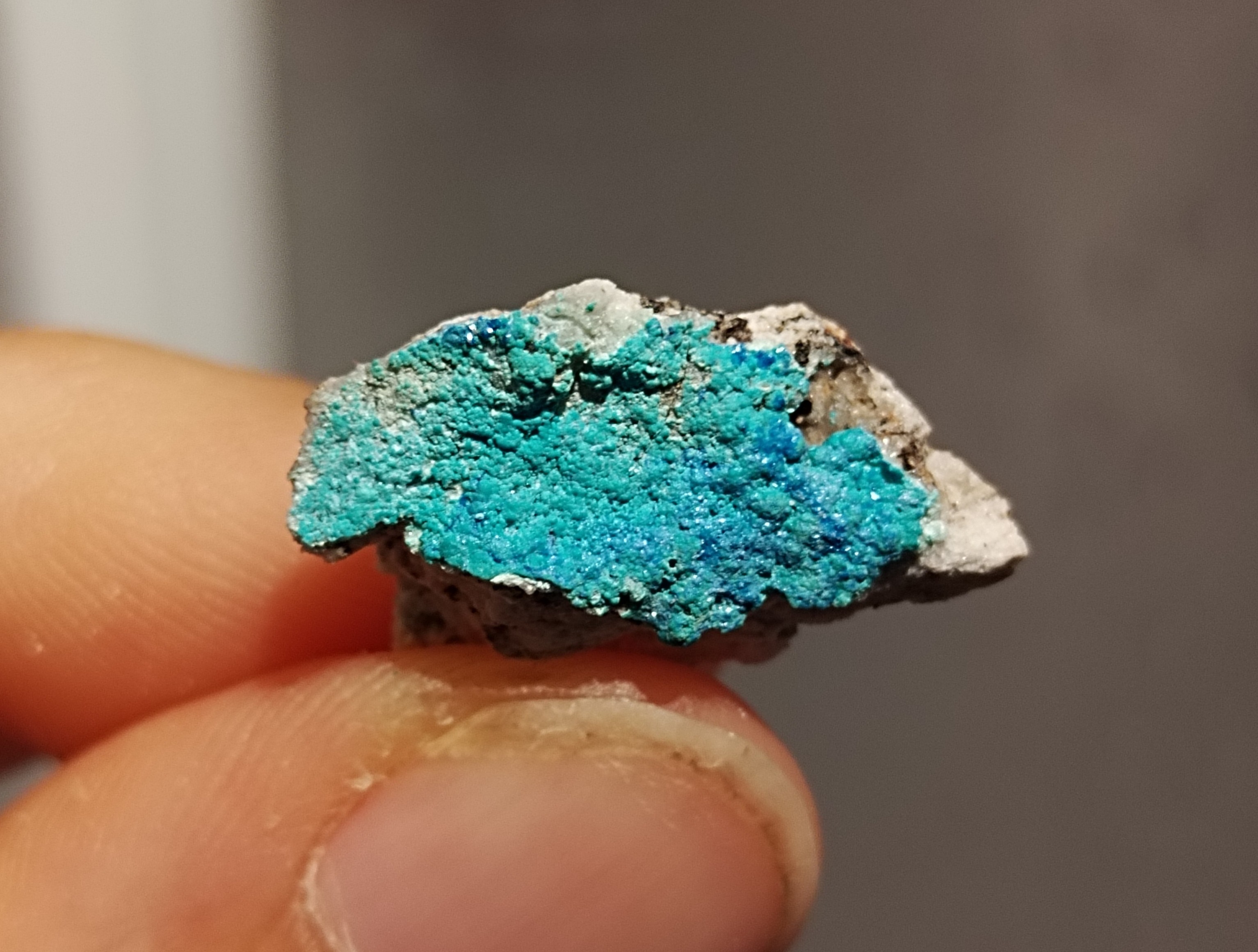 13. D'après ce que j'ai vu sur mindat les parties bleu clair ressemblent à de l'Allophane mais sans certitudes . Appart un quartz je n'ai rien trouvé au niveau des terrils , je les aies trouvé à un endroit qui semble avoir été exploité à ciel ouvert . Malachite (?) Arrigas 2×1,5 cm 4,5×3,5 cm