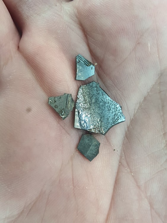 6. Il y a aussi ça qui a attiré ma curiosité, Trouvés sur le Puy de la Tache, d'apparence métallique brillant, en feuilles minces, gris anthracite et brillant (effet miroir)