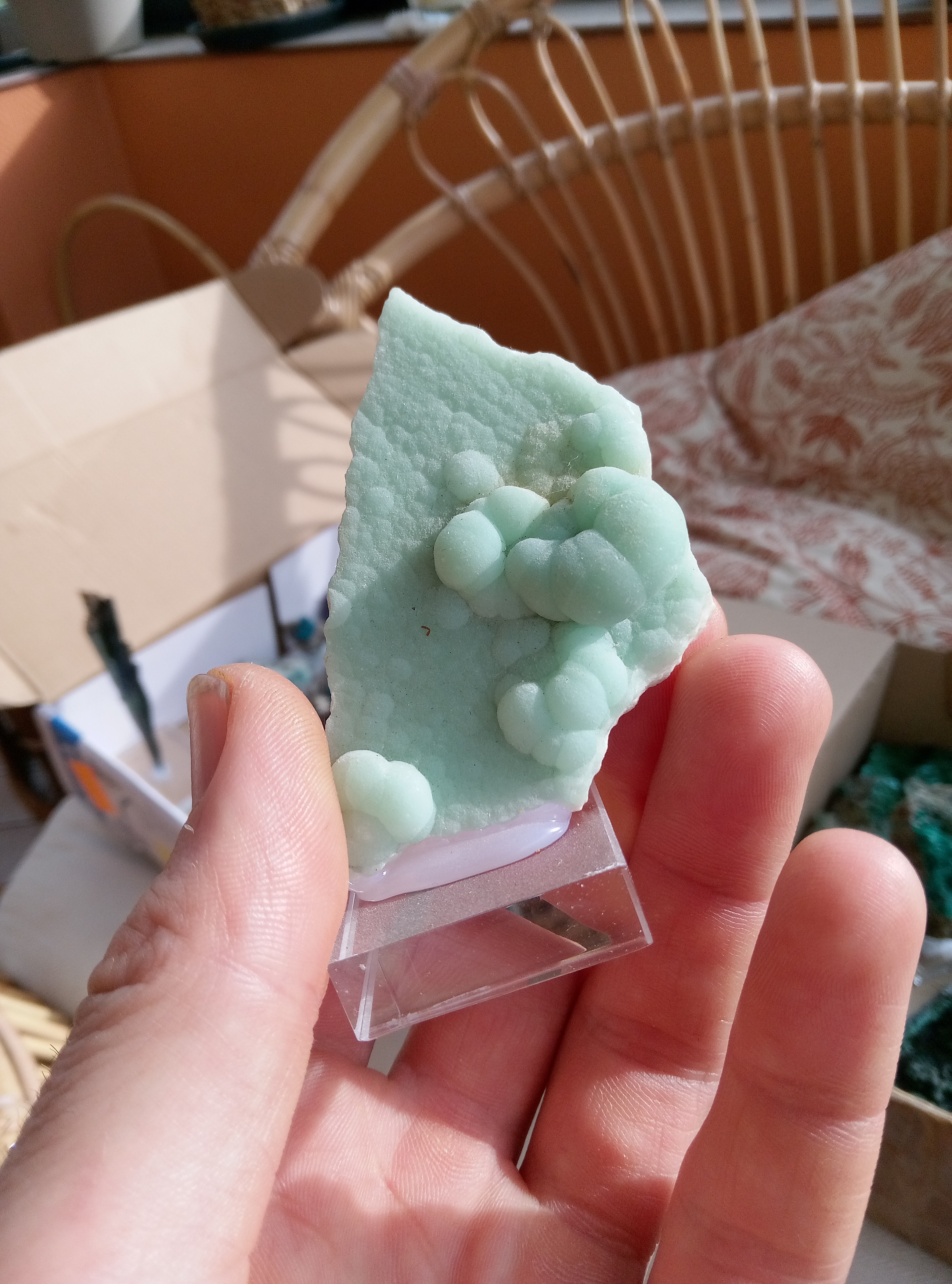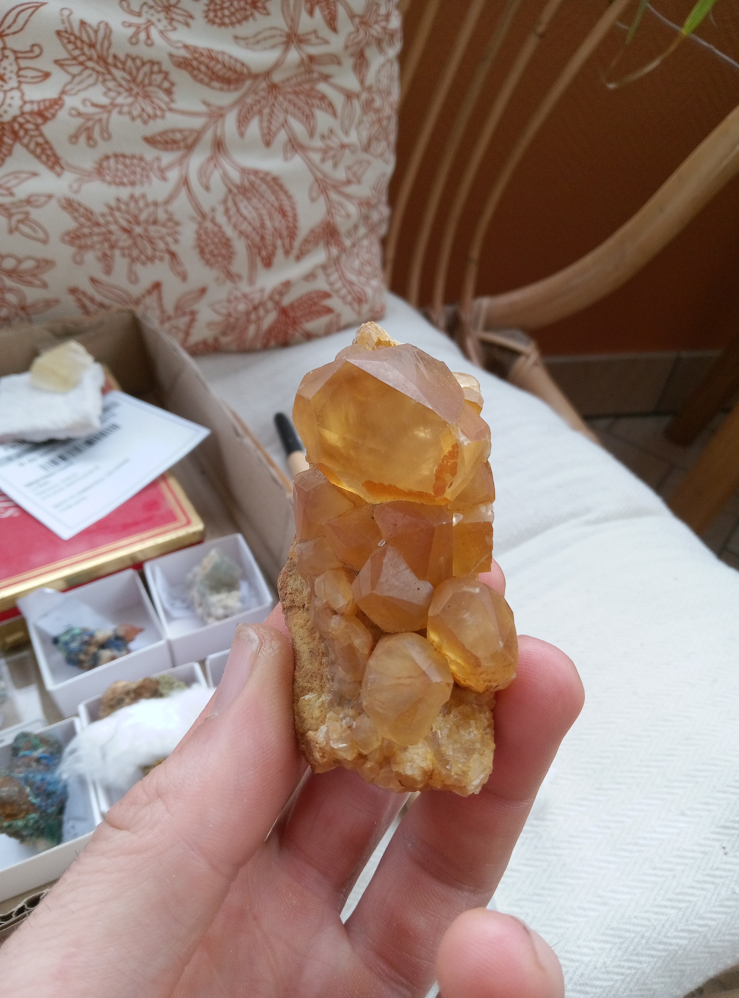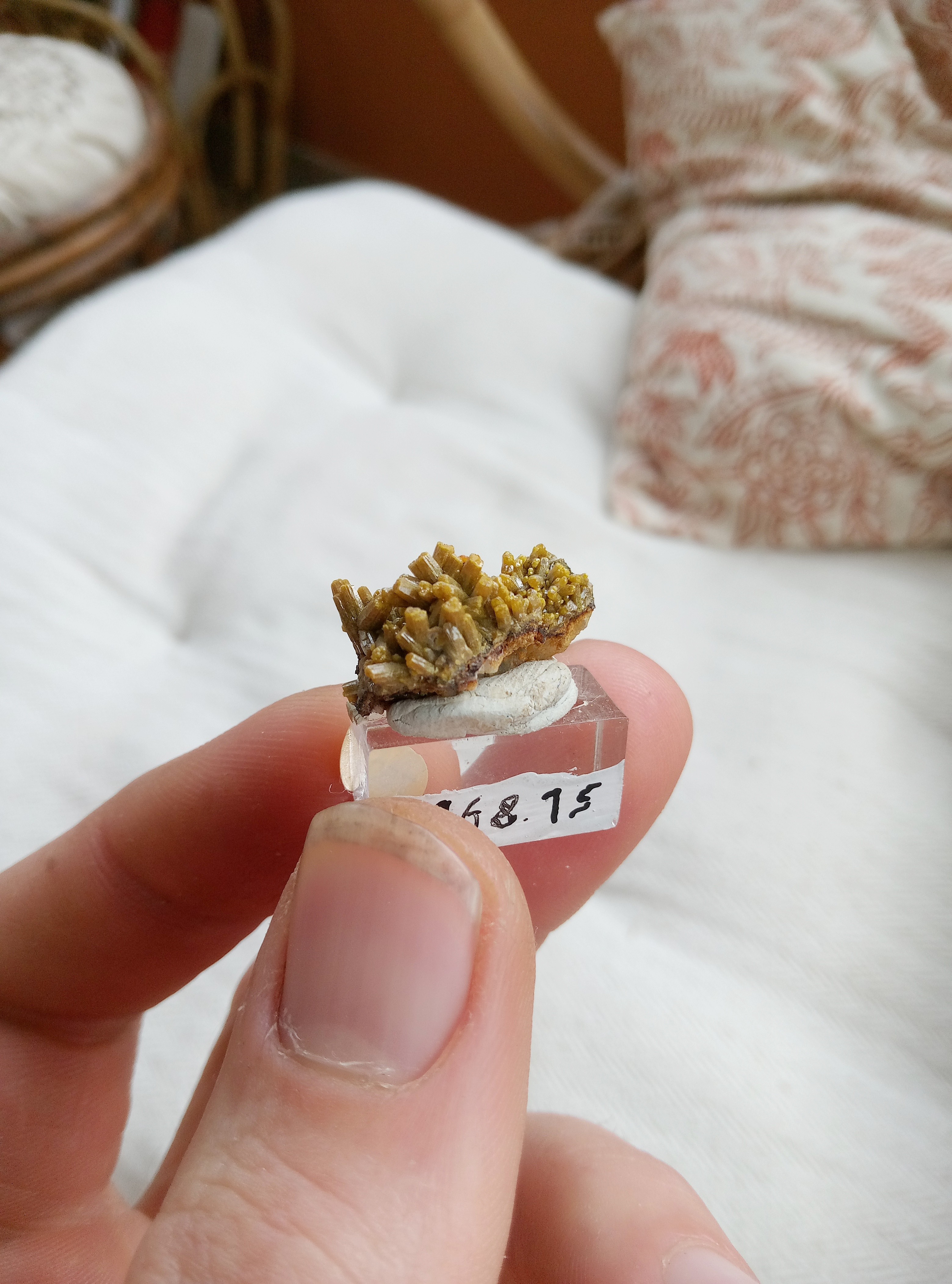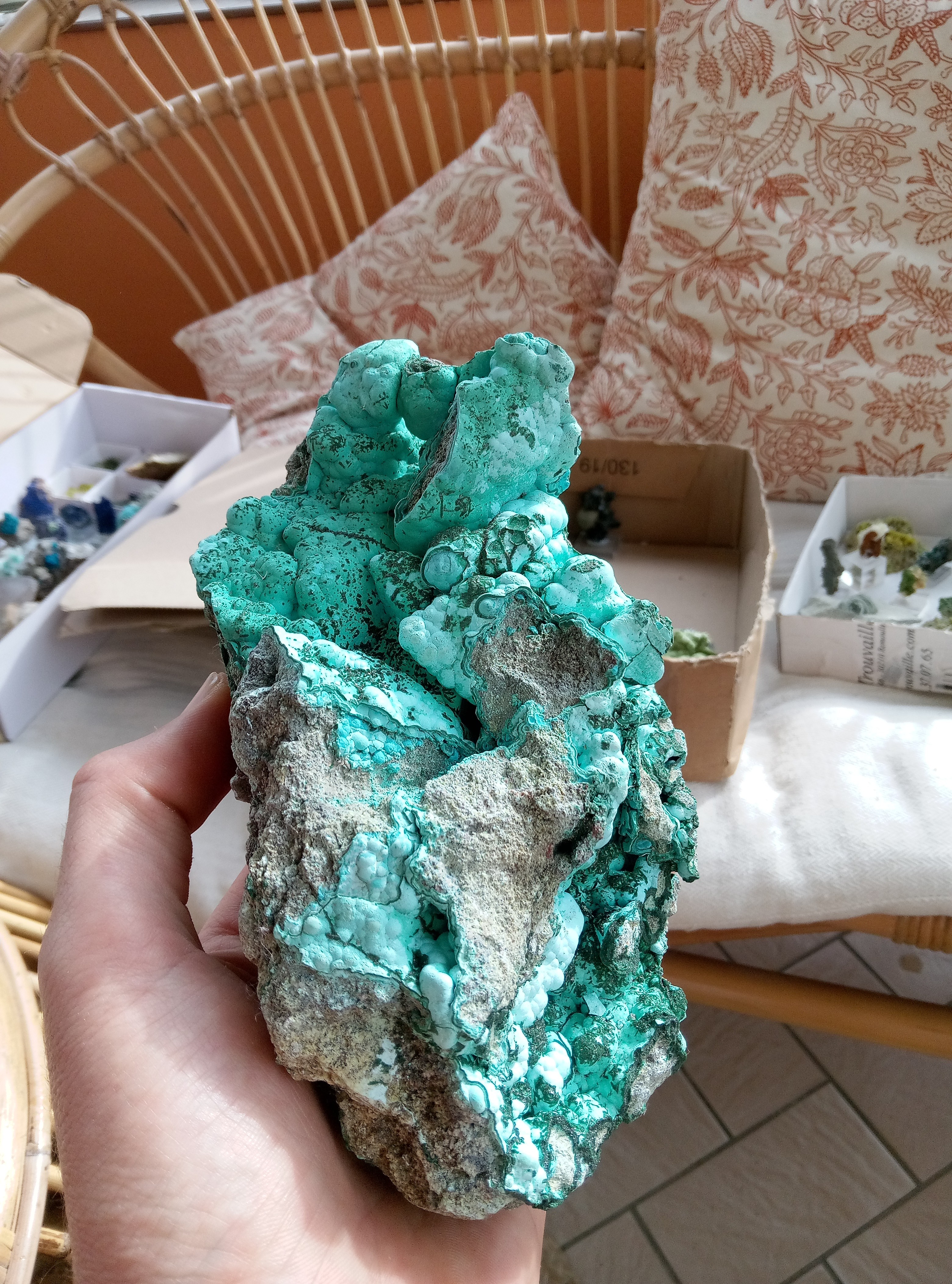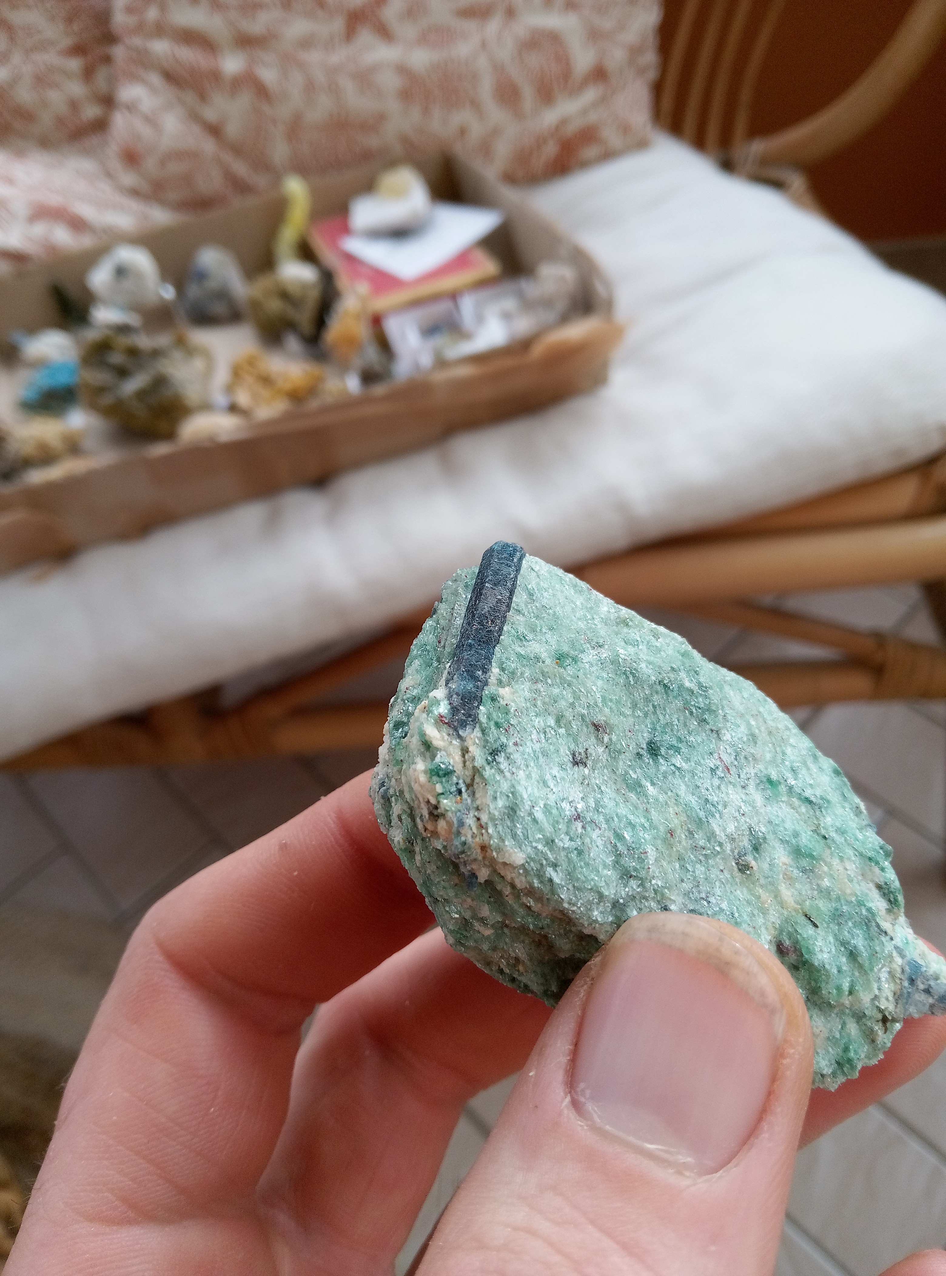 Demantoides, madagascar Epidote, vallée du skardu, Pakistan. Epidote poilue, isere sans précision Epidote et quartz, isere sans précision. Dioptase, différente localité. J'avoue avoir un faible pour ces machins vert. Prehnite, Espagne. Mimetite, ojuela, Mexique. Baryte et malachite, congo. Conichalcite et calcite, ojuela, Mexique. Quartz, probablement a ame bouffer par la chlorite, la lauziere. Quartz et chlorite, l lauziere. Vivianite, minas gerais, Brésil. Pyromorphite, aspriere, Aveyron. Adamite,ojuela, mexique Pyromorphite, bains les bains, Vosges. Pyromorphites, les farges. Double vert, chlorite sur prehnite, combe de la selle. Un dernier vert? Prehnite et epidote, cercle de kayes, mali Titanite, maroc. Epidote, Chamrousse. Wavelite, mount ida, Arkansas, USA. Malachite, deux localité différente dont je n'ai plus le nom.il faut que je cherche dans les étiquettes orphelines. Et pour finir dioptase, reneville, congo. -