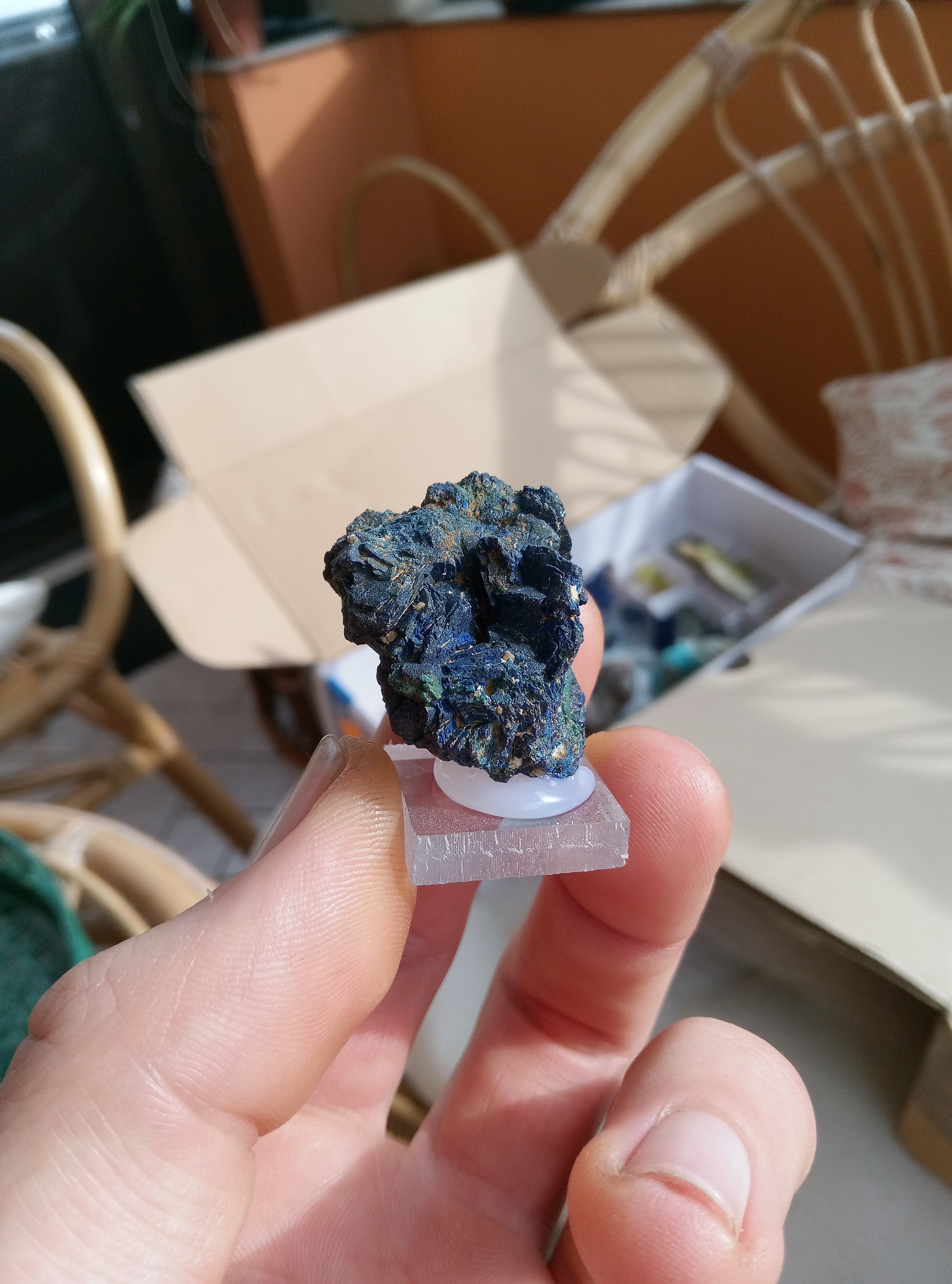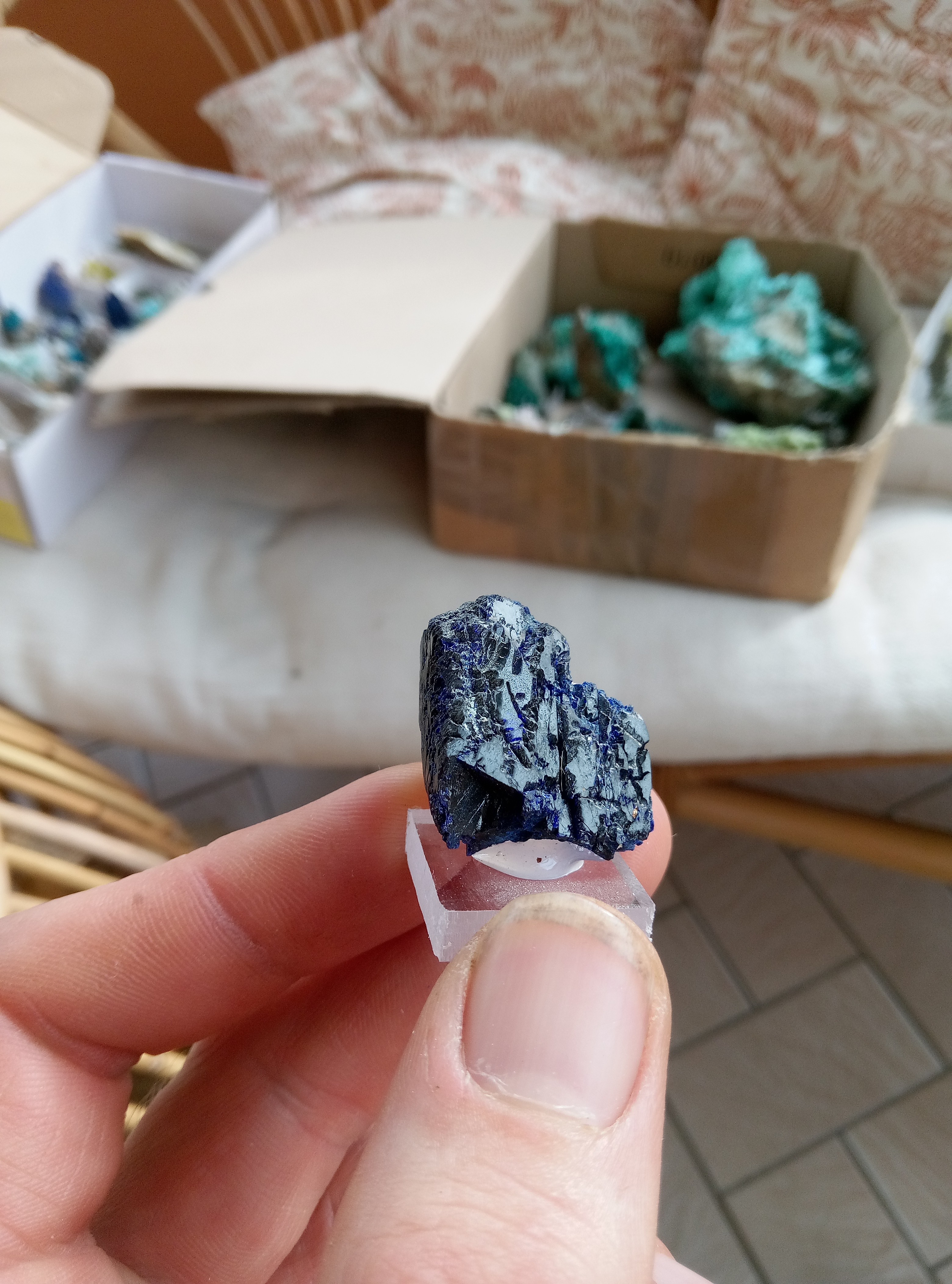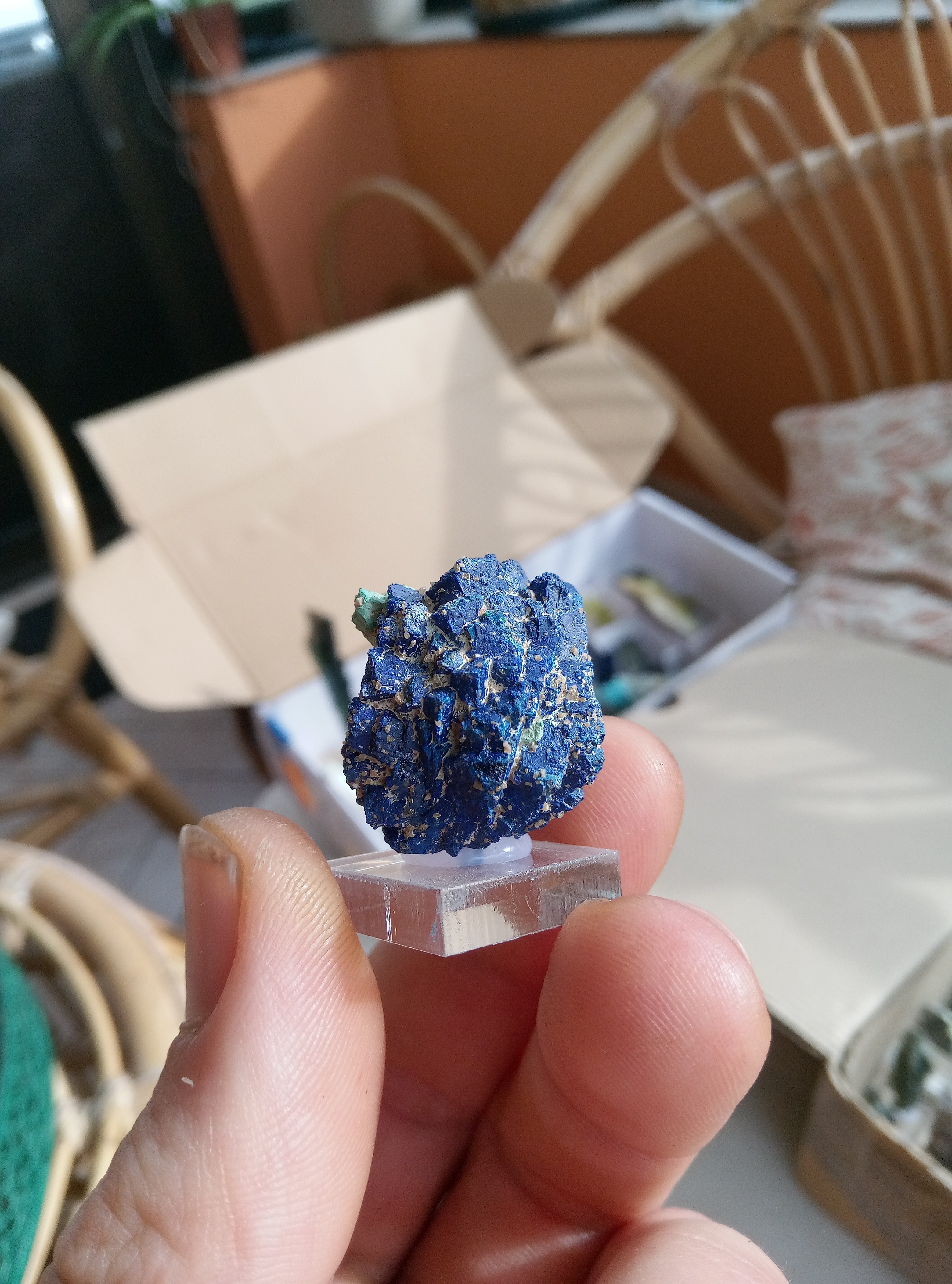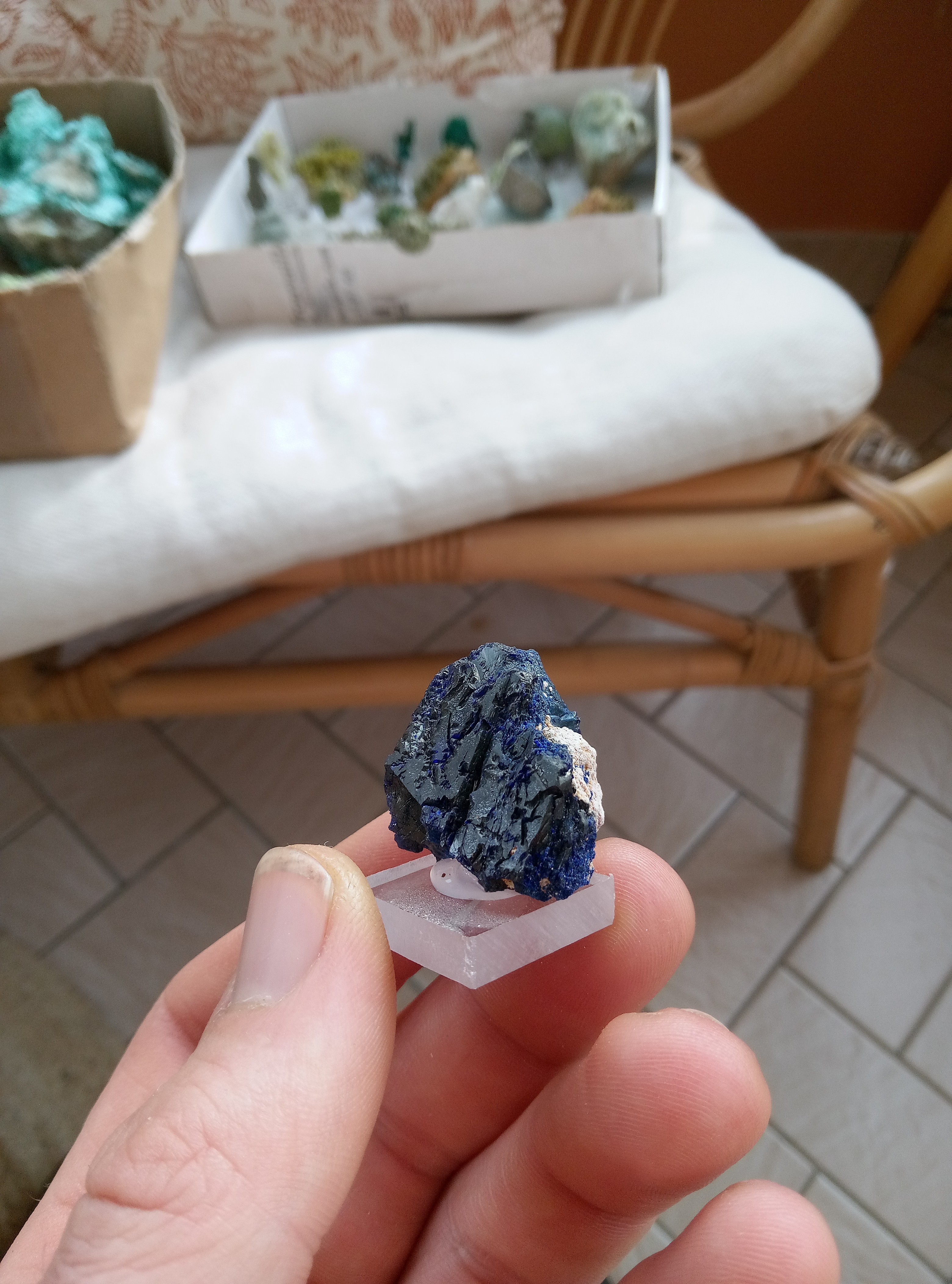 Parce que les cartons ne manquent pas de bleu je continu. Azurite, Chessy. Cavansite, Inde. Cavansite sur stillbite, Inde. Aigue marine sur quartz, Afghanistan. Chrisocolle, mine de l'étoile, congo Baryte bleue, la union, Espagne. Aragonite bleue, sans provenance. Chrisocolle et malachite, congo -