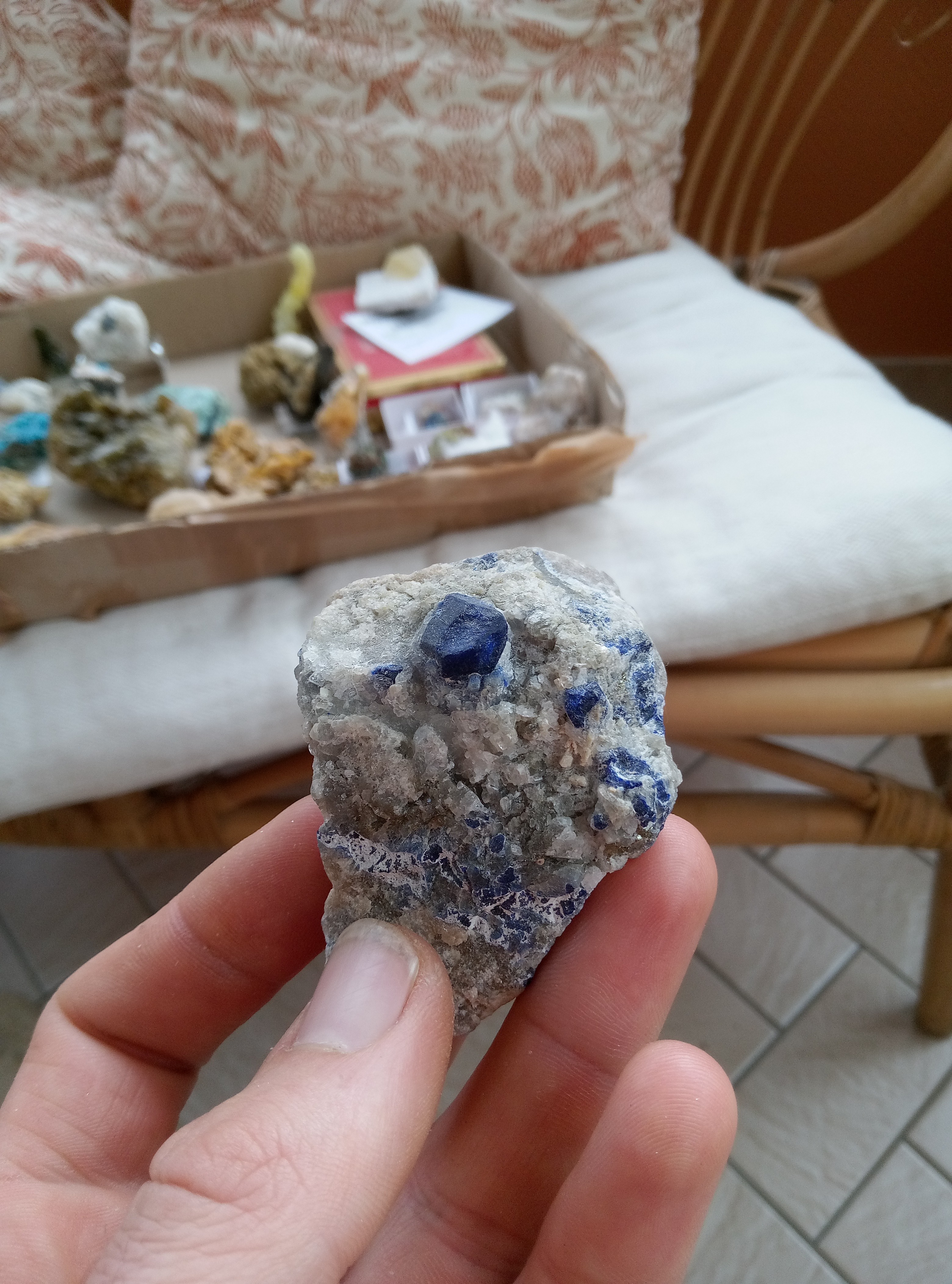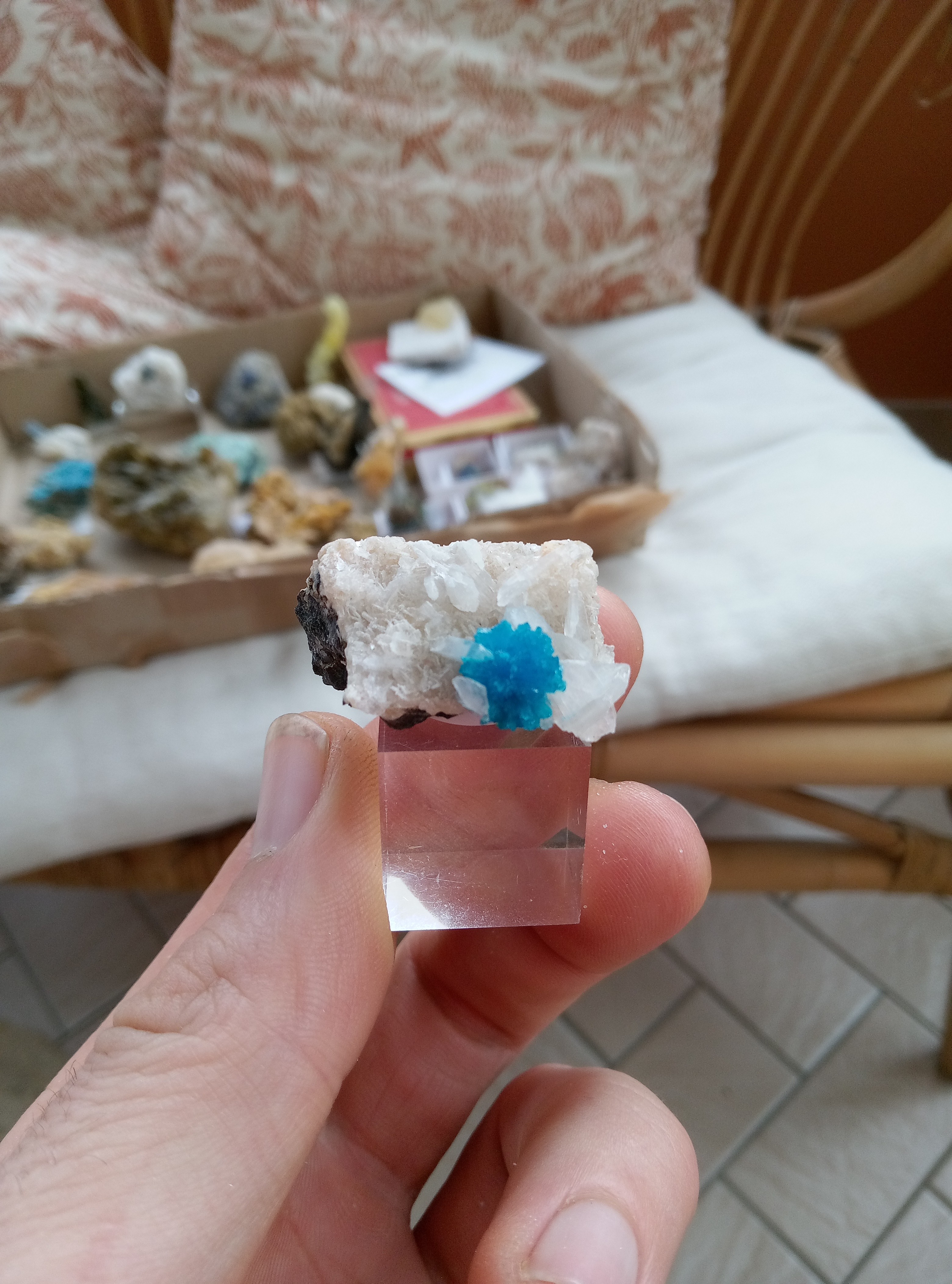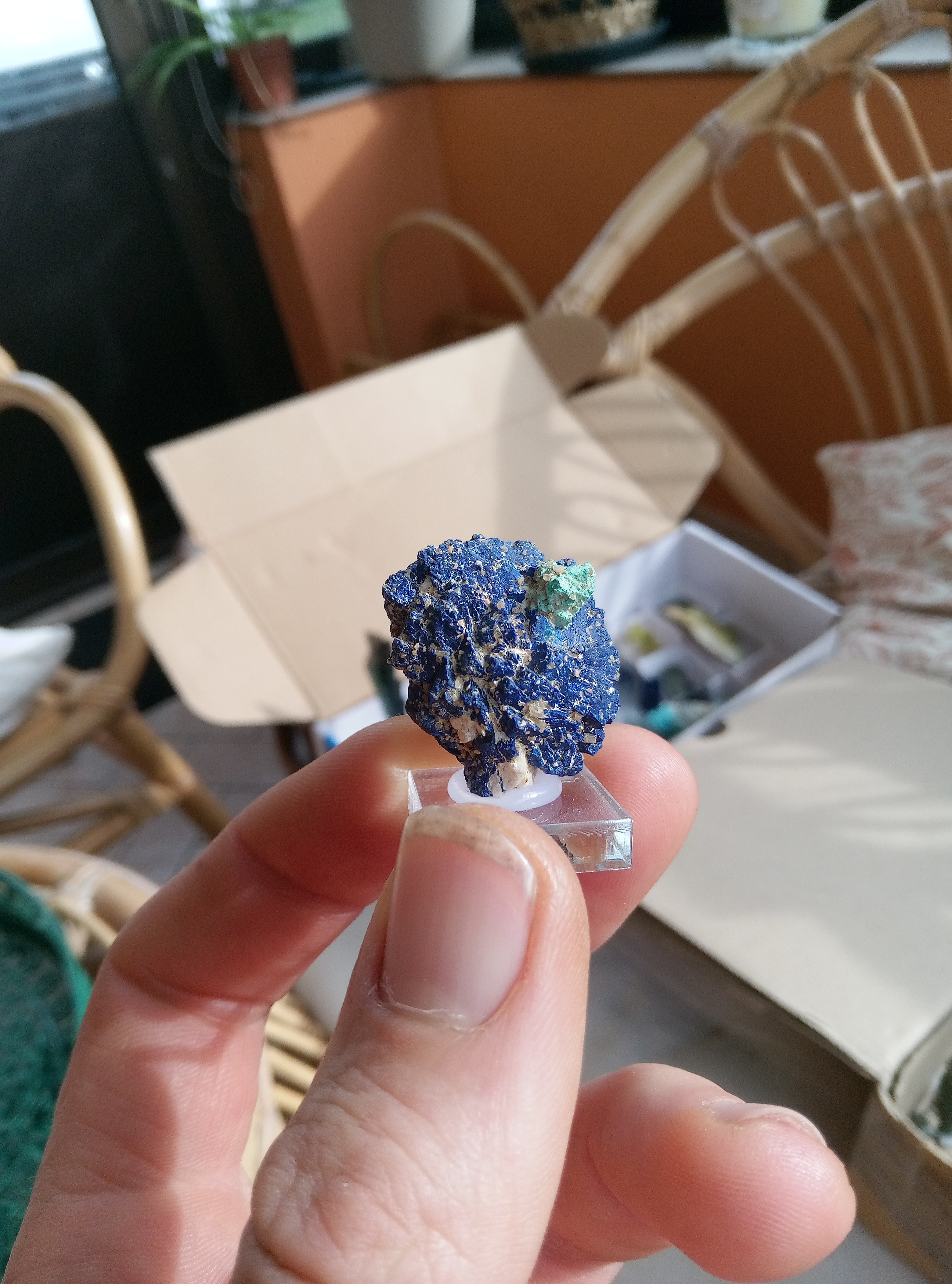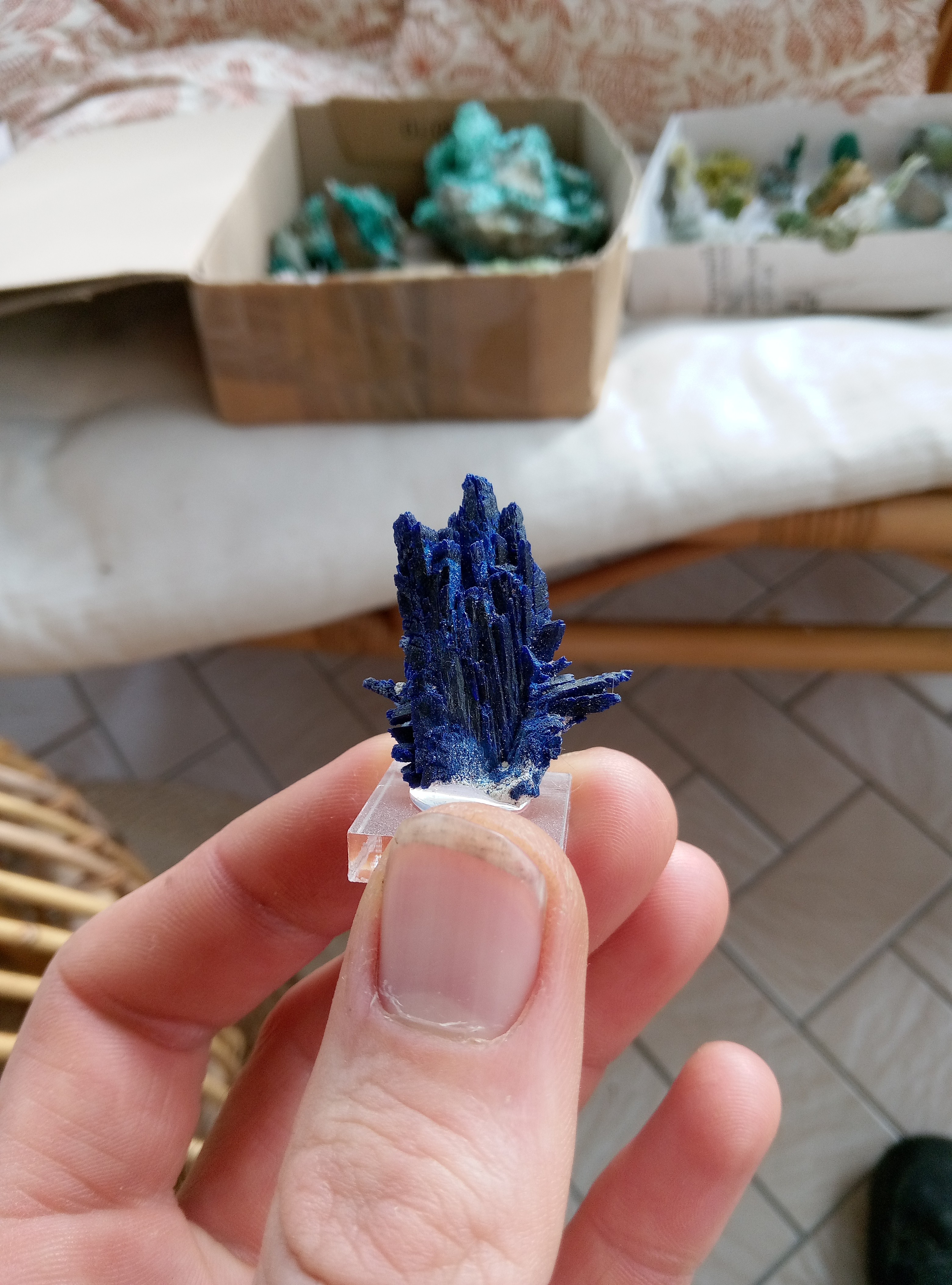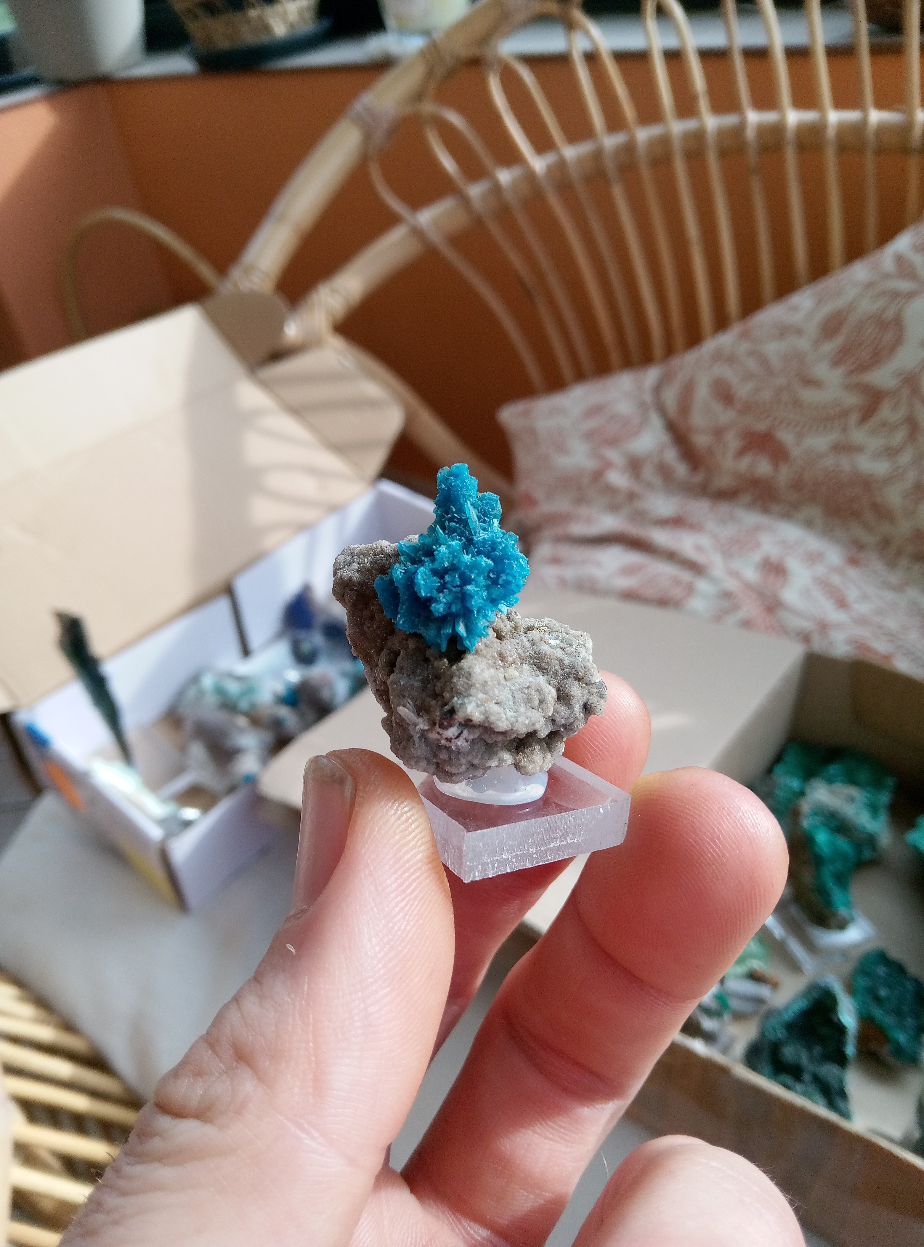 Parce que les cartons ne manquent pas de bleu je continu. Azurite, Chessy. Cavansite, Inde. Cavansite sur stillbite, Inde. Aigue marine sur quartz, Afghanistan. Chrisocolle, mine de l'étoile, congo Baryte bleue, la union, Espagne. Aragonite bleue, sans provenance. Chrisocolle et malachite, congo -