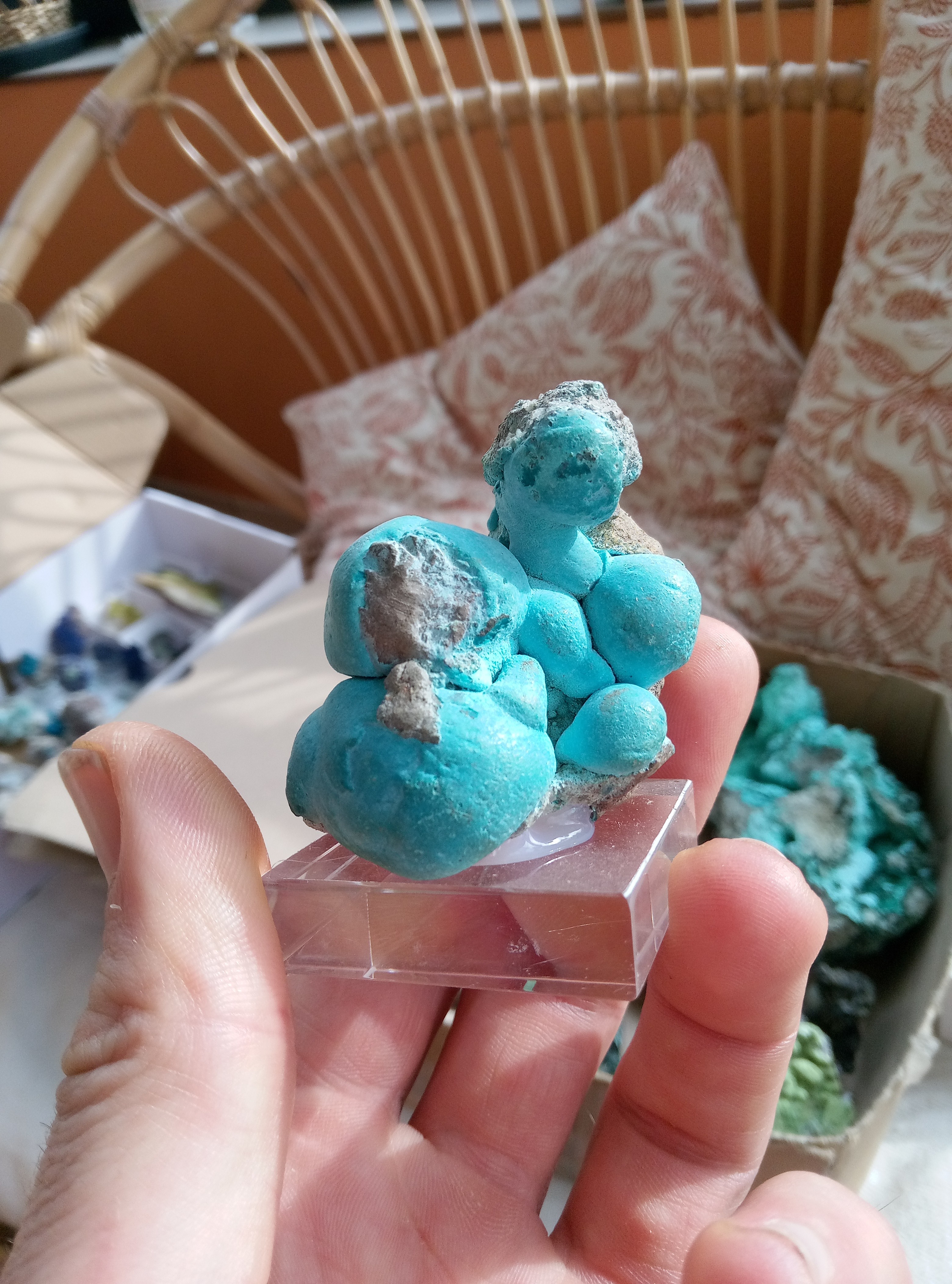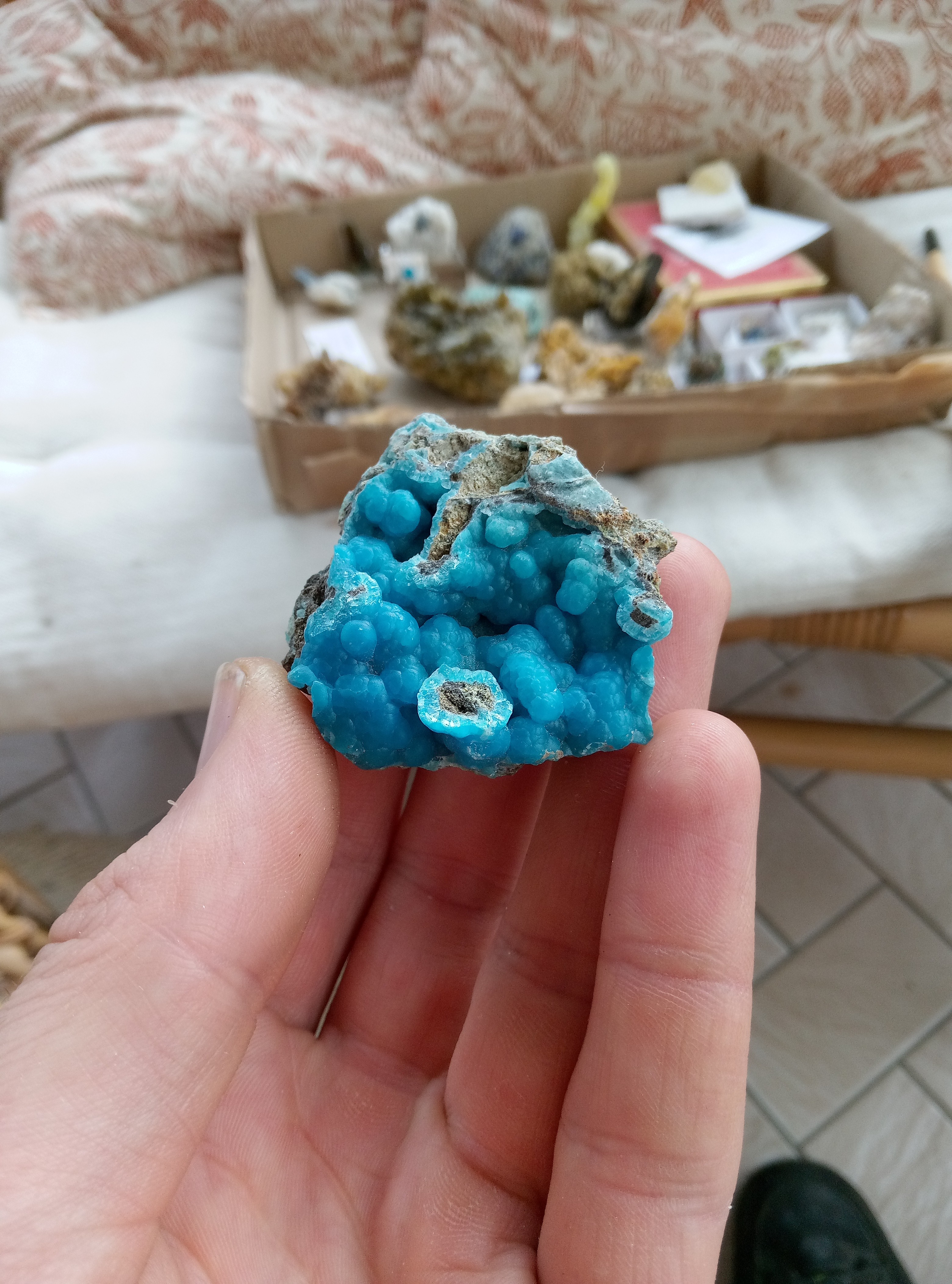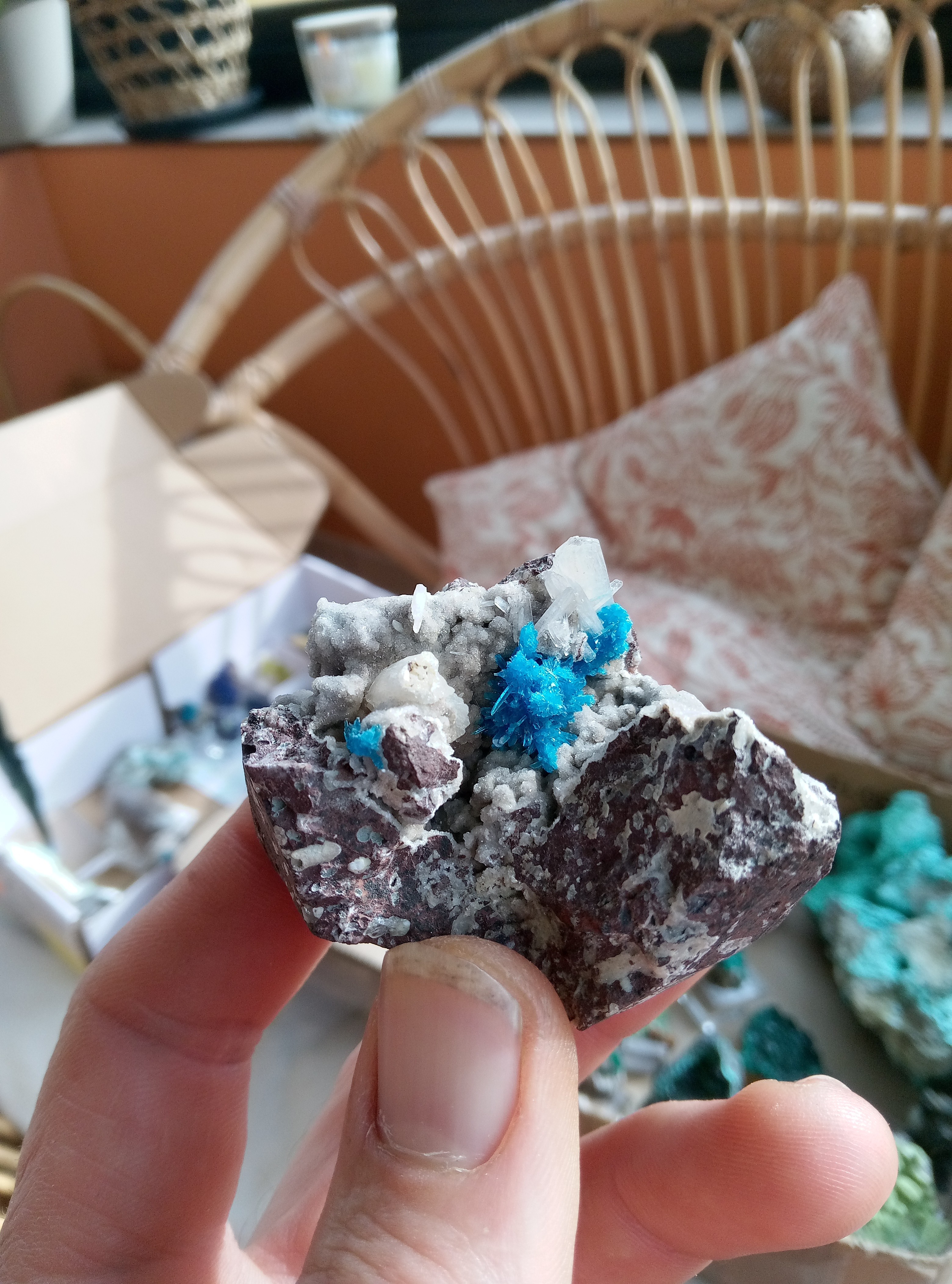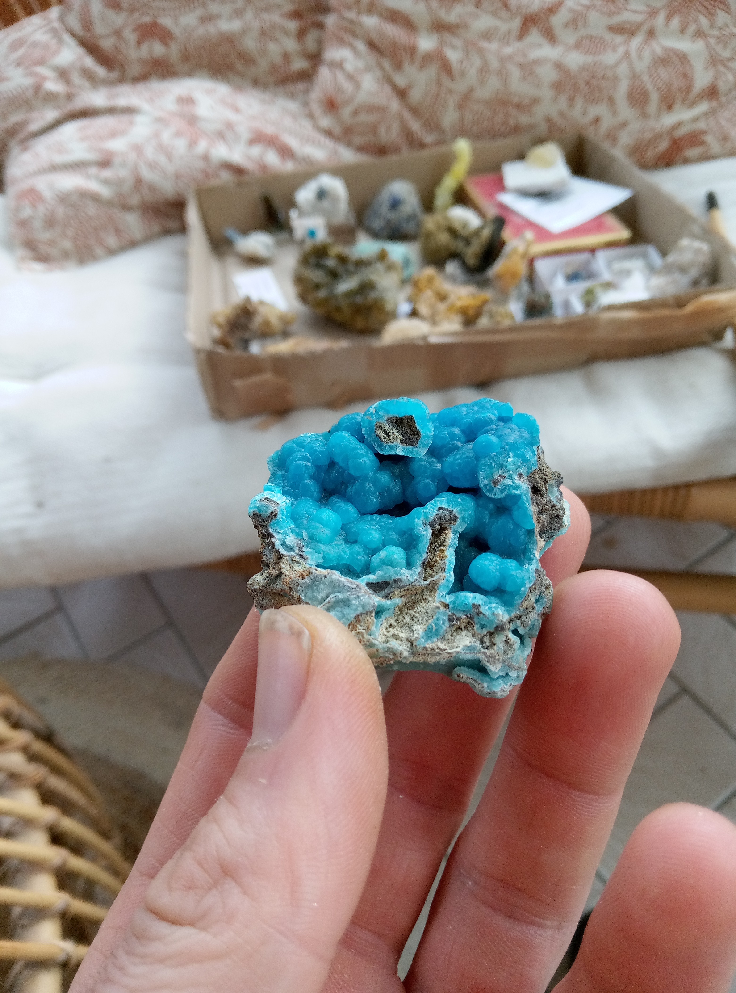 Parce que les cartons ne manquent pas de bleu je continu. Azurite, Chessy. Cavansite, Inde. Cavansite sur stillbite, Inde. Aigue marine sur quartz, Afghanistan. Chrisocolle, mine de l'étoile, congo Baryte bleue, la union, Espagne. Aragonite bleue, sans provenance. Chrisocolle et malachite, congo -