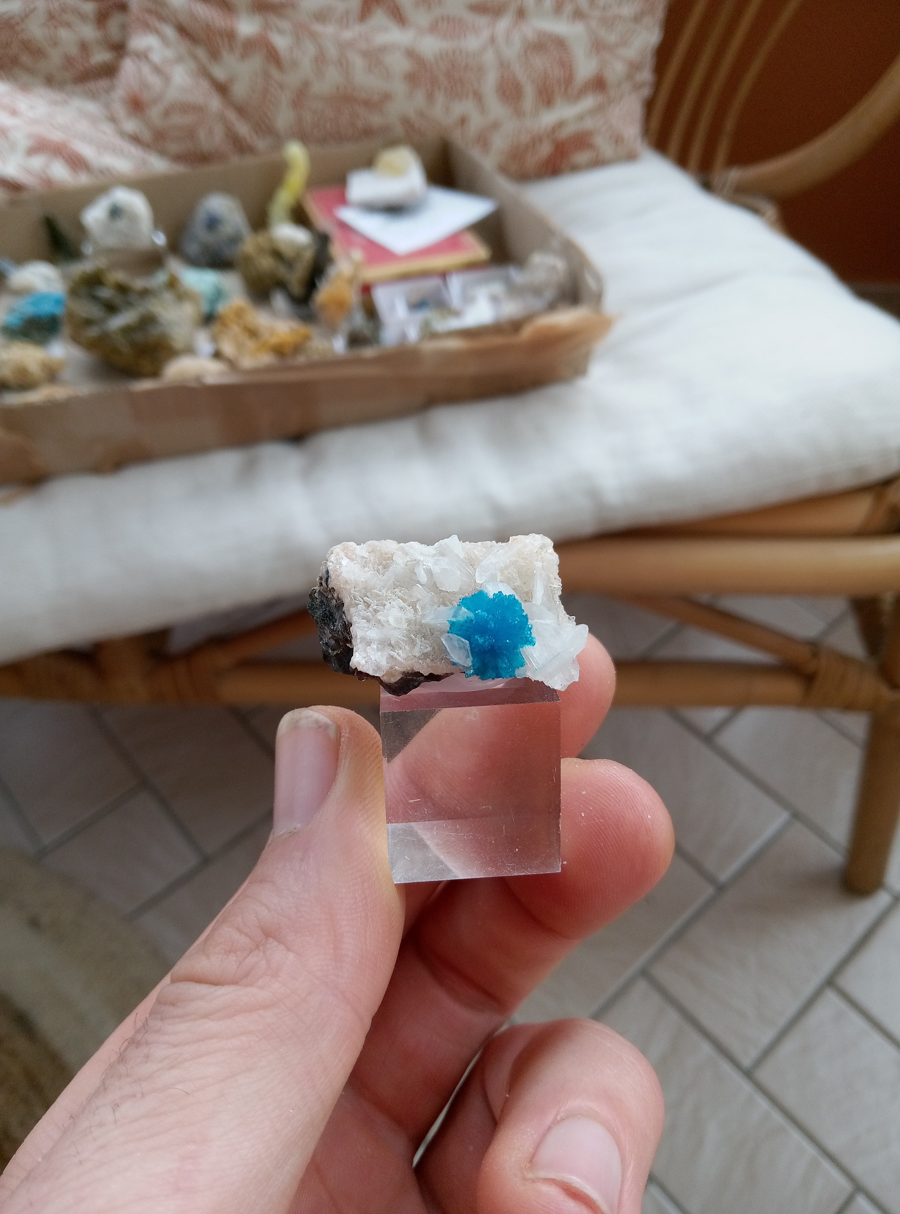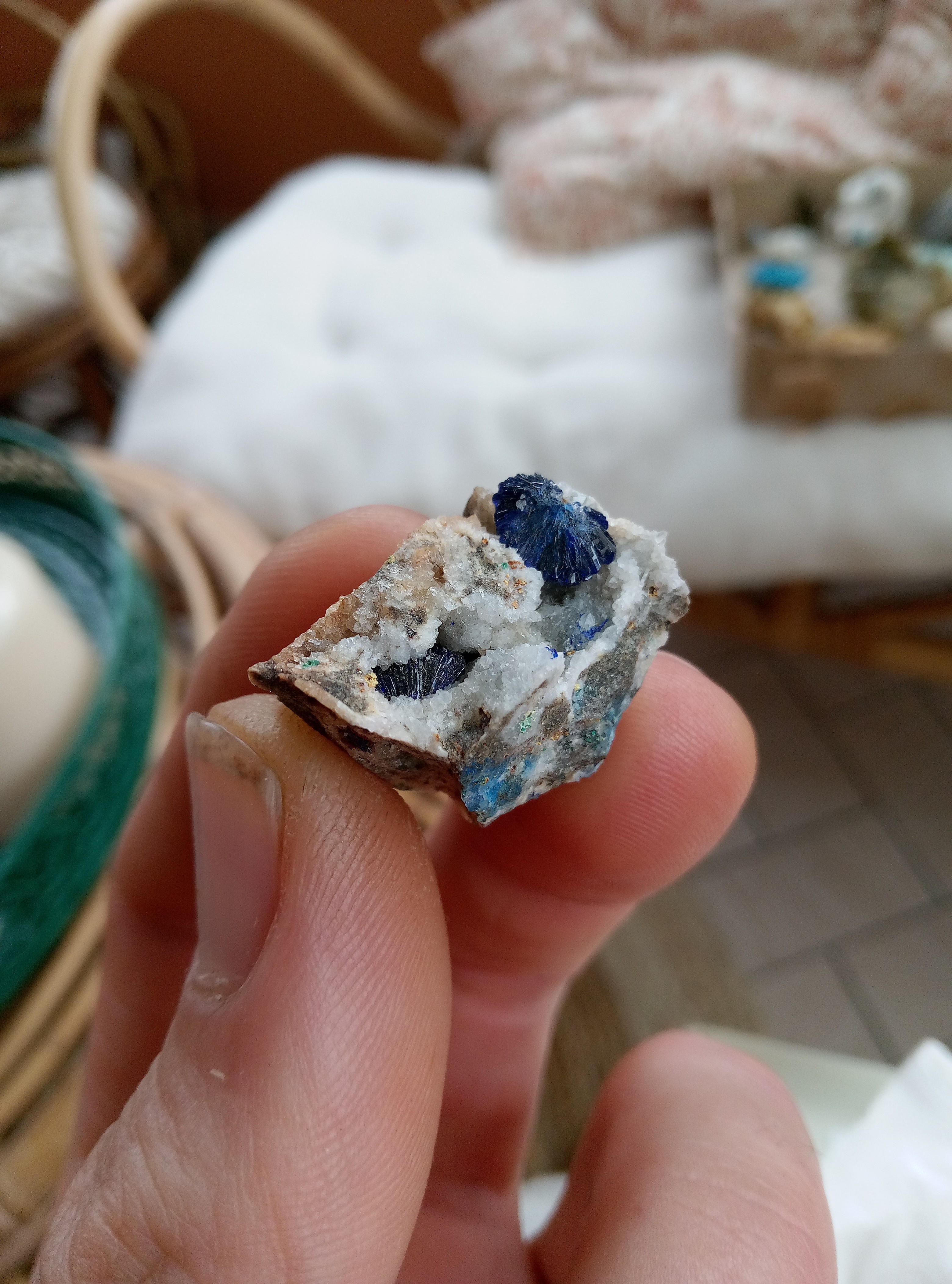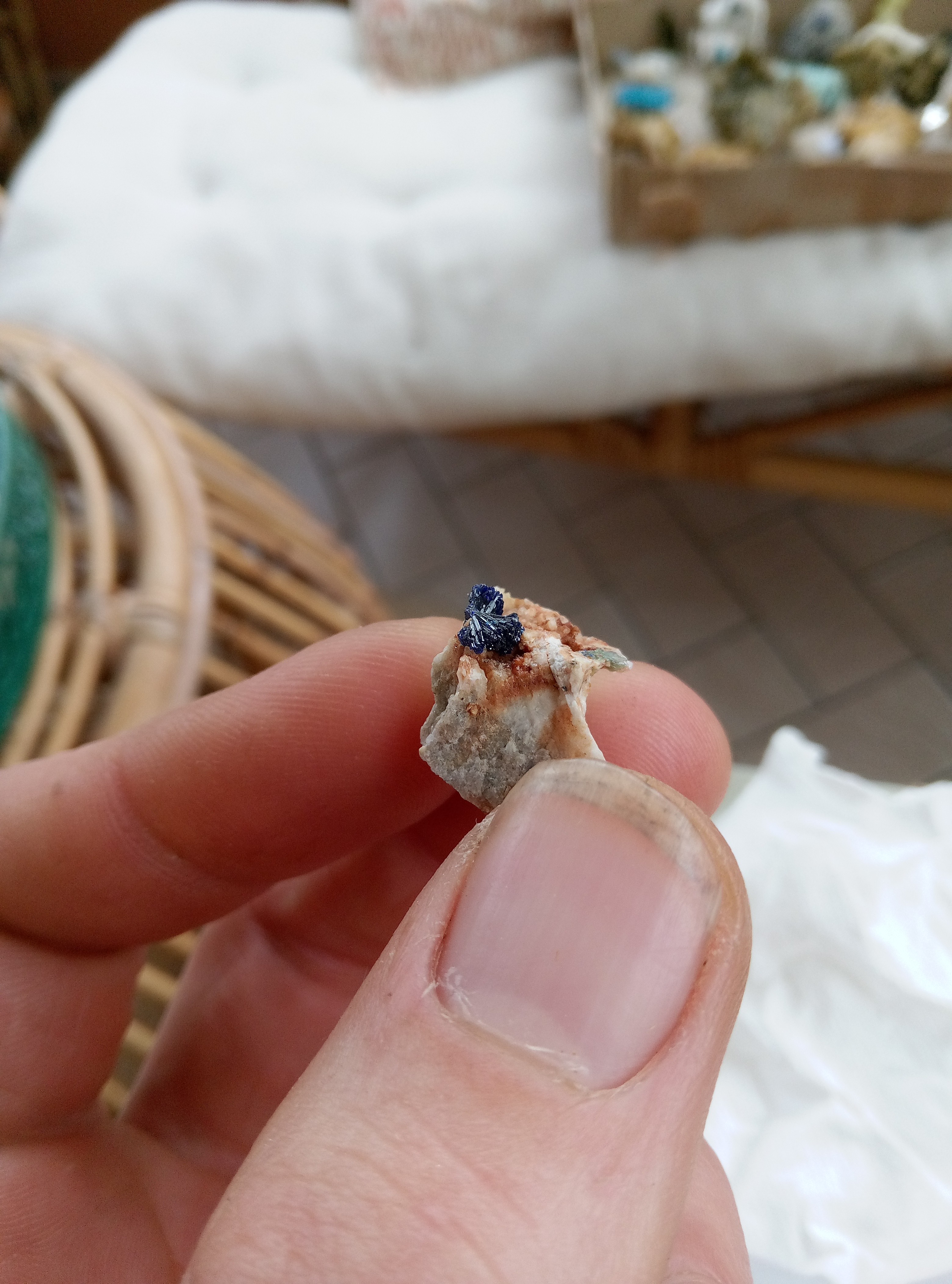 Je vais être plus classique dans les partage, les originaux sont en micro que je partagerais plus tard. Azurites model réduis du mas dieu, gard. Azurite et malachite, barrioz, isere Azurite et quartz, mine a Giraud, isere. Baryte bleue, saint Georges les bains, ardeche. Hemimorphite, yunan, chine. Je suis assez fan de la couleur. Cavansite et stillbite. poona, Inde. Lazurite, Afghanistan. Disthene sur machin vert qui fou des paillette partout, origine inconnue. Aigue marine, Madagascar Disthene presque gemme, minas gerais, Brésil. Azurite, kerouchen, maroc. -