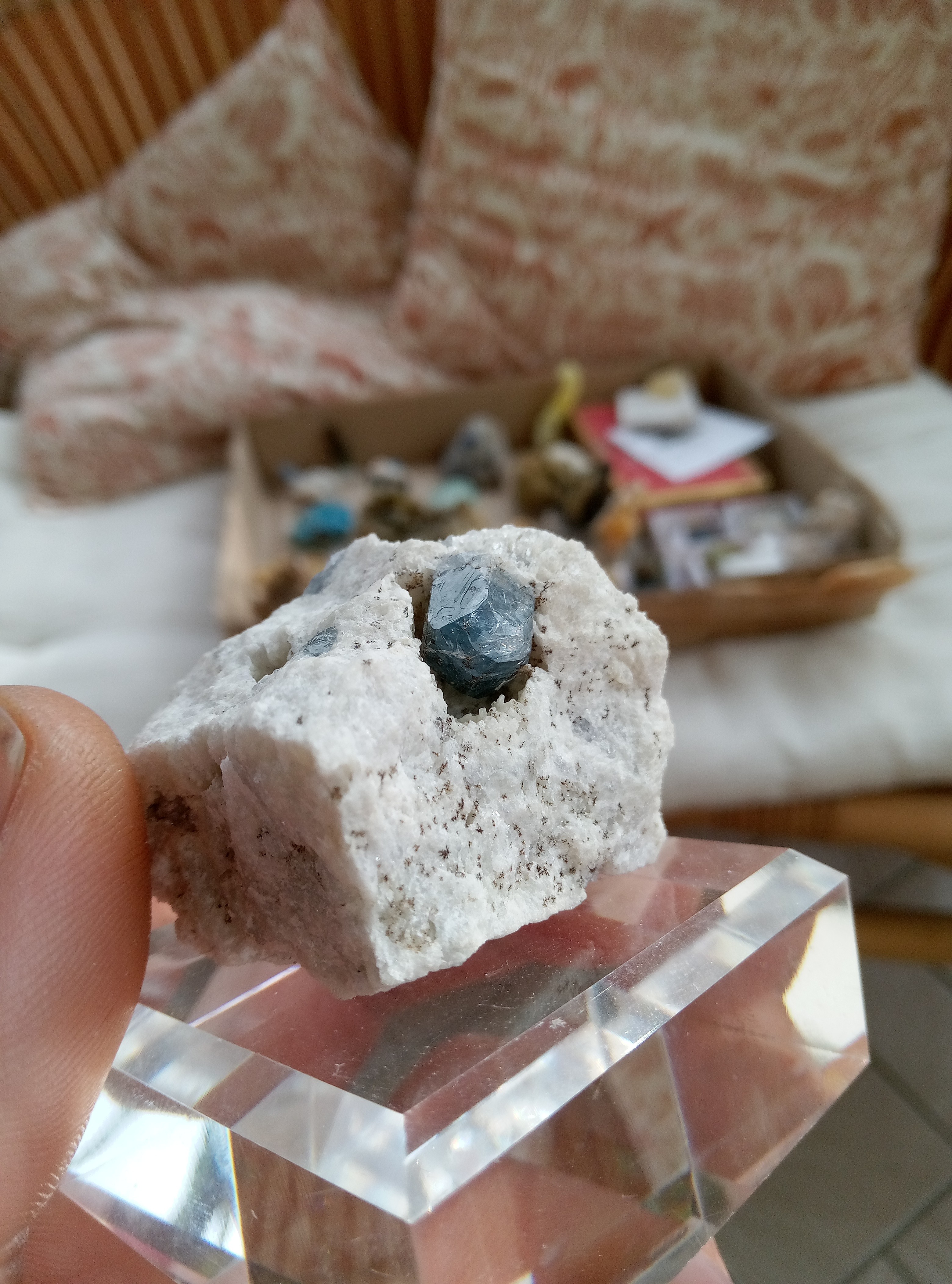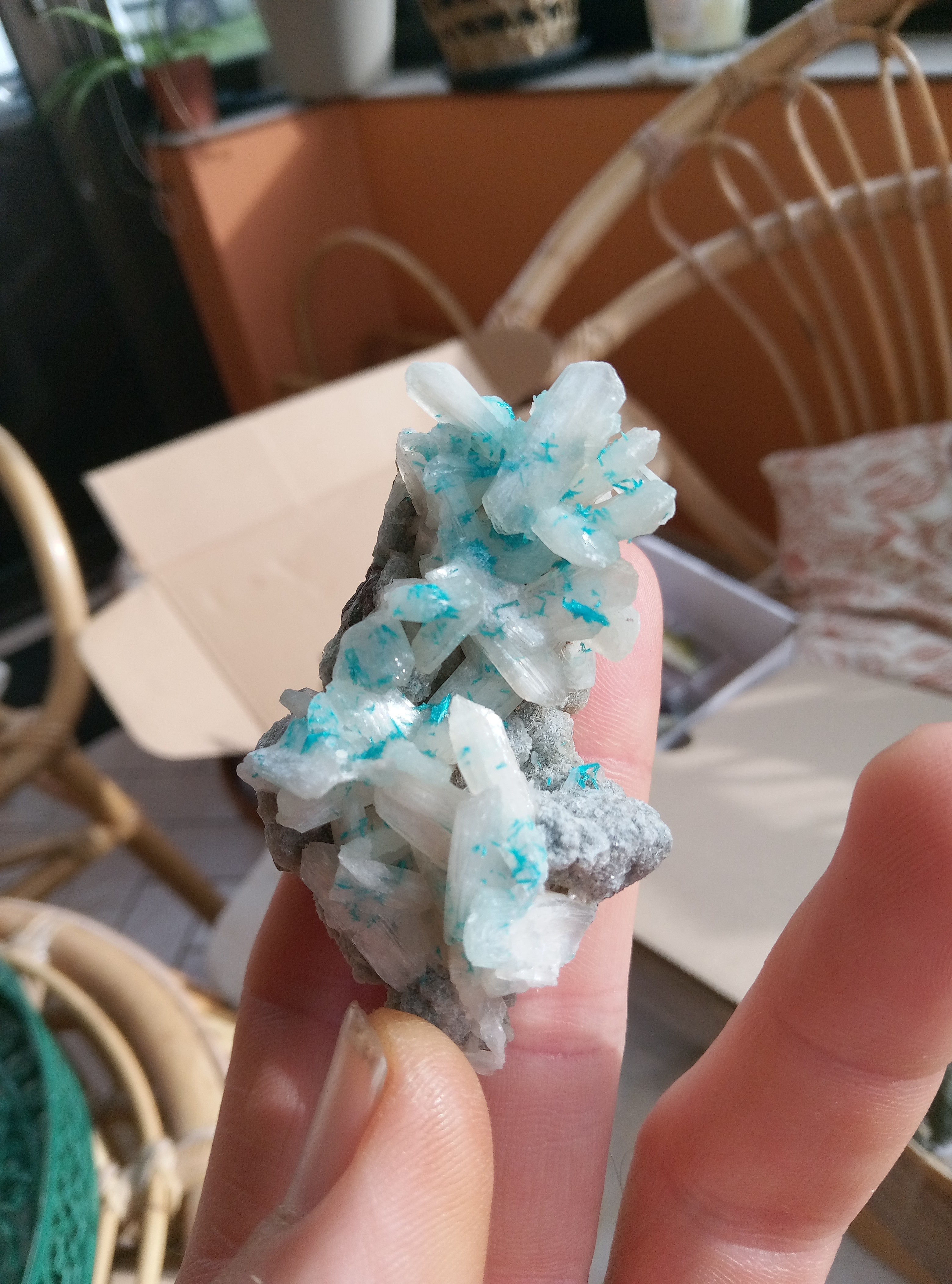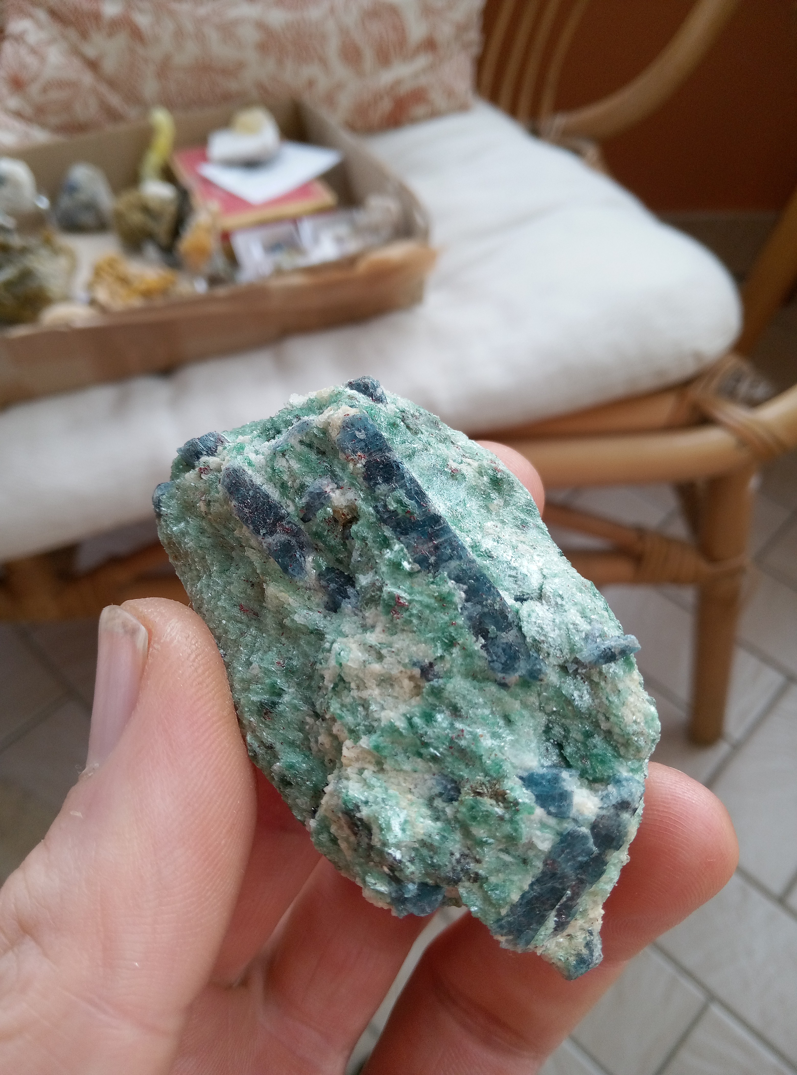 Je vais être plus classique dans les partage, les originaux sont en micro que je partagerais plus tard. Azurites model réduis du mas dieu, gard. Azurite et malachite, barrioz, isere Azurite et quartz, mine a Giraud, isere. Baryte bleue, saint Georges les bains, ardeche. Hemimorphite, yunan, chine. Je suis assez fan de la couleur. Cavansite et stillbite. poona, Inde. Lazurite, Afghanistan. Disthene sur machin vert qui fou des paillette partout, origine inconnue. Aigue marine, Madagascar Disthene presque gemme, minas gerais, Brésil. Azurite, kerouchen, maroc. -