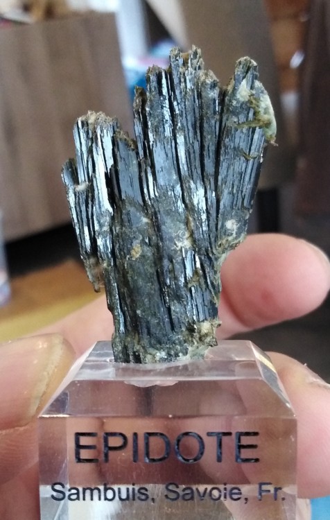 19. Bonsoir, Epidote à croissance parallèle (à âme sans doute) la Sambuis (50x30x5mm).