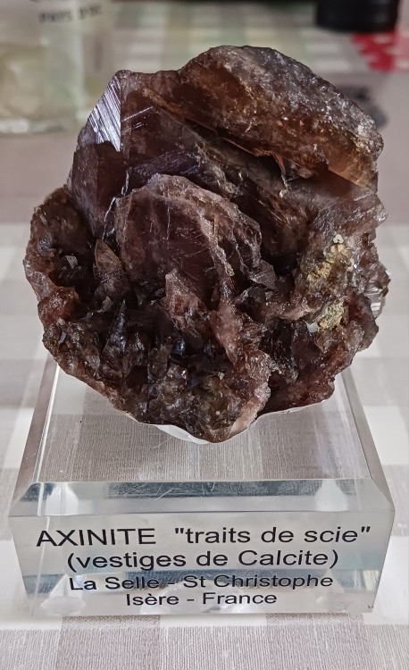 1. Dans la fin des années 70 sur la route surplombant le barrage de Grand Maison au moment de sa création j'avais trouvé de gros morceaux d'axinite massive rose clair avec de gros cristaux très mal formés de très mauvaise qualité (filon décimétrique). A la Selle il y a parfois des filons décimétriques pouvant être géodiques avec d'assez gros cristaux. Voici une axinite ou l'on peux voir des "traits de scies" laissés par de la calcite papier spath dissolue (70x65x30mm).