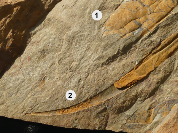 Sur ces morceaux de schiste, il y a le fossile central (#1) (un échinoderme?) et cette longue "épine" (#2) qui mesure environ 13 cm (et m'intrigue beaucoup...). Quelqu'un aurait une idée?