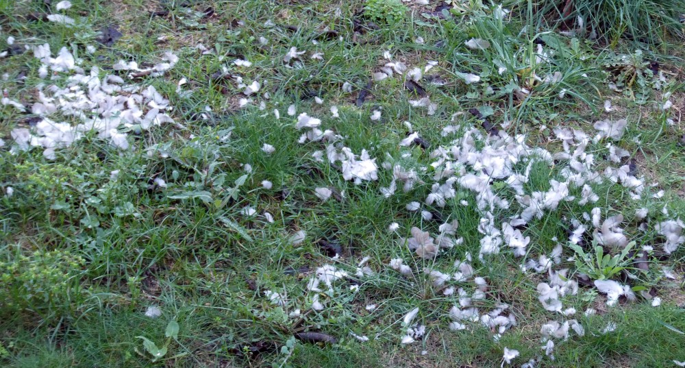 Ce matin un faucon a laissé des plumes dans le jardin, ...les plumes d'une tourterelle qu'il a emporté, trop vite pour que mon apn puisse le capturer .