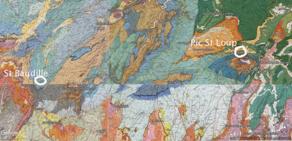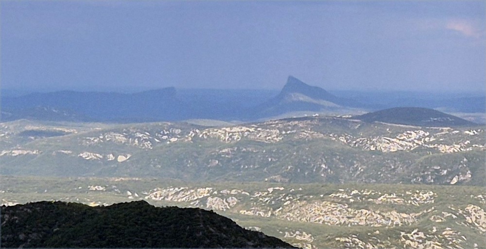 12. Petit tour au Saint Baudille (relais d'Arboras), altitude = 848m; extrémité Sud-Ouest du massif de la Séranne, d'où l'on voit toujours (quand le temps est au beau, c'est à dire souvent par ici !) le Pic Saint Loup (altitude = 658m) à droite et l'hortus à gauche (à 26 km à vol d'oiseau environ, vers l'Est/Nord-Est). pas très net... Et sur un mur de la table d'orientation, au relais d'Arboras, ces figures de base de banc.