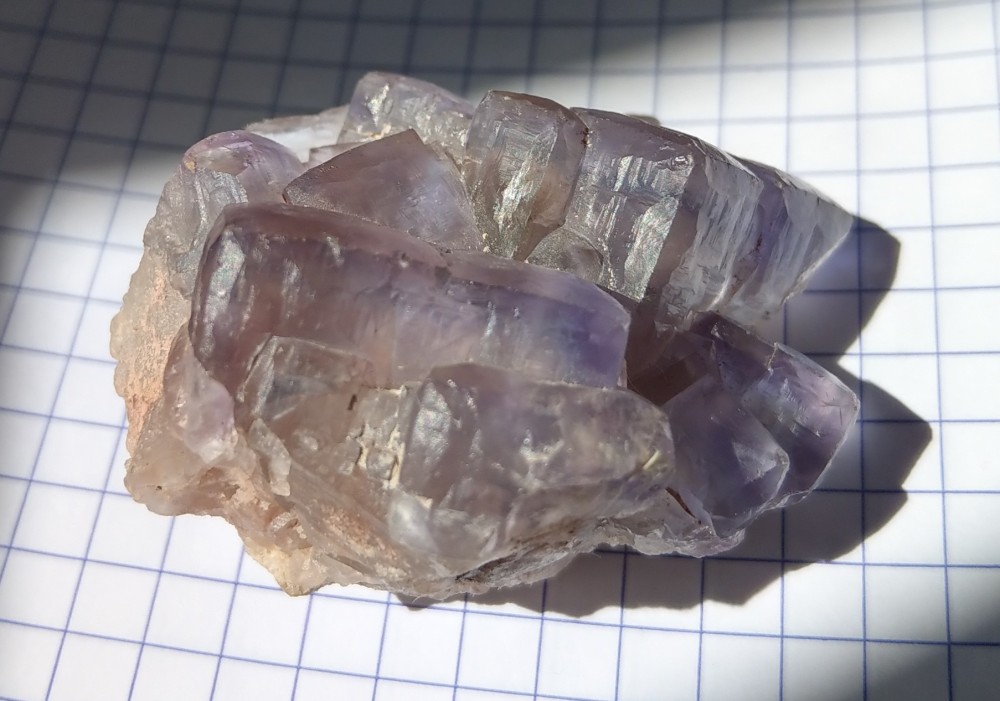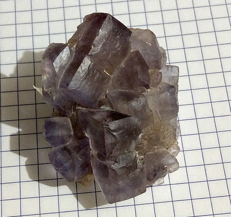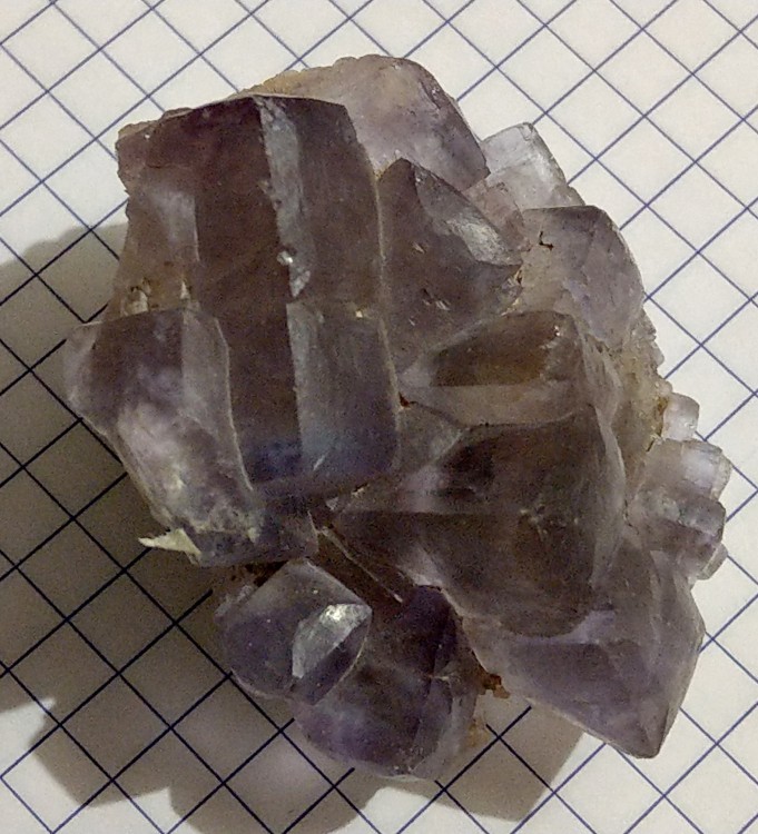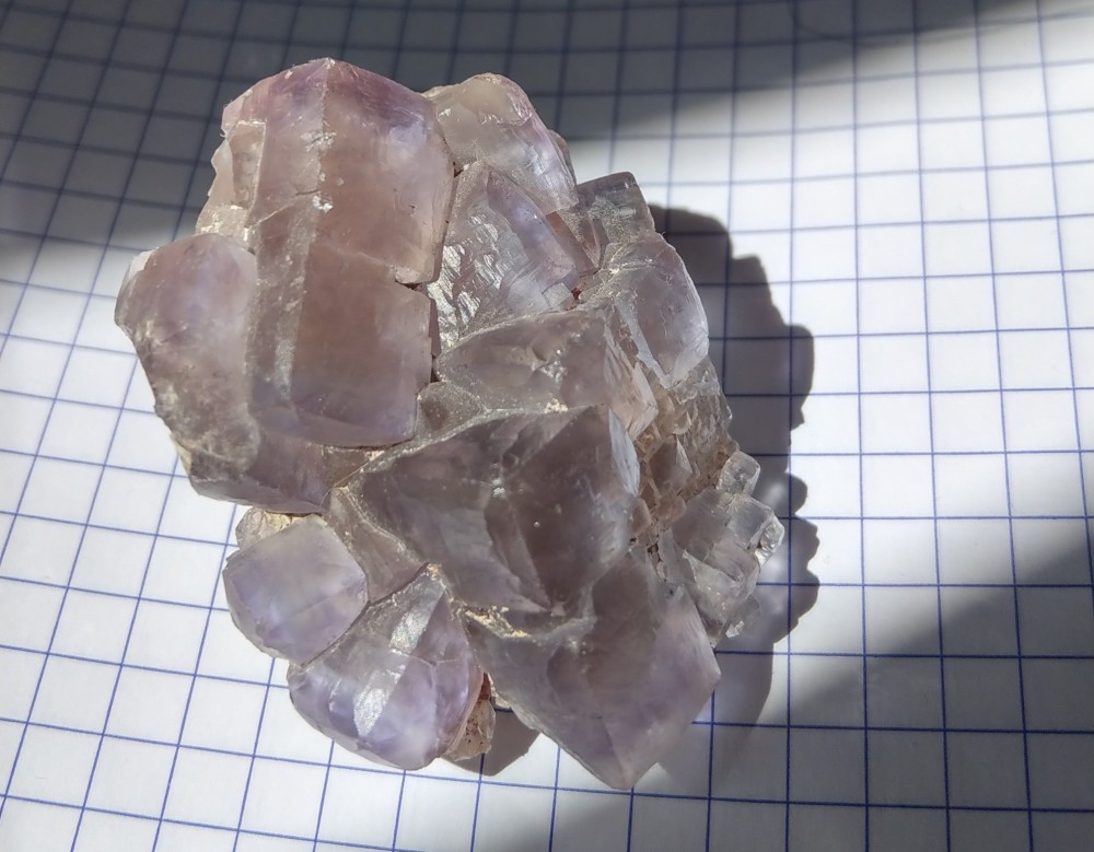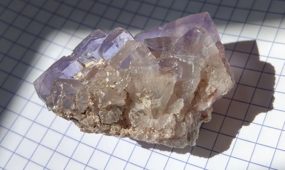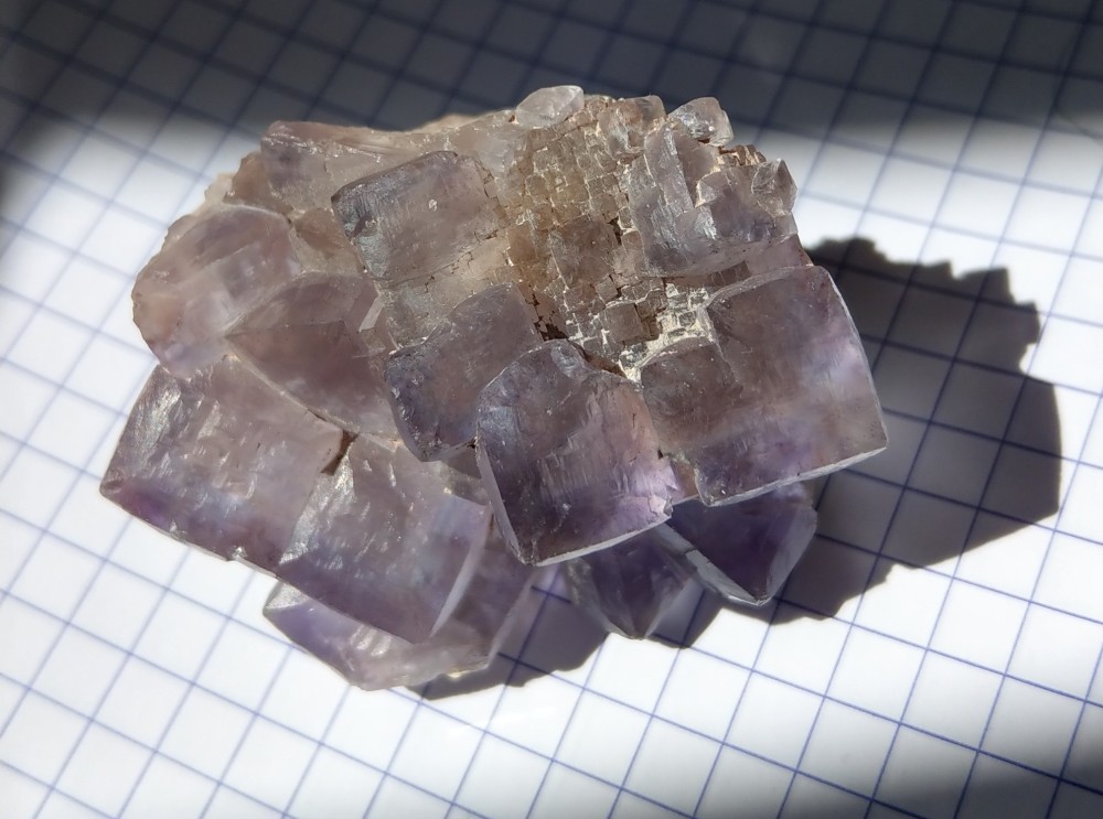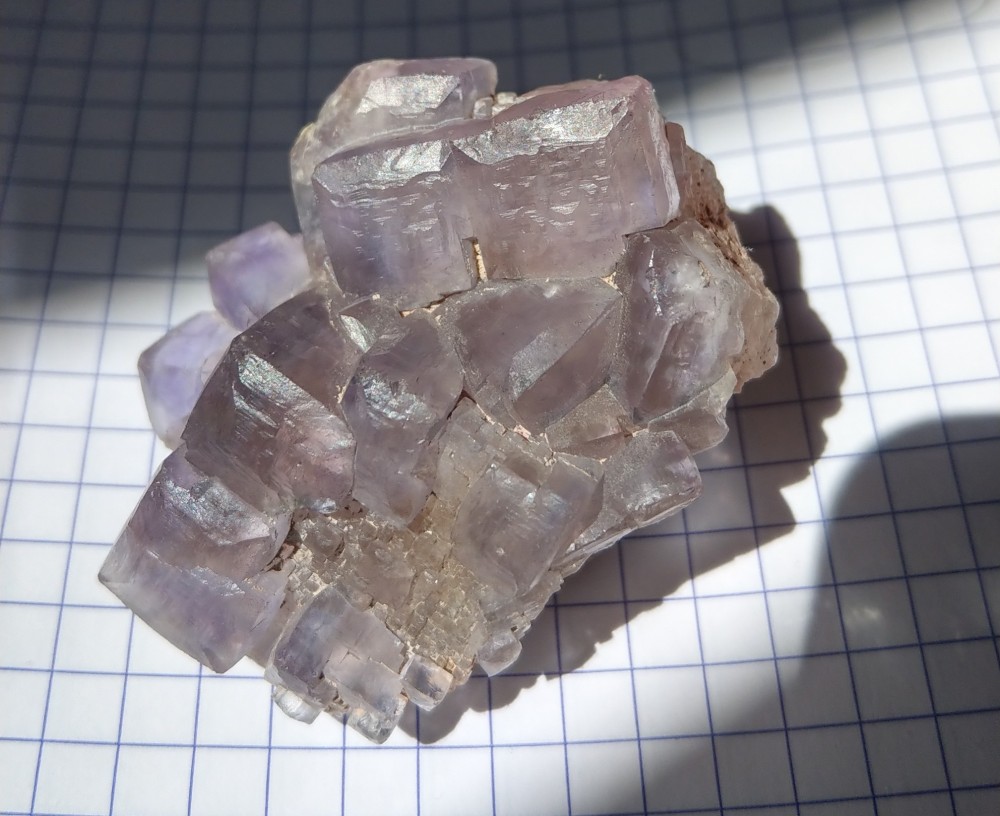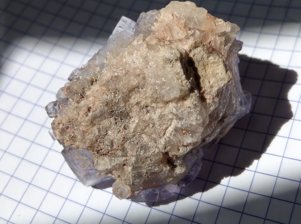 Dans un lot de minéraux divers, se trouvait cette pierre. Elle ressemble vaguement à une fluorine, de couleur ... lavande clair, un mauve bleuté. Sa particularité sont ses cristaux cubiques aux faces bombées. J'ai évalué sa densité à 3.6.