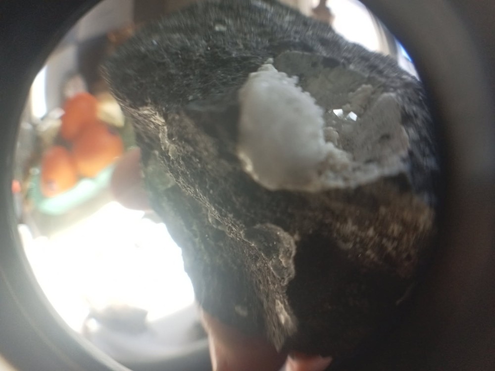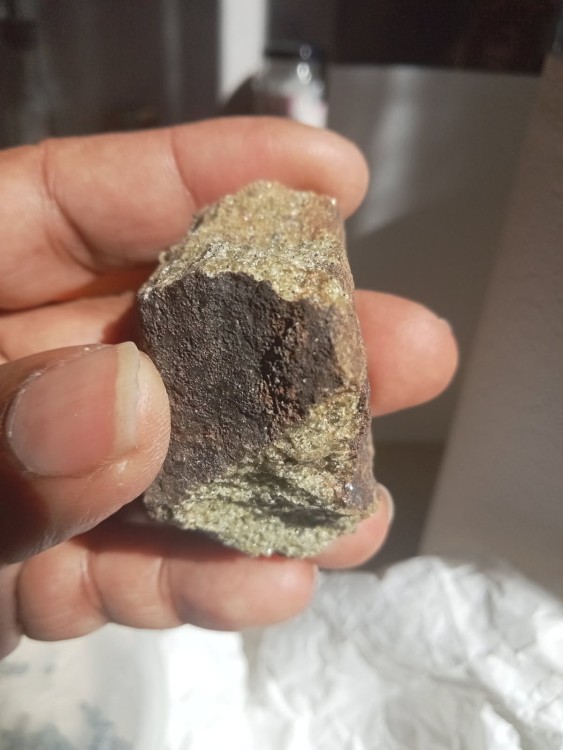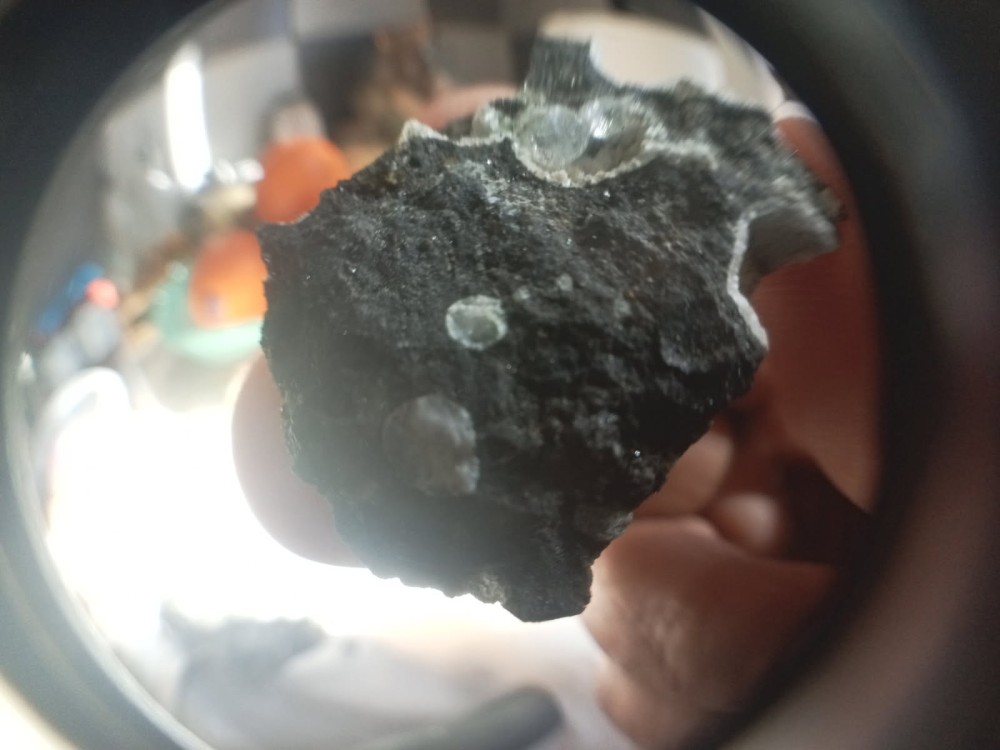 Il est rempli de cristaux jaunes et noire pour certain. Peut-être de la Fayalite jaune 🤷♀️.