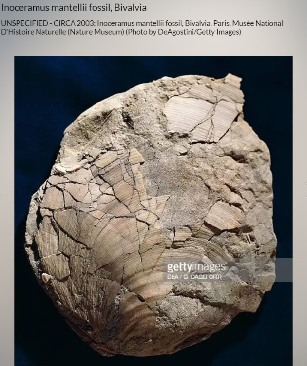 16. Voici une photo d' Inoceramus mantelli du Crétacé très parlante : on y voit comment la coquille écrasée va pouvoir se fragmenter . Il est extrêmement rare de trouver de tels spécimens entiers, sauf exploitation en cours de carrières de craie.