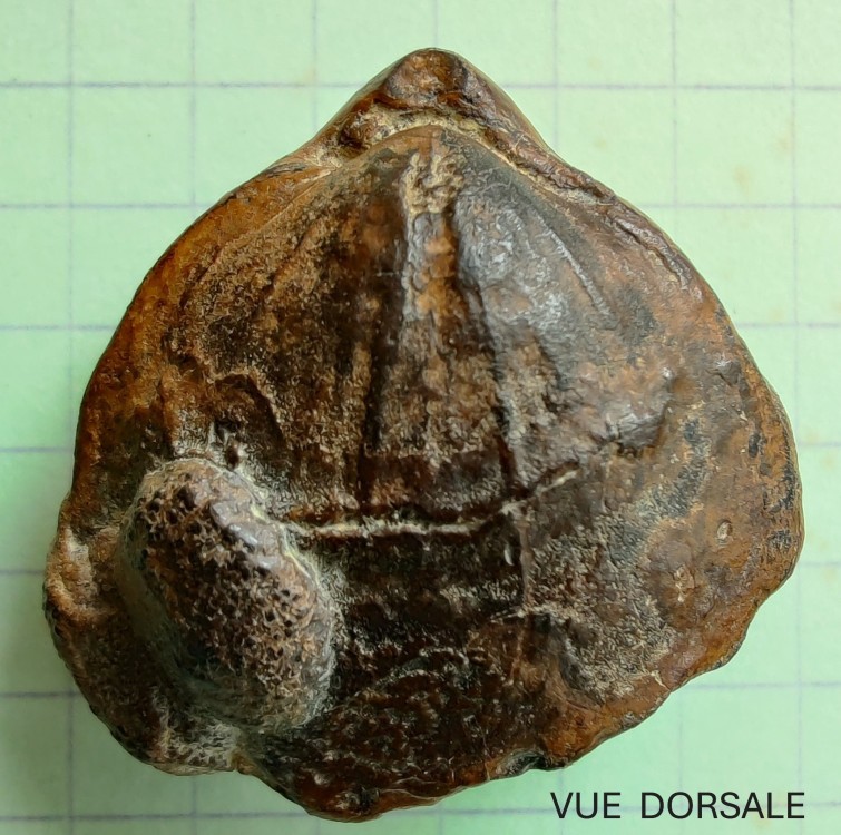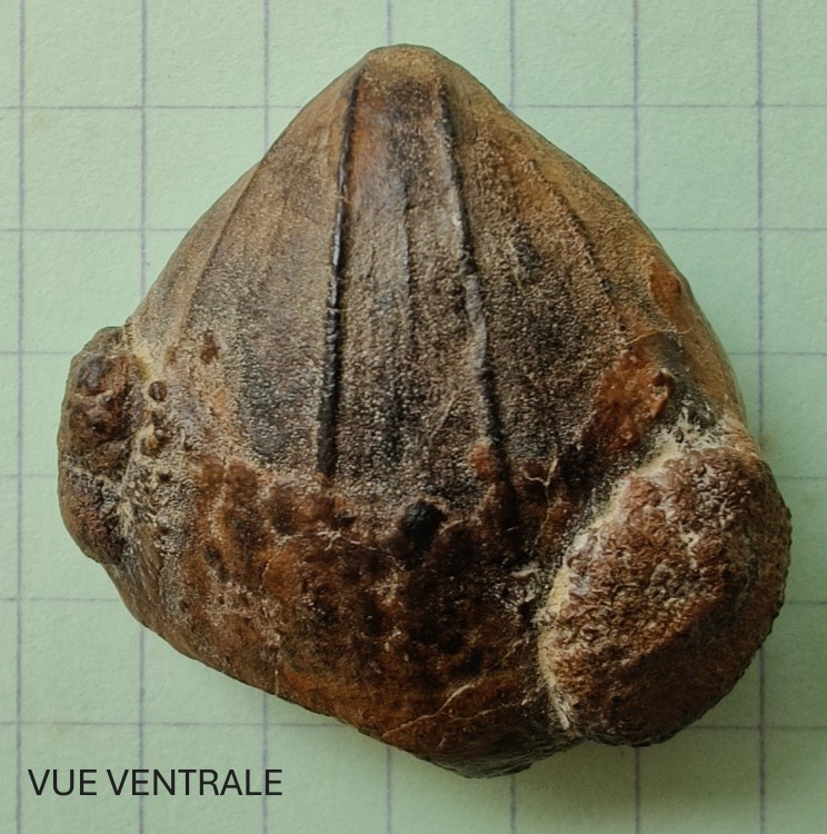 Bonsoir, voici une vue latérale plus précise. La coquille est fracturée au niveau de la valve ventrale, on note un enfoncement semi circulaire sur la valve dorsale et un petit pli en relief qui recouvre les deux valves. Près de ce pli un reliquat de sédiment me donne l'impression d'une perforation (?) -