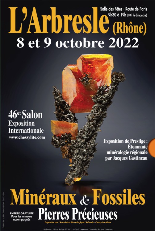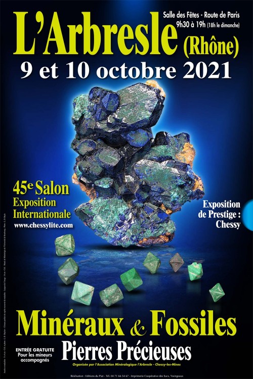 Bonjour à tous, cette année est celle de la reprise tant attendue. Une exposition sur le gisement local de Chessy est à nouveau à l'honneur, car "Chessy bon" de se revoir! Didactique, esthétique. Merci aux grands collectionneurs participants à cette présentation. 40 exposants avec de la belle minéralogie. Voici en attendant l'affiche. A bientôt. Pyroman