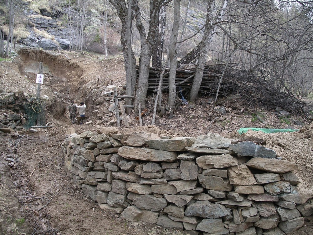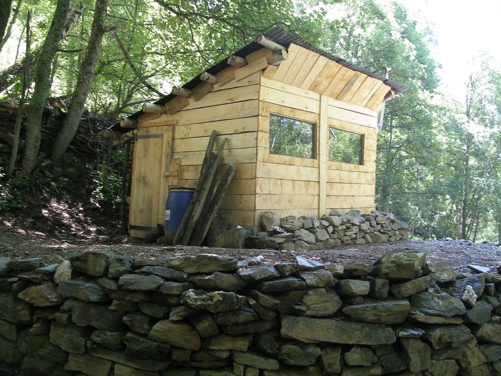 Avec les grosses pierres sorties du travers banc et du puit nous avons construit une plate forme pour deverser les déblais puis une cabane au cas de mauvais temps .Premier éboulis après des orages , des brouettes en plus ,puis végétalisation des abords pour la stabilité du terrain