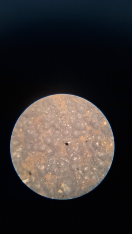 D'ailleurs j'ai aussi trouvé un cailloux avec une fine croûte noire très radioactive, et sous binoculaire jai remarqué ça. Ça doit sûrement être de la pechblende botryoïdale. -