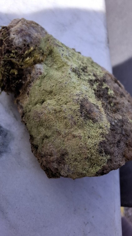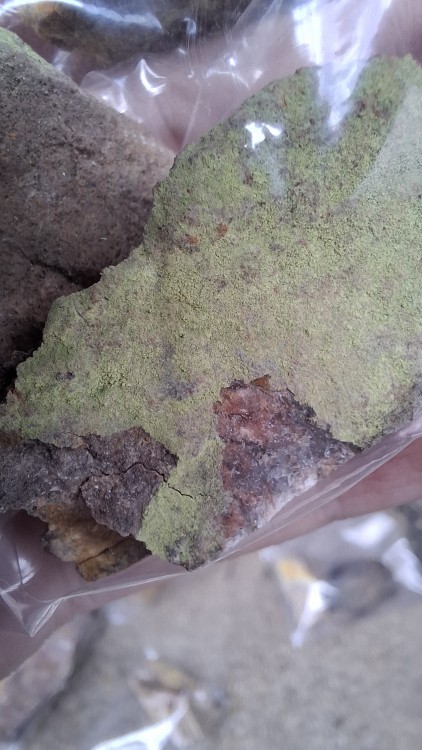 Bonjour, le week-end dernier je suis passé faire un tour à l'ancienne mine de Bertholène à la recherche de cailloux qui piquent et je suis tombé sur cet étrange dépôt d'un vert délavé. Au vu du lieu et de la couleur suspecte j'en ai pris quelques bouts. Sauf qu'après plusieurs recherche je n'arrive pas à trouver de quel minéral il peut s'agir. Le morceau fait 4 cm, la poudre semble légèrement radioactive, et assez volatile, elle est fluorescente orange sous uv 365nm. Malheureusement avec ma binoculaire je ne vois vraiment pas grand chose à part de la poudre, et au microscope ça ne semble vraiment pas avoir de forme particulière. Si quelqu'un a une idée car là je sèche. J'ai pensé aussi peut-être à de la moisissure mais j'en ai jamais vu comme ça sur des cailloux radioactifs, et ça n'a pas trop la forme de lichen non plus. -