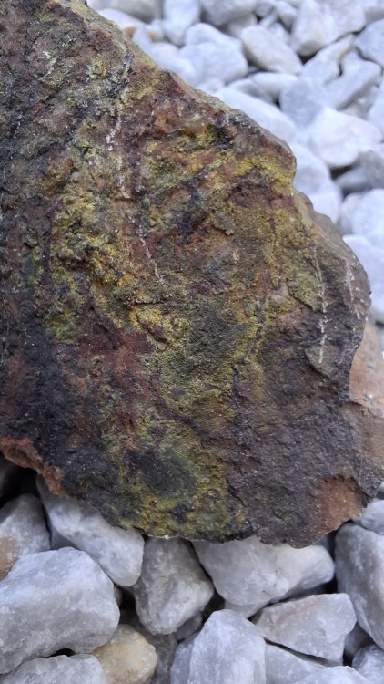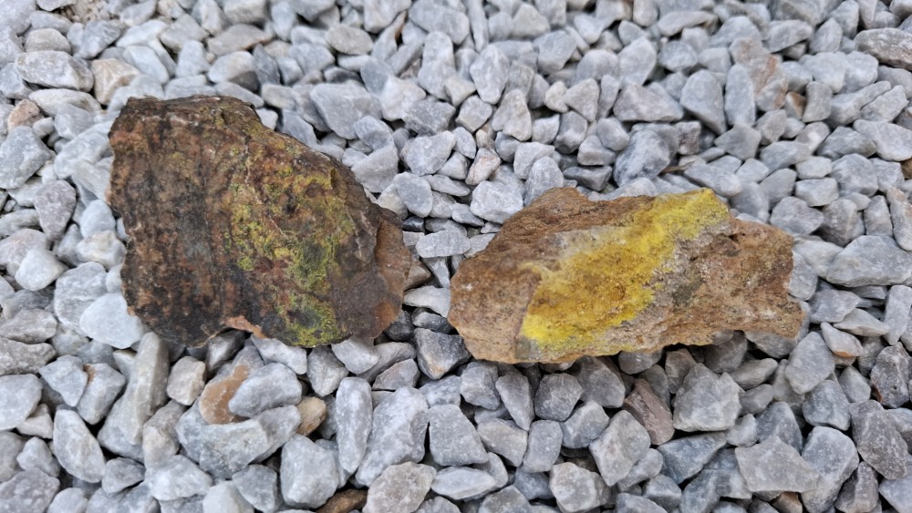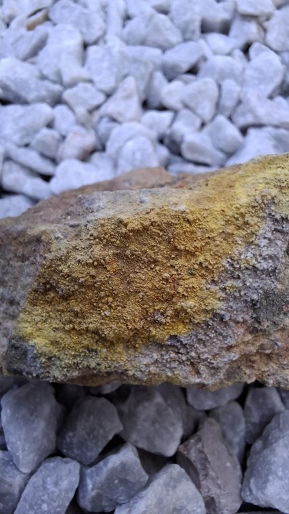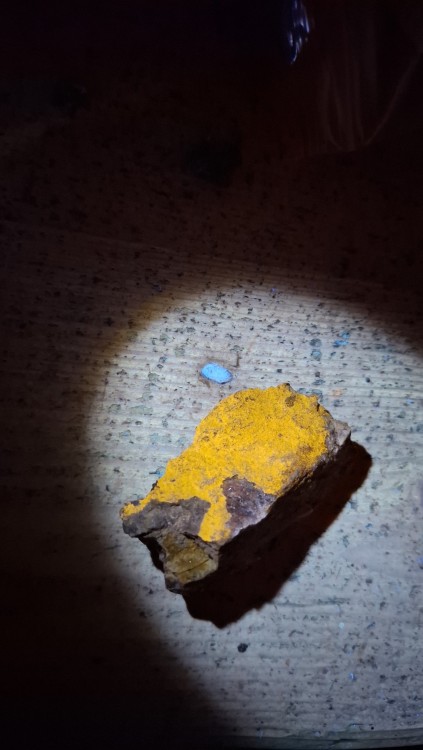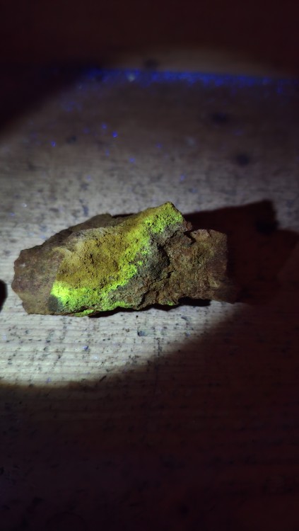Oui c'est Bertholène dans l'Aveyron, et il s'agit bien de l'ancienne mine de charbon reconvertie en mine d'uranium à ciel ouvert dans la seconde moitié du 20eme siècle. Et non je ne pense pas que ce soit de la torbernite ça n'y ressemble pas, ni à de l'autunite, que ce soit sous uv, ou même pour la couleur. Et oui sur certains morceaux on voit des figures de dessiccation dans la poudre. J'avais pensé à de la tyuyamunite au départ étant donné qu'il y en a dans le coin mais il ne me semble pas qu'elle réagisse orange sous uv 🤔 -