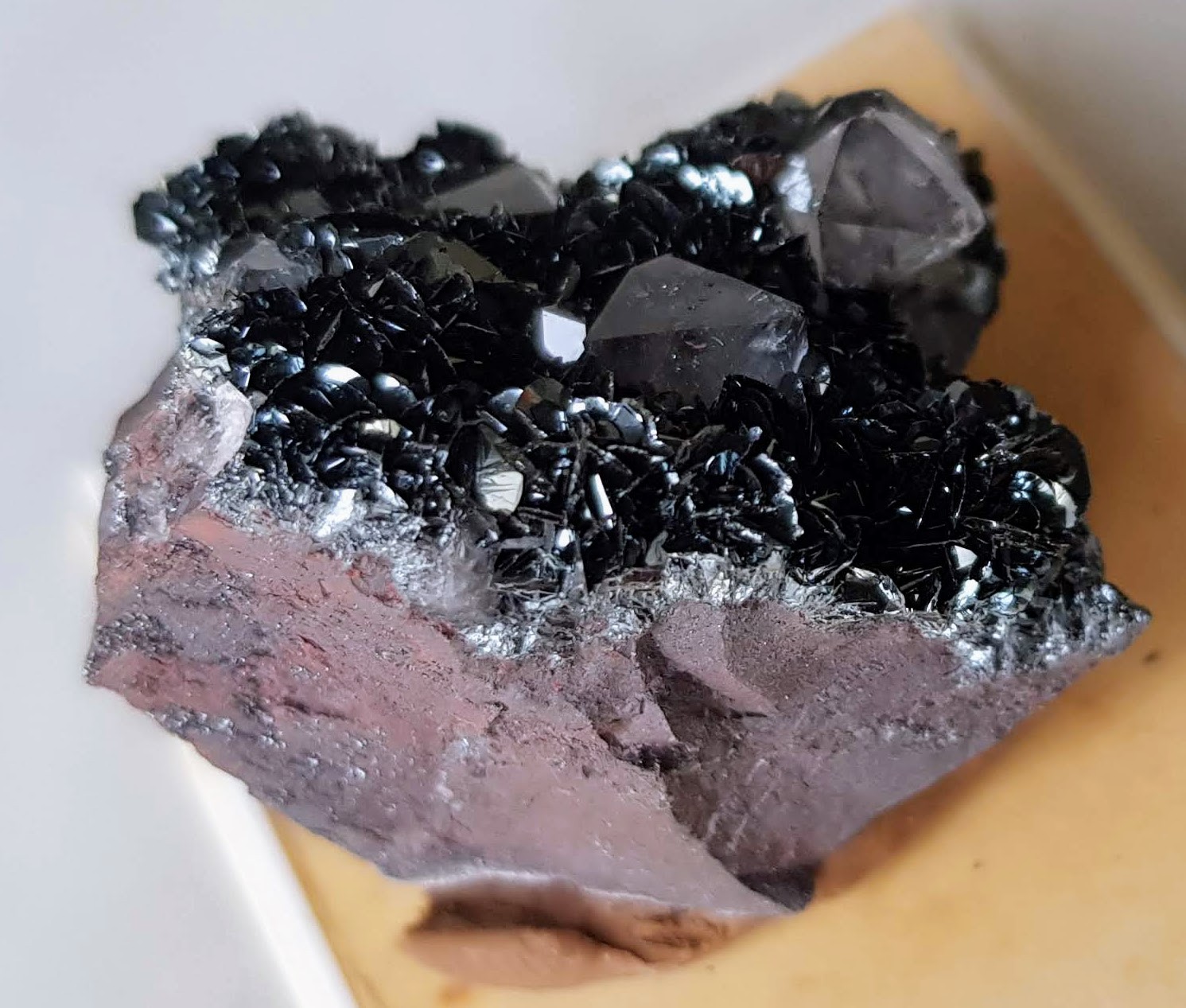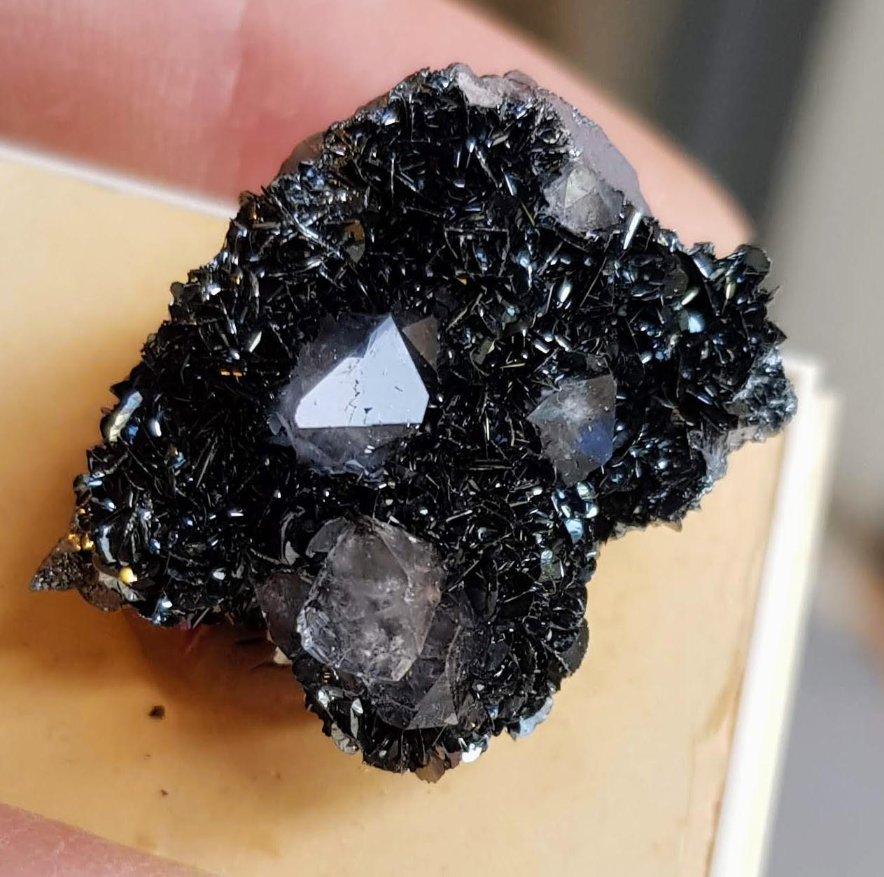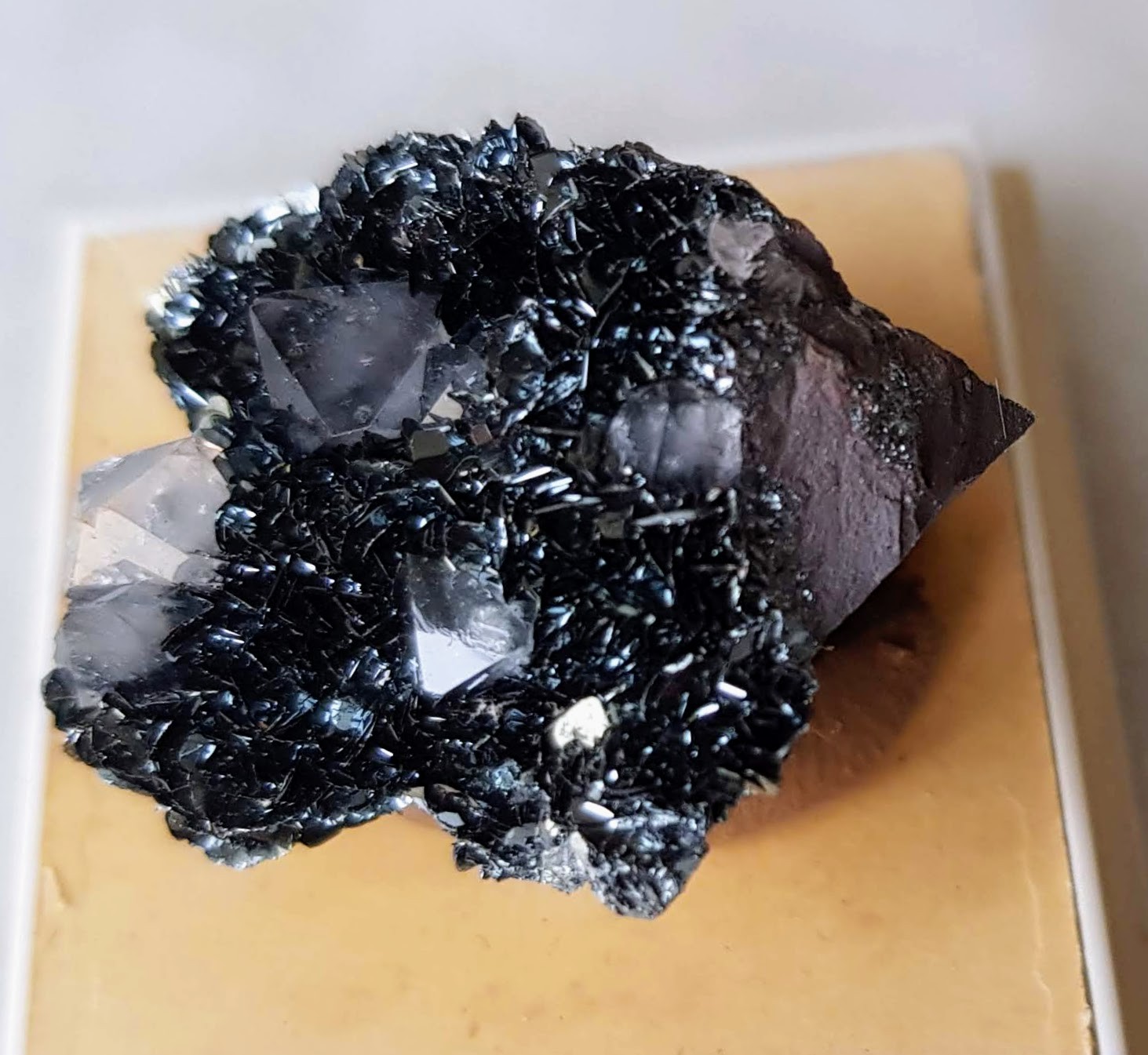 2. Bonjour à tous, Voici un minéral que je n'arrive pas à identifier. Dimension de la pièce: 3 cm 2 minéraux associés sur matrice couleur brun brique - Cristaux transparents 4 ou 6 faces types quartz ou calcite, taille 4 à 5 mm - Cristaux noirs (à reflets bleutés) taille env. 1 mm Dureté: élevée à priori Provenance : inconnue > Photos en pj Si vous avez une piste, merci d'avance :-))