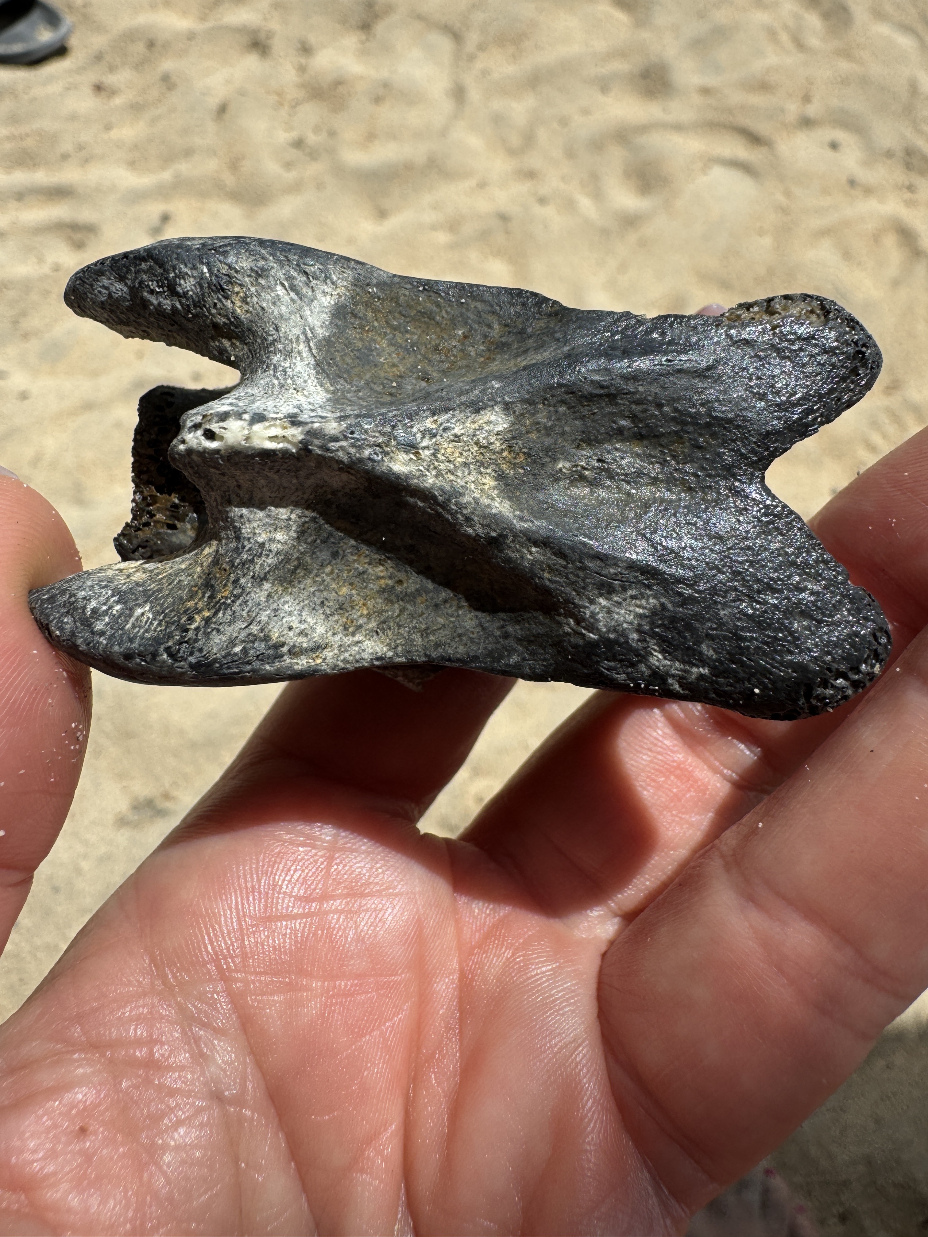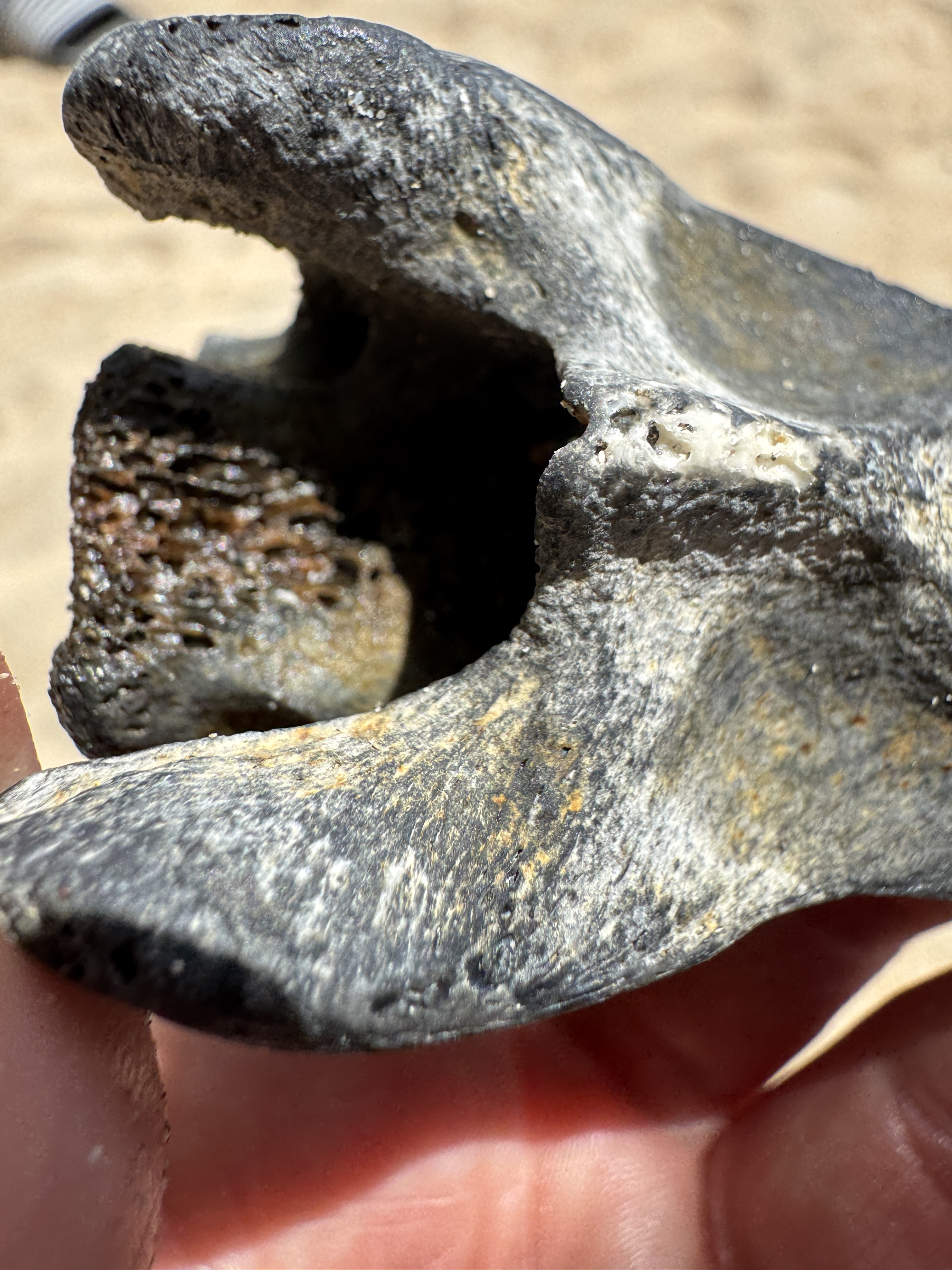 Il s’agit probablement d’une vertèbre de cétacé (comme un dauphin ou une petite baleine). Les cétacés (comme les dauphins) ont des vertèbres qui ressemblent à celle que vous avez trouvée, surtout si elles sont anciennes et ont été exposées à la mer pendant longtemps, ce qui peut les rendre plus sombres et poreuses en raison de la dégradation.