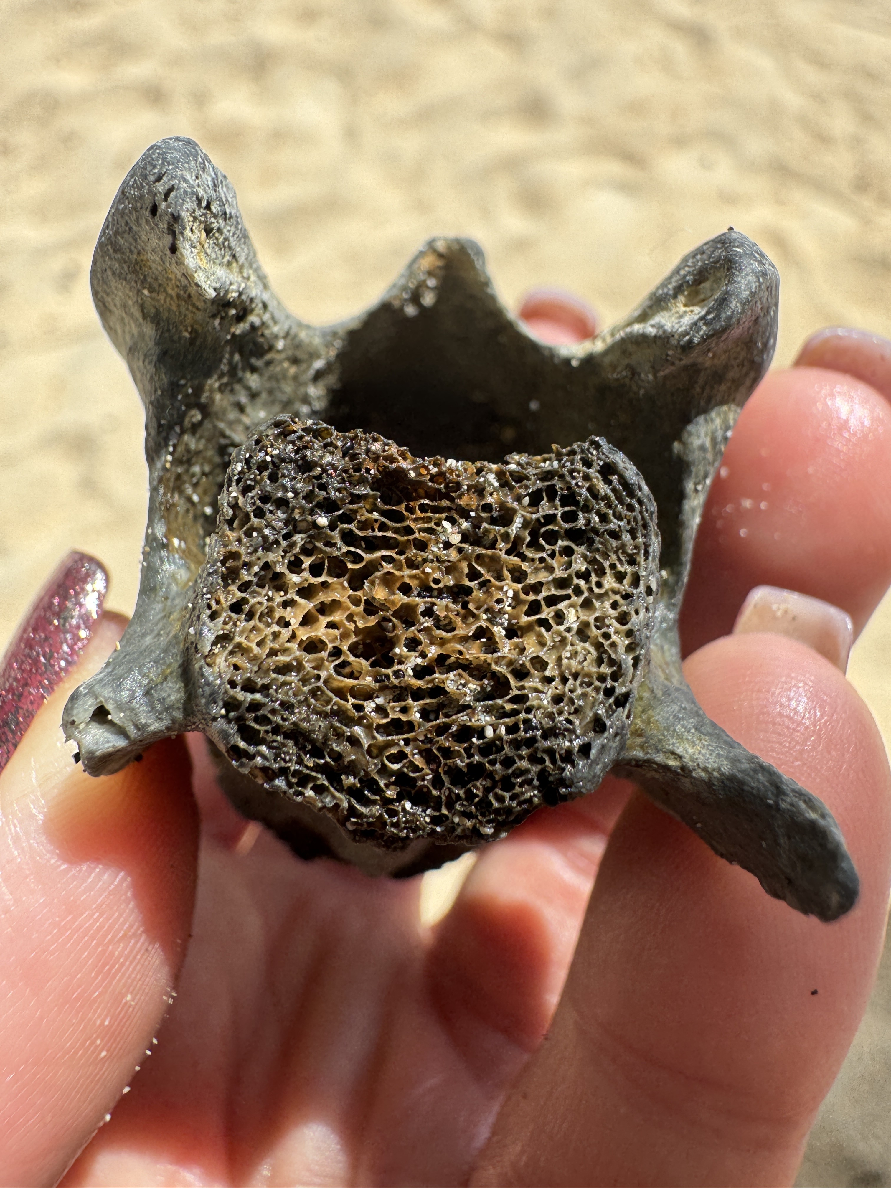 Merci pour les photos ! À première vue, il semble que le morceau d’os trouvé soit une vertèbre, probablement d’un animal marin.