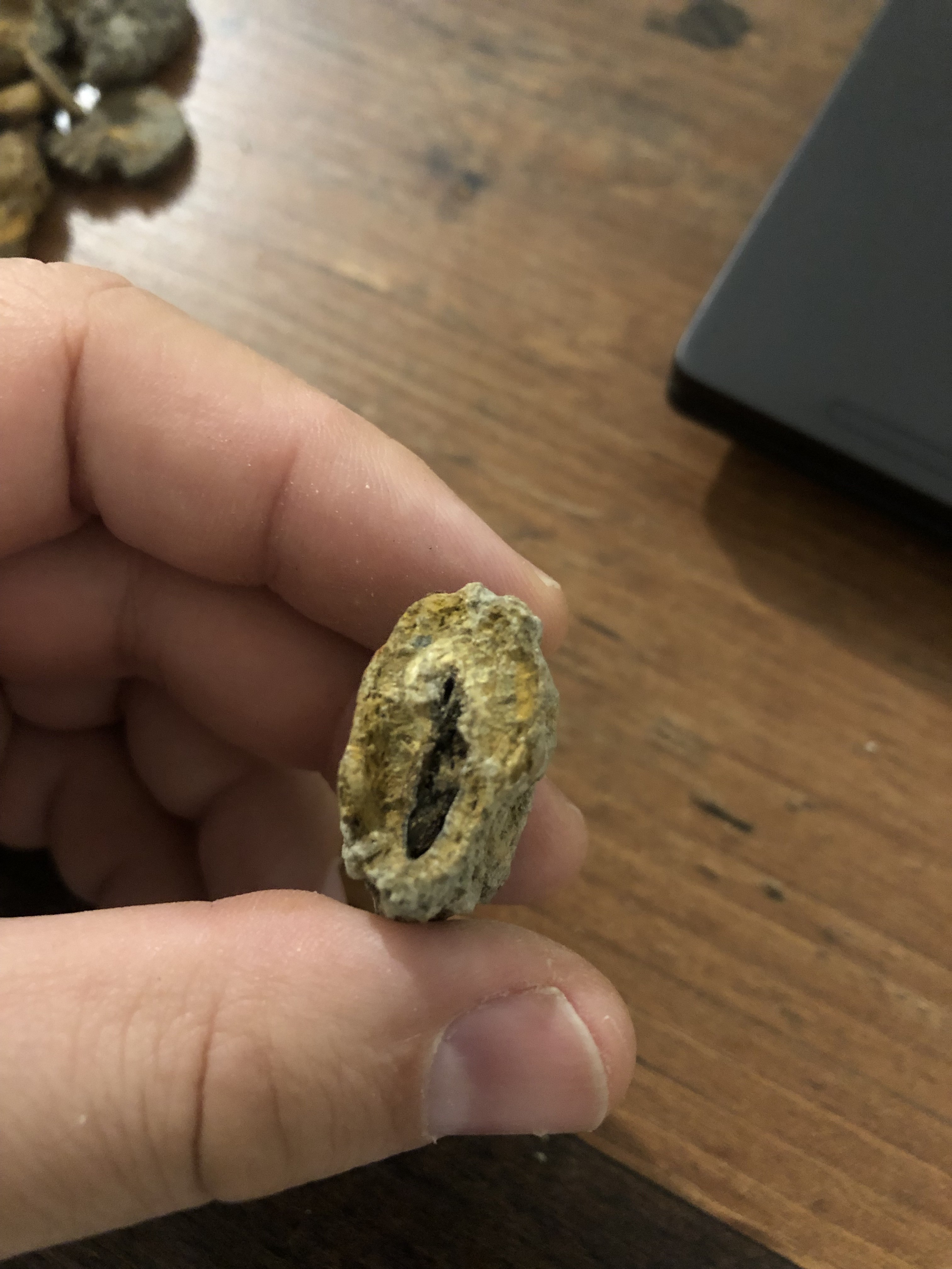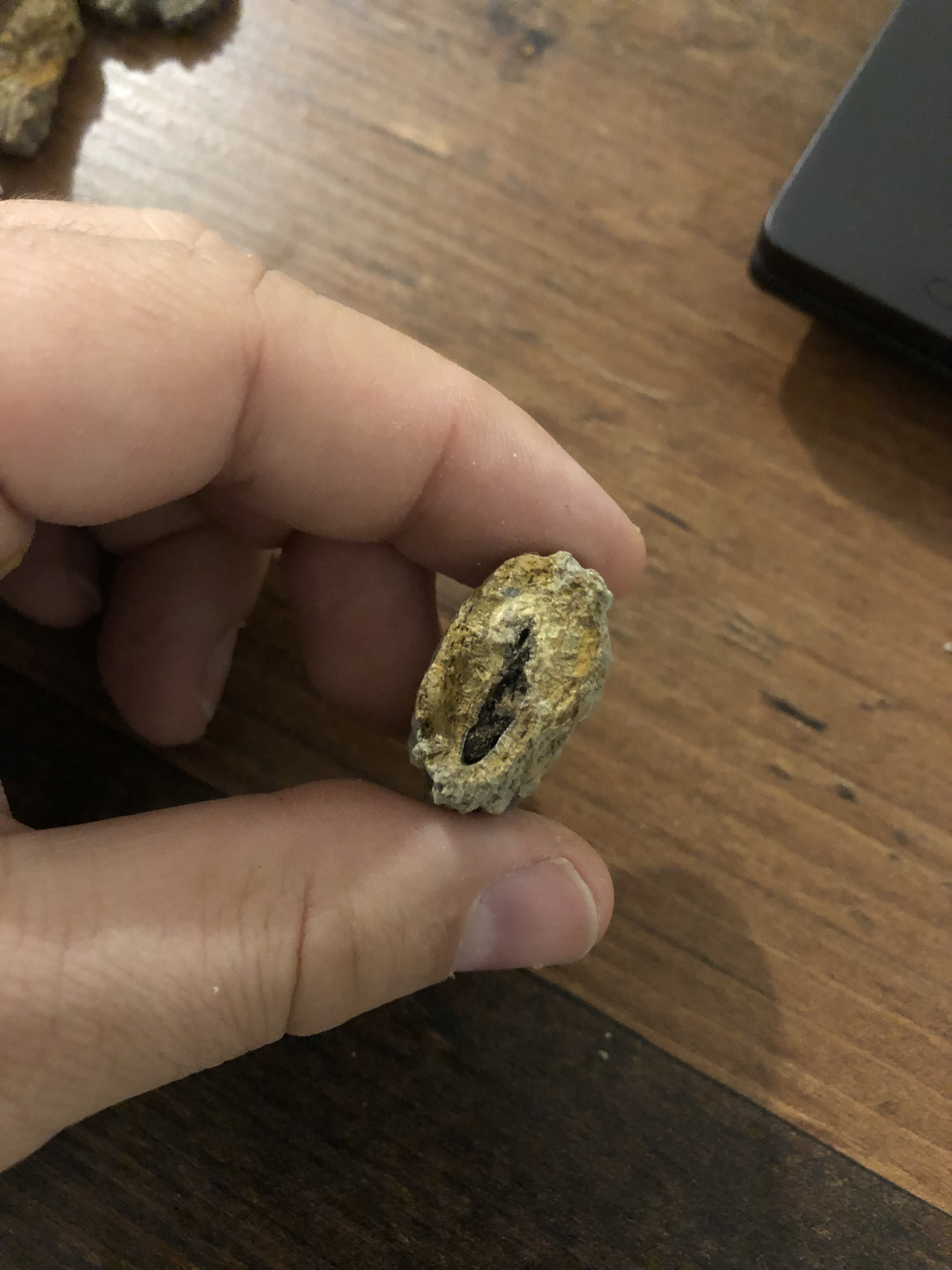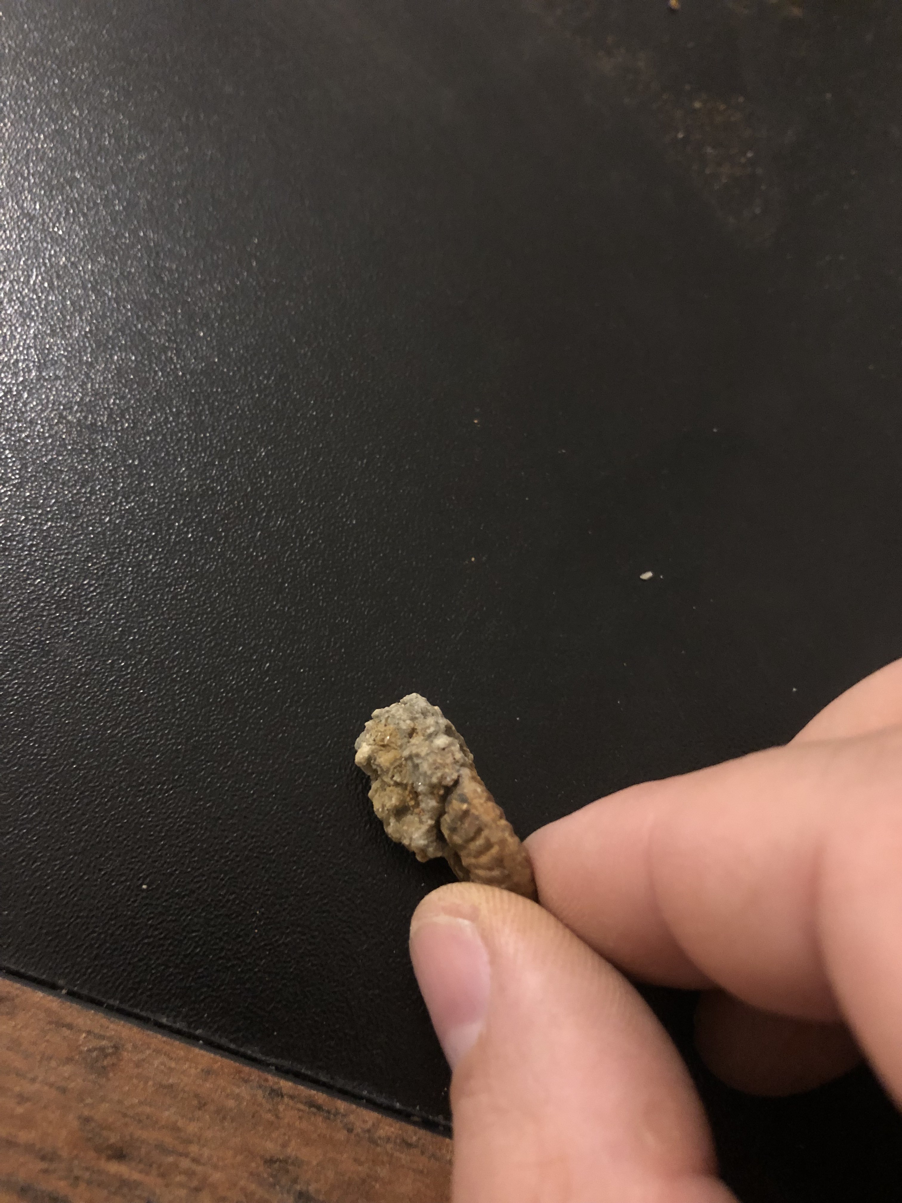 Bonjour à tous, Seconde trouvaille sur une marne aptienne, dont je précise qu'elle était différente de la première. Sur celle-là, très peu d'ammonites, et en mauvais état. Aucune bélemnite de trouvée. Quelques bivalves...et puis cet objet en forme de bâton, friable, qui s'est cassé dans ma main. Je n'en ai conservé qu'une partie avant de remarquer que l'intérieur comportait une colonne vertébrale. On dirait une portion d'un poisson en forme d'anguille. Et dont l'intérieur comporterait encore ce qu'elle avait mangé. Quelqu'un a-t-il déjà trouvé quelque chose de similaire?