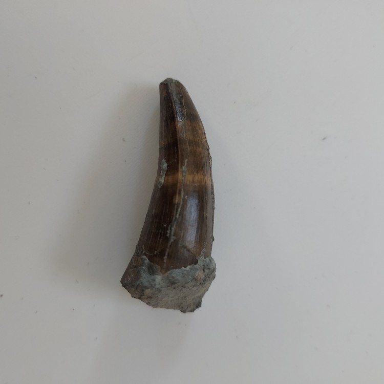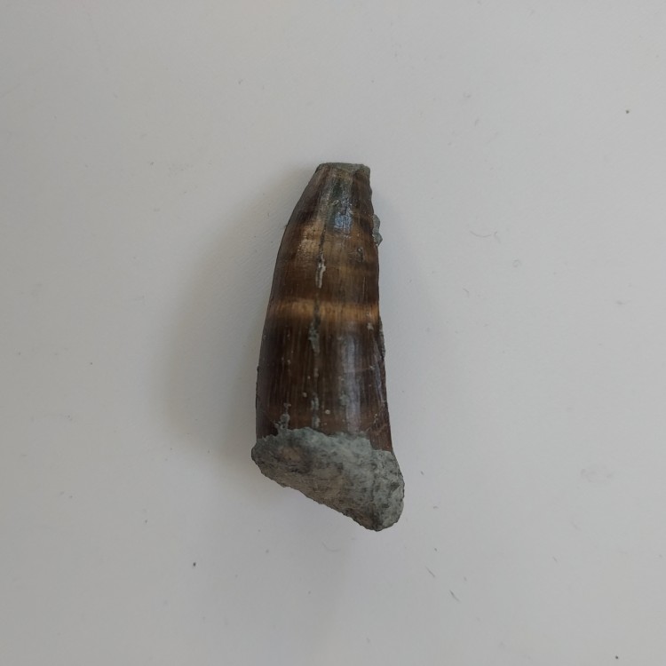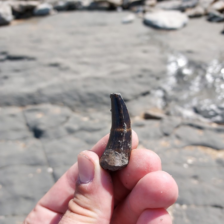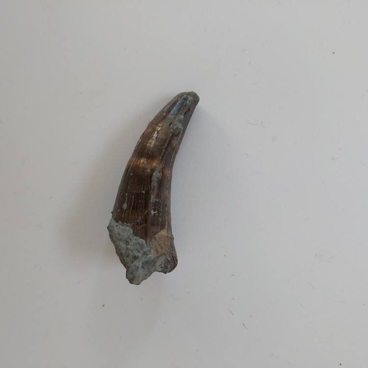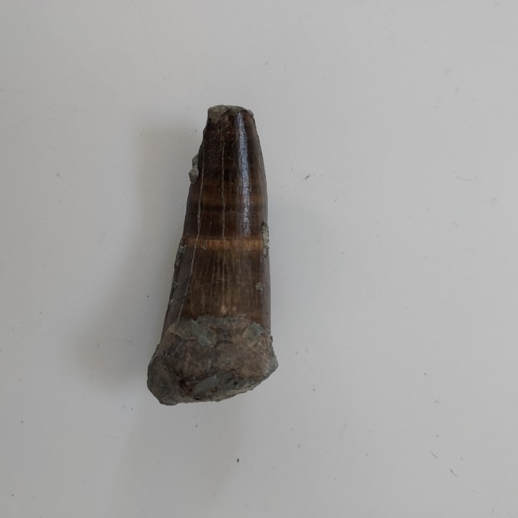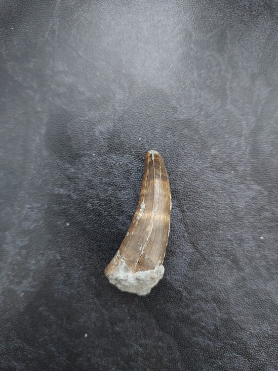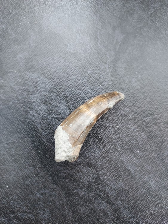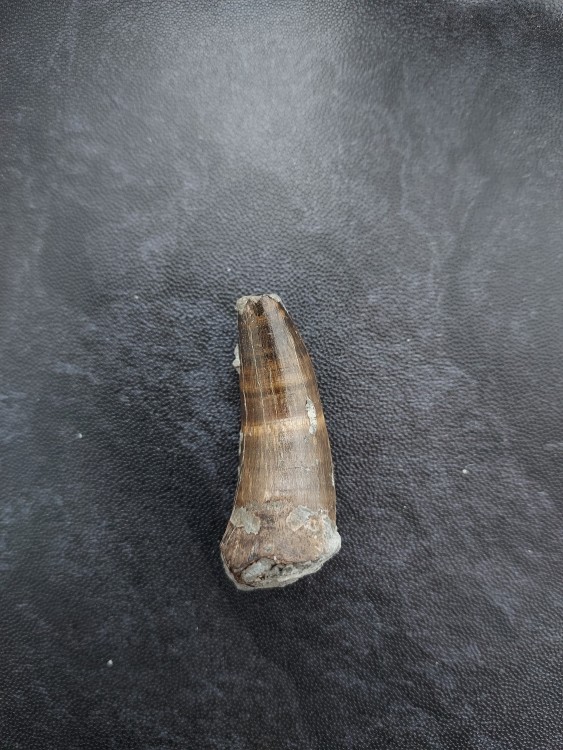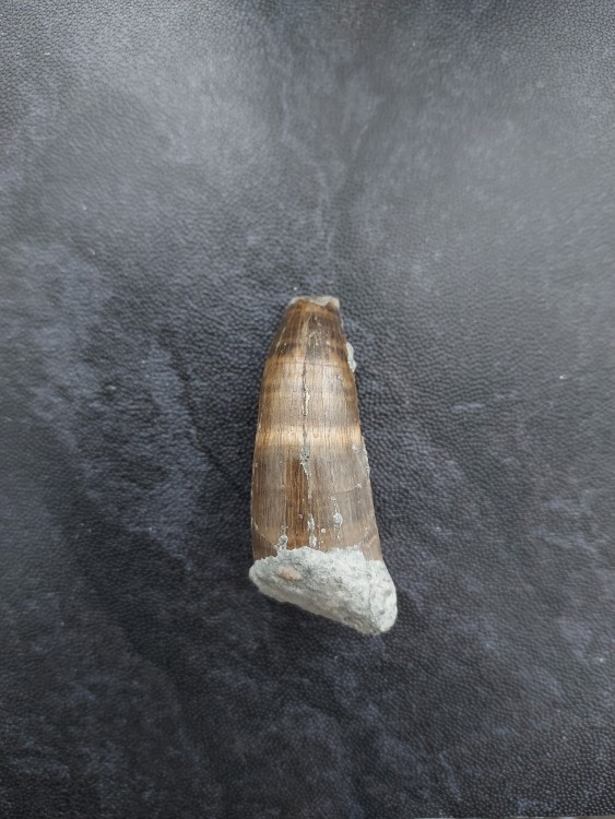 Bonjour à tous, je suis nouveau sur le forum et j'espère que mon premier poste ne sera pas maladroit. Voici une dent que j'ai découvert le mois dernier sur la marne de Dive il me semble (sédiments gris clair) entre Houlgate et Viliers-sur-mer. Une personne plus compétente que moi en la matière m'a orienté vers Dakosaurus maximus pour l'identification, et j'aurai aimé avoir vos avis en espérant que les photos que je vous transmets le permettent. Longueur totale : 45mm Longueur de la couronne : 37mm Largeur à la base de la couronne :20mm __________________________ Ma deuxième question concerne la conservation de ce genre de fossile, je ne l'ai pas nettoyer mis à part un essuyage au moment de la découverte par peur de faire une bêtises, on m'a dit que les sédiments à cette endroit pouvaient être capricieux une fois ramener à la maison (ammonites qui tombe en morceaux par exemple) Et donc, est-il nécessaire de retirer les sédiments à la surface de la dent ou vaut-il mieux les laisser ? Et est-ce que l'application d'une dilution pour la solidifier est nécessaire ? Merci beaucoup pour le temps que vous accorderez à ma requête !