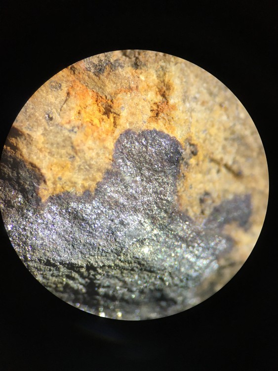 A ce niveau, la galerie est vraiment remarquable et très belle à observer 😃, la voûte culmine à plus de 3 mètres de haut. En bas le renfoncement est celui indiqué sur le plan de Marcel Baudouin "galerie obstruée". Un peu de compagnie, de nombreuses chauve-souris en phase d'hibernation peuplent la mine. L'entrée de cette galerie obstruée Surprise qui semble confirmer l'état des lieux de Dietrich, les eaux y stagnent et devaient rendre l'air particulièrement malsain. Longueur 4m, hauteur 1.4m (1.8m dans l'eau), largeur 1.30m. L'obstruction donnée par Baudouin n'est pas clairement visible et il pourrait bien s'agir de la fin de la galerie tout simplement. Si peu de minéralisations ont été observés jusque là, cette partie de la mine en donne à observer. Il y a deux "veines" assez fines couleur ocre d'aspect noirâtre. Comme on le voit ici il y a un "rond" de la même couleur assez massif (plus de 10cm). La surface est très altérée par l'humidité ambiante, ce qui forme une couche ocre friable et molle avec parfois des grains de quartz. En prélevant et observant un échantillon à cet endroit précis on observe de petites veines brillante qui font penser à du galène. -