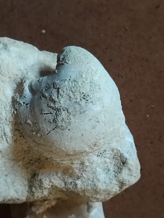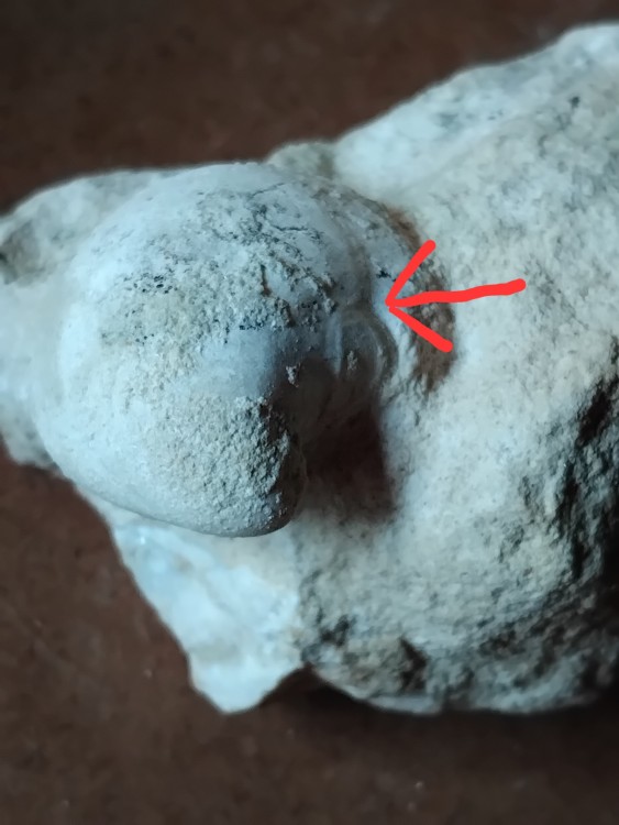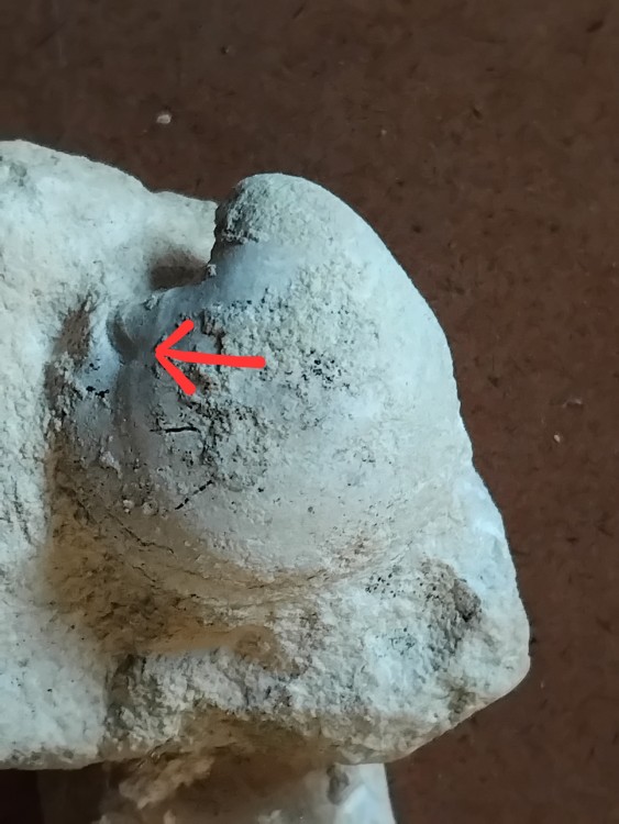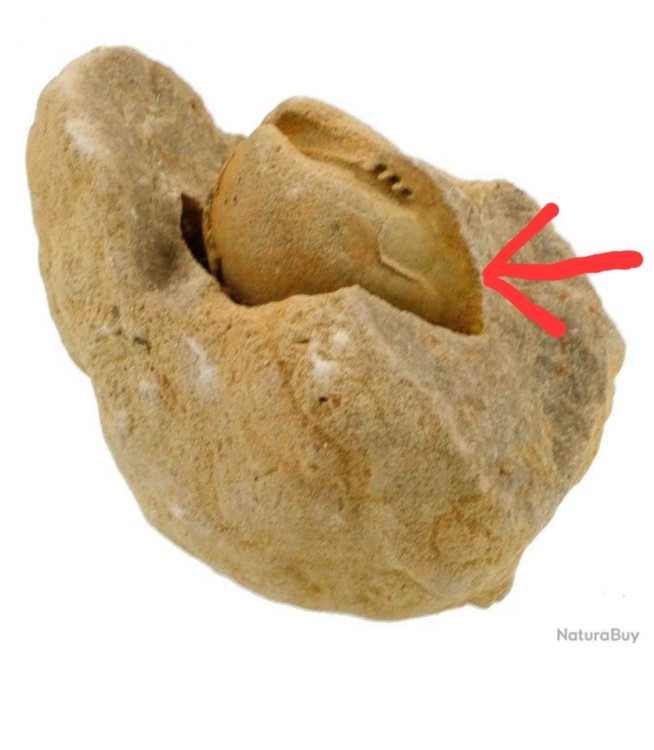 Ce que je n'arrive pas à retrouver c'est la fossette indiquée par la flèche rouge... Et il y a ce morceau plat qui se trouve en dessous de la coquille entourée en rouge ( Peut-être rien à voir! )...