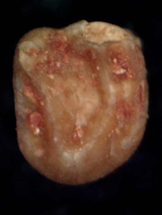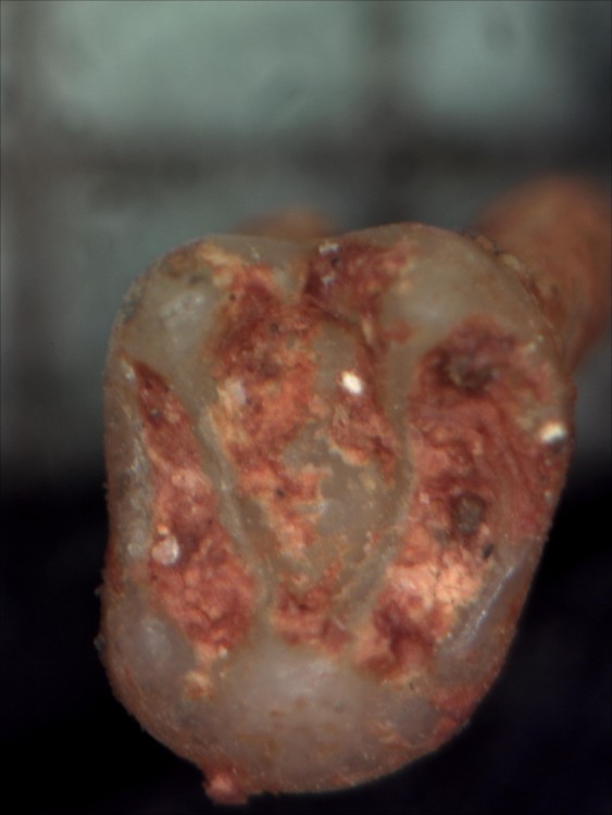 14. Bonjour Ø extérieur 7mm. la forme de la surface d'usure est-elle la marque d'une amplitude de déplacement de la mandibule? et donc un caractère évolué ou primitif? Merci.