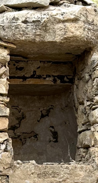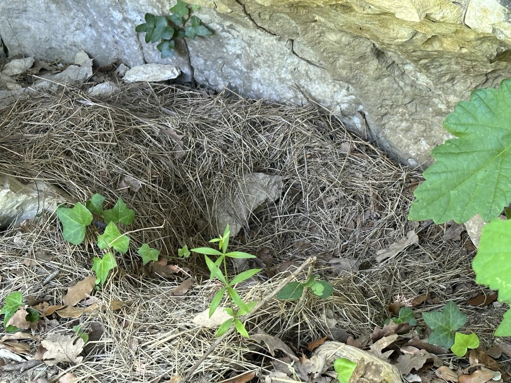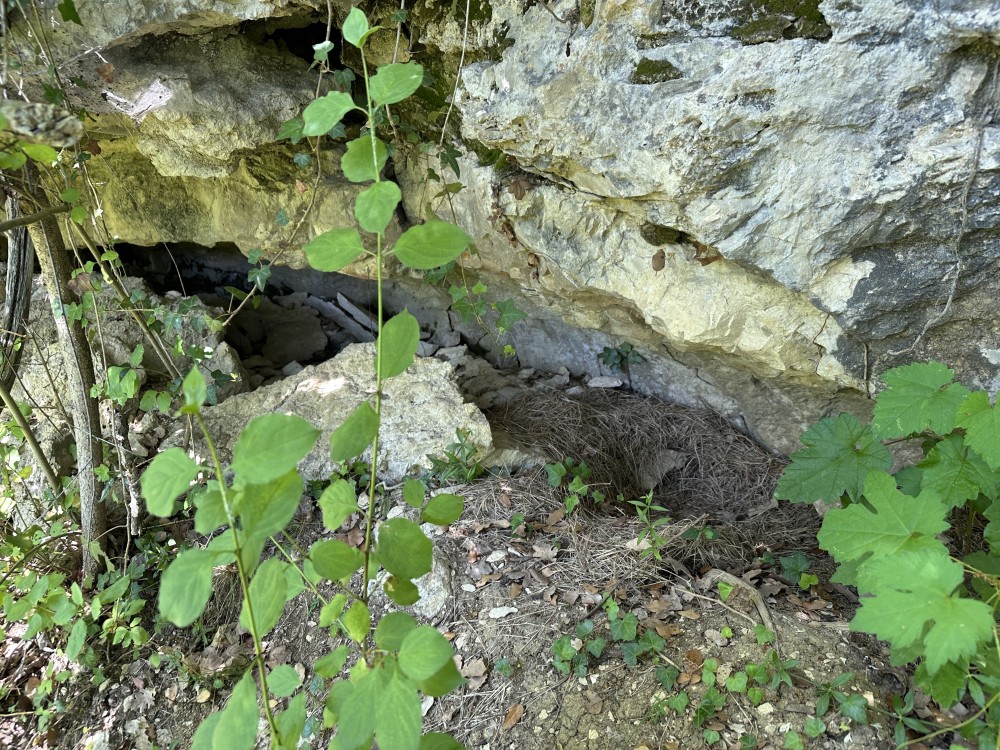 J’y retournerai dans 2 semaines. Sinon dans le même secteur un ancien nid dans une anfractuosité de la paroi. La végétation actuelle en gêne certainement l’accès par voie aérienne. -