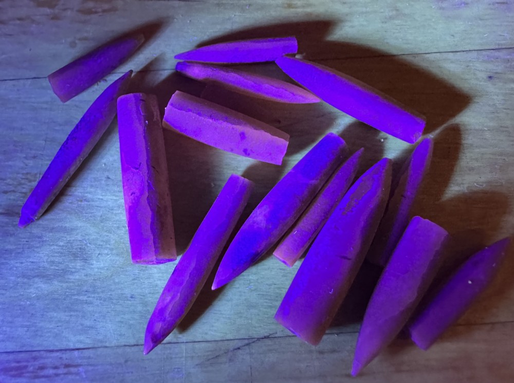 Bonsoir, De quoi sont fait les rostres des petites belemnites que l’on trouve sur les marnes antiennes de La Tuilliere et qui sont luminescents sous UV (395nm) ? Calcite ? Sous UV les couleurs à l’œil sont un orangé( qui apparaît dans rose sur la photo) avec des zones violettes plus superficielles ? la barre = 1 cm Merci pour vos éclairages