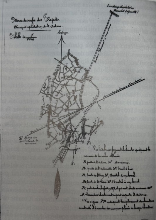 Le seul plan (daté de 1874) que j’ai pu trouver (cité par Pierre Simoni dans « L’industrie dans le canton d’Apt au XIXème siècle », 1992. ISBN : 2-9502875-1-4). Et encore ce n’est que le champ d’exploitation à partir du puits St-Antoine (y a aussi eu un puits Ste-Antoinette) avec la connection avec le travers-banc la galerie Toussaint. Si vous trouvez d’autres plans je suis intéressé. -