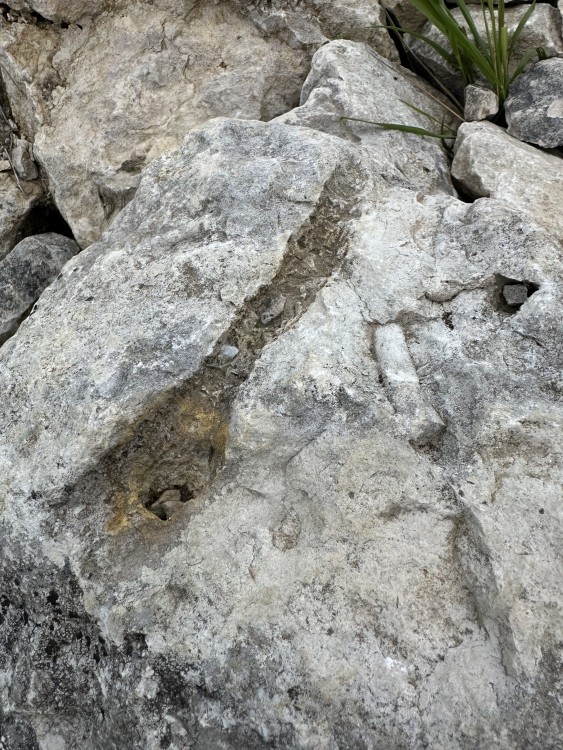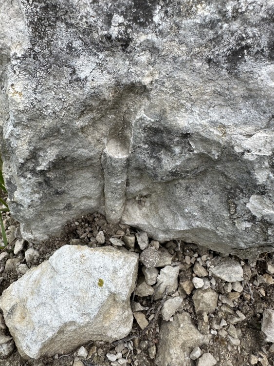 À proximité des anciennes carrières souterraines de Pédégas de Belbèze en Comminges, Ariège (calcaire gréseux du Thanetien ? calcaire Ilerdien de Mancioux d’après la carte 1/50000?) Sur un bloc deux structures pour lesquelles je sollicite vos avis. -