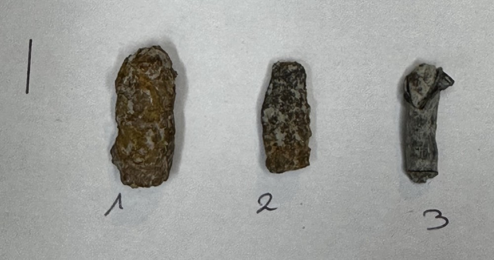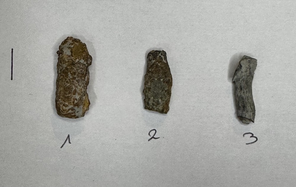 Sinon sur le même site de la Tuillière que les belemnites j’ai ramassé ces 3 fragments de je ne sais quoi. Si vous avez des idées quant à leur origine… (la barre 1 cm et absence de fluorescence aux UV 395nm) -