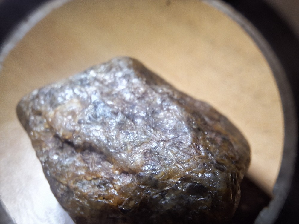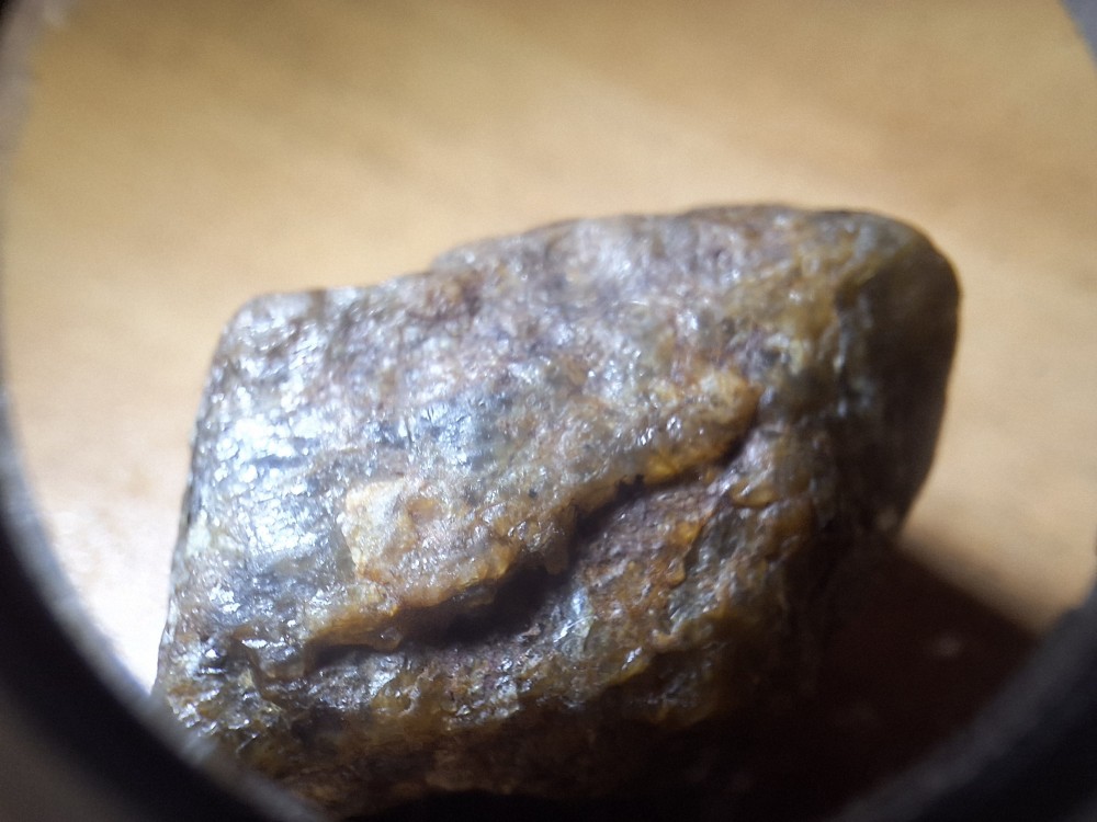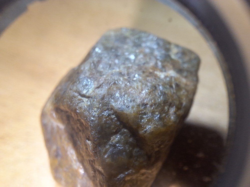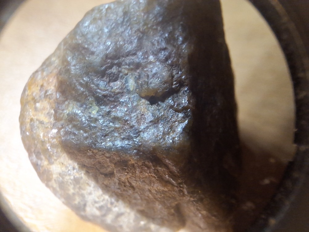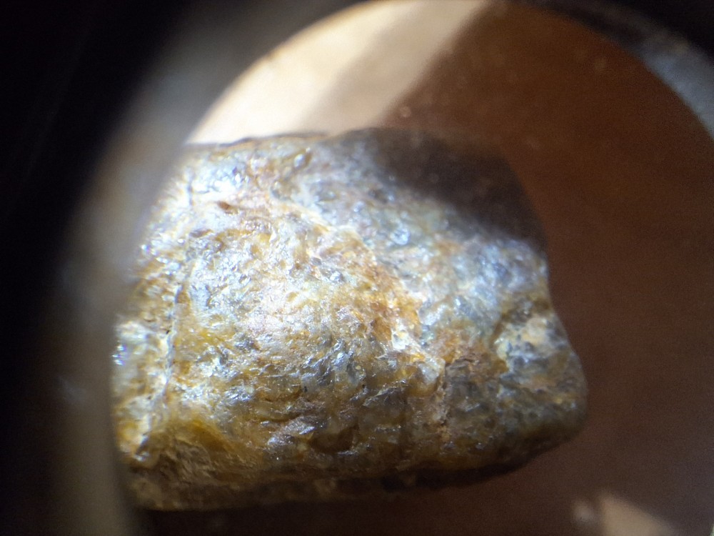 J'ai pris des photos plus rapprochées : Avec la loupe je vois un peu partout des zones "cristallisées" oranges légèrement translucides. Les zones de "falaises" ont l'air d'avoir été un peu érodée ce qui donnerait des facettes plus géométriques ... Peut-être ! J'envoie une photo de la zone que vous vouliez voir juste après ! La zone en question : Et je vais aller voir le post qui parle de la densité pour voir si je peux la mesurer -