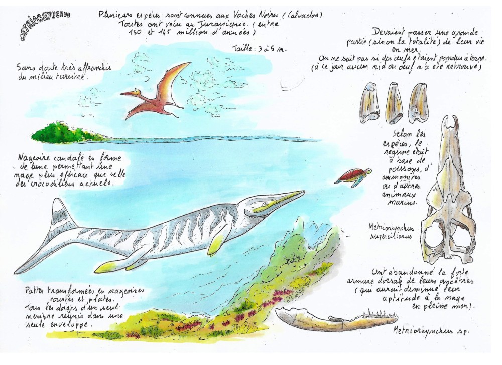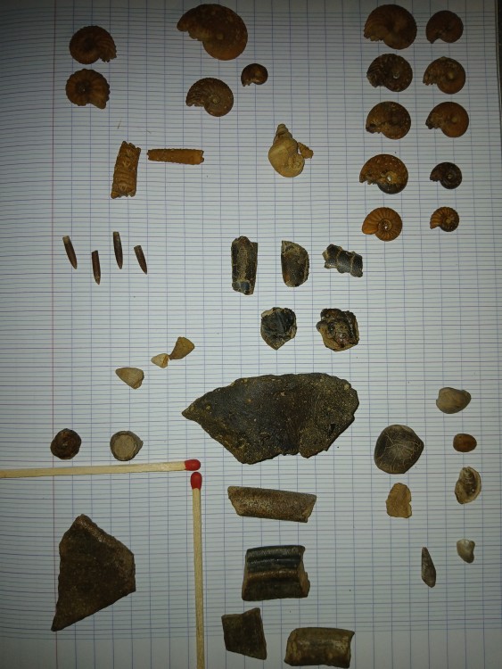 des ammonites, des rostres de bélemnites, des petits coraux solitaires, gastéropodes, fragments de crustacés...