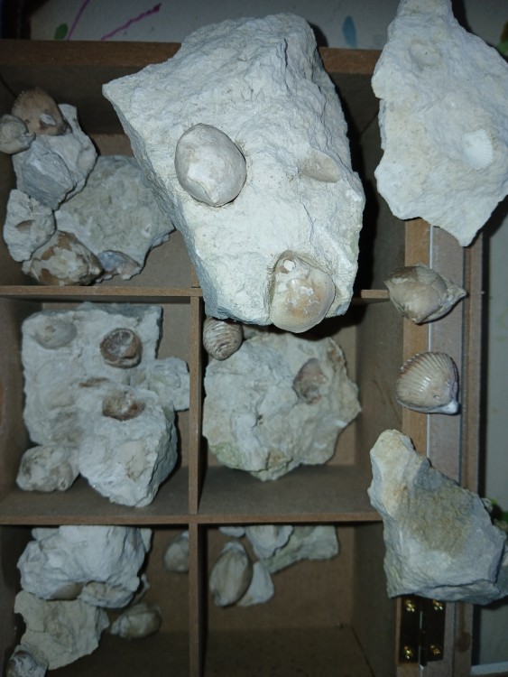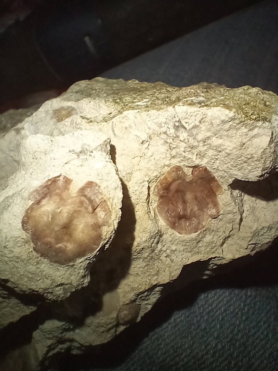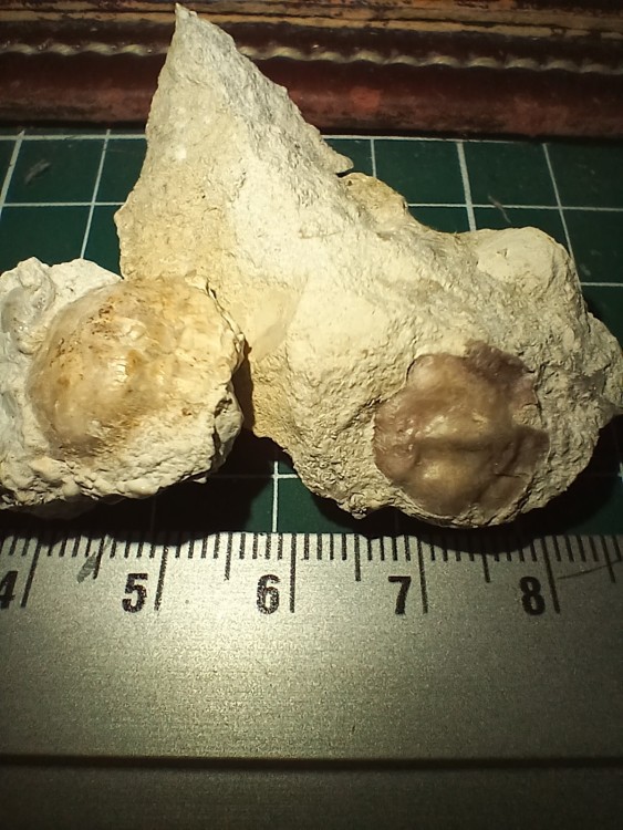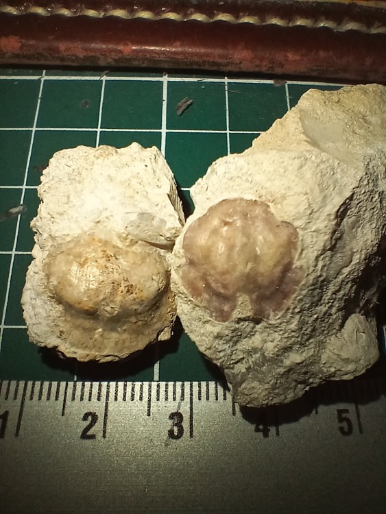 Au pied d'un affleurement (au sud de Tonnerre - plateaux calcaires de Bourgogne) ou se mêlent des éboulis de plusieurs strates j'ai été intrigué par la petite forme bordeau à droite légèrement bombée. La forme n'est pas aléatoire (l'encoche, les petites ailettes...) car j'ai trouvé son sosie dans un autre bloc.