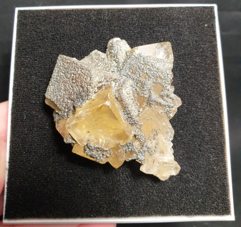 1. Bonjour à toute et à tous, Je reviens vers vos lumières pour peut-être déterminer deux choses : - le gisement d'une fluorine incolore du Tarn? Quelques petits points de sulfures sont observables sur l'échantillon. Je crois voir un fantome bleuté sur certains cubes mais c'est peut être la transparence qui fausse mon observation; D'après mes recherches elle pourrait venir de la mine de Le Burc. Est-ce que ça vous semble possible ? - la provenance générale d'une fluorine jaune à encroutement de sulfure (pyrite probable)? L'allure générale est assez singulière mais je n'ai pas trouvé énormément d'info pour ce type de combinaison en encroûtement. La mine de Montroc a produit des fluorines jaune à encroutement de ce type il me semble mais cette fluo parait moins opaque, plus claire. J'ai également vus des échantillons d'Espagne qui y ressemble. Une idée pour cette fluorine sans racine ? Les deux échantillons proviennent d'une collection datant de la fin des années 1980, début 1990. Merci par avance pour votre aide 🙂 Voici la prremière : Et la seconde :