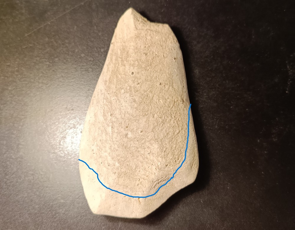 Outre la forme générale qui s'apparente à celle d'une hache en pierre, on voit nettement 2 à 3 négatifs d'éclats au niveau du tranchant sur un côté, et la pierre est polie des 2 côtés dans la partie du tranchant. Le polissage autour du tranchant est bien net et tranche bien avec le reste de la pierre qui est assez rugueux.