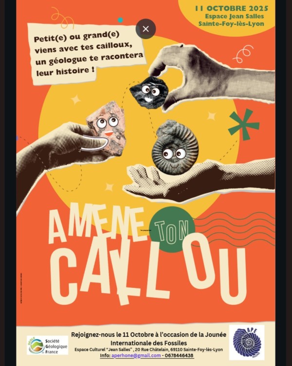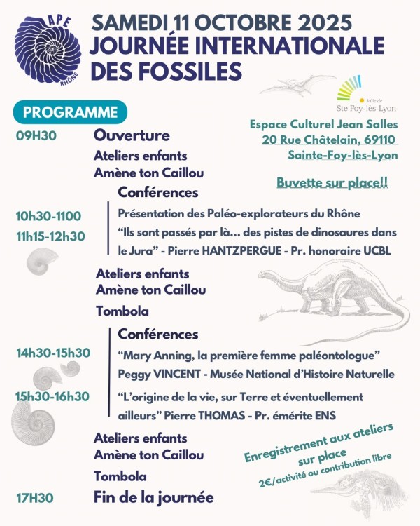 Si vous etes autour de Lyon le 11 octobre 2025, l’Association des Paléo-Explorateurs du Rhône (APE Rhône) organise la Journée Internationale des Fossiles (JIF25) qui se tiendra le samedi 11 octobre 2025, de 10h à 17h30, à l’Espace Culturel Jean Salles, situé au 20 rue Châtelain, 69110 Sainte-Foy-lès-Lyon.