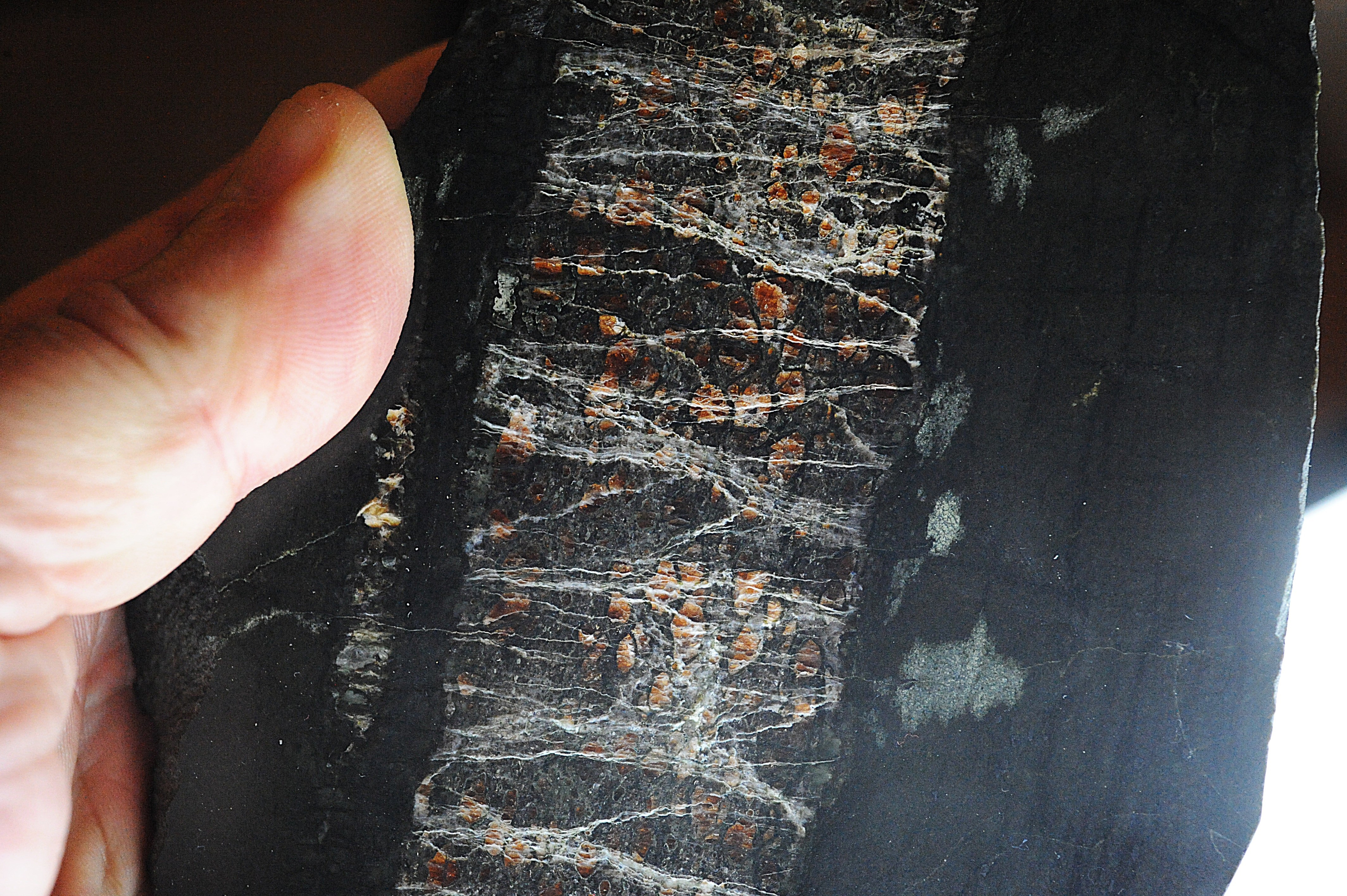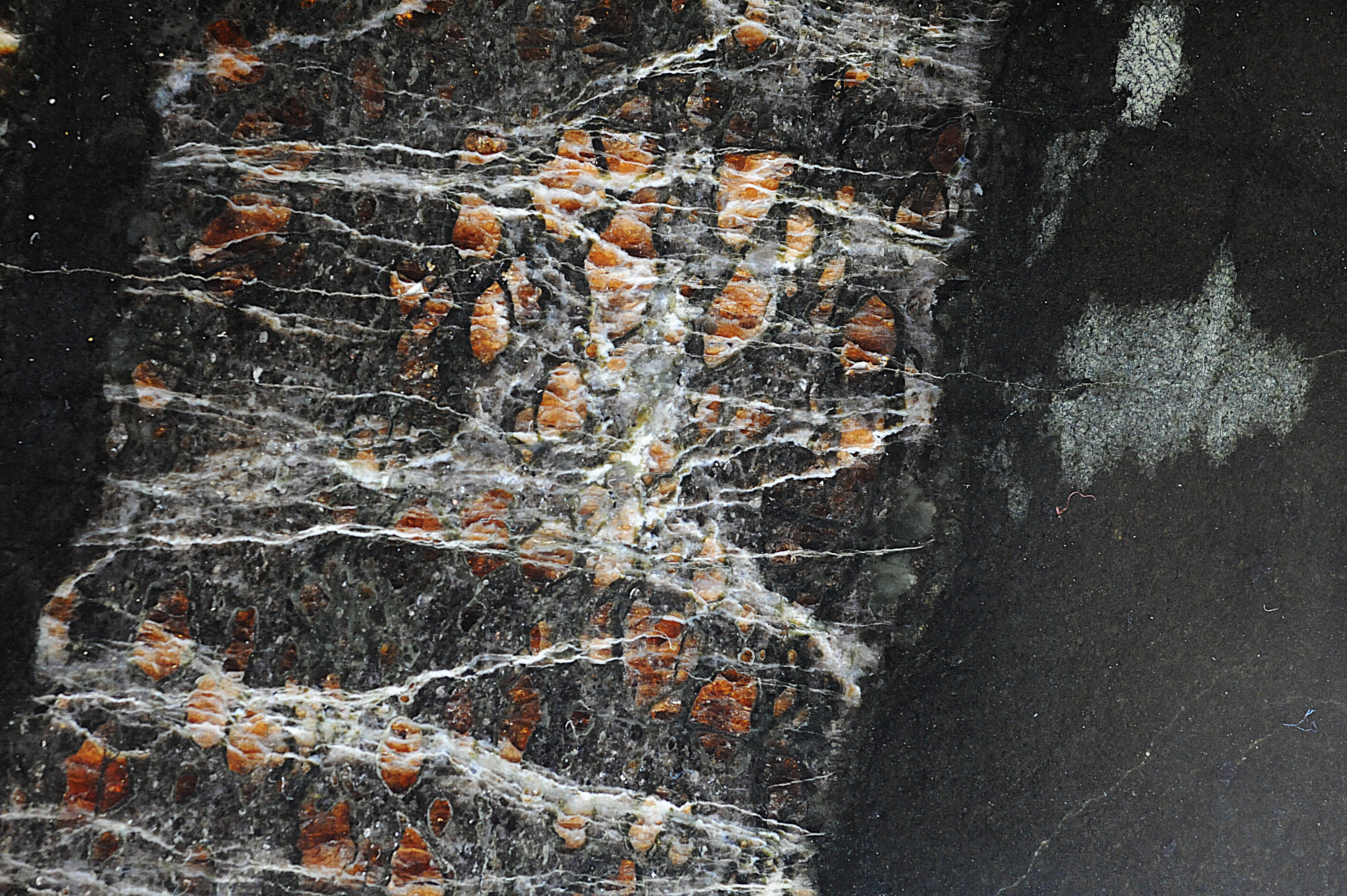 Cette pièce je l'ai acquise auprès d'un marchand, à la bourse de l'Arbresles (69) l'an dernier. Ce marchand n'a pas été en mesure de me fournir une étiquette indiquant la nature ou la provenance de l'échantillon qu'il m'a vendu. Je l'ai trouvé tellement beau que j'ai quand même craqué et le lui ai acheté, en me disant qu'un fasciès aussi typique serait facile à identifier... Que né-ni ! Je sèche lamentablement, en ce qui concerne l'identification de la pièce. J'ai d'abord pensé que j'étais en présence d'une amphibolite à grenats... Au regard de la roche qui encadre la veine rouge en position centrale de la pièce, j'ai ensuite considéré qu'il pouvait s'agir d'une péridotite serpentinisée... Ça ne colle pas non plus... Une association de granulite, méta-granulite et péridotite à grenats ? La veine elle-même peut-elle être considérée comme pouvant être de la grenatite, roche métamorphique formée à haute pression et haute température de la famille des Rodingites ?